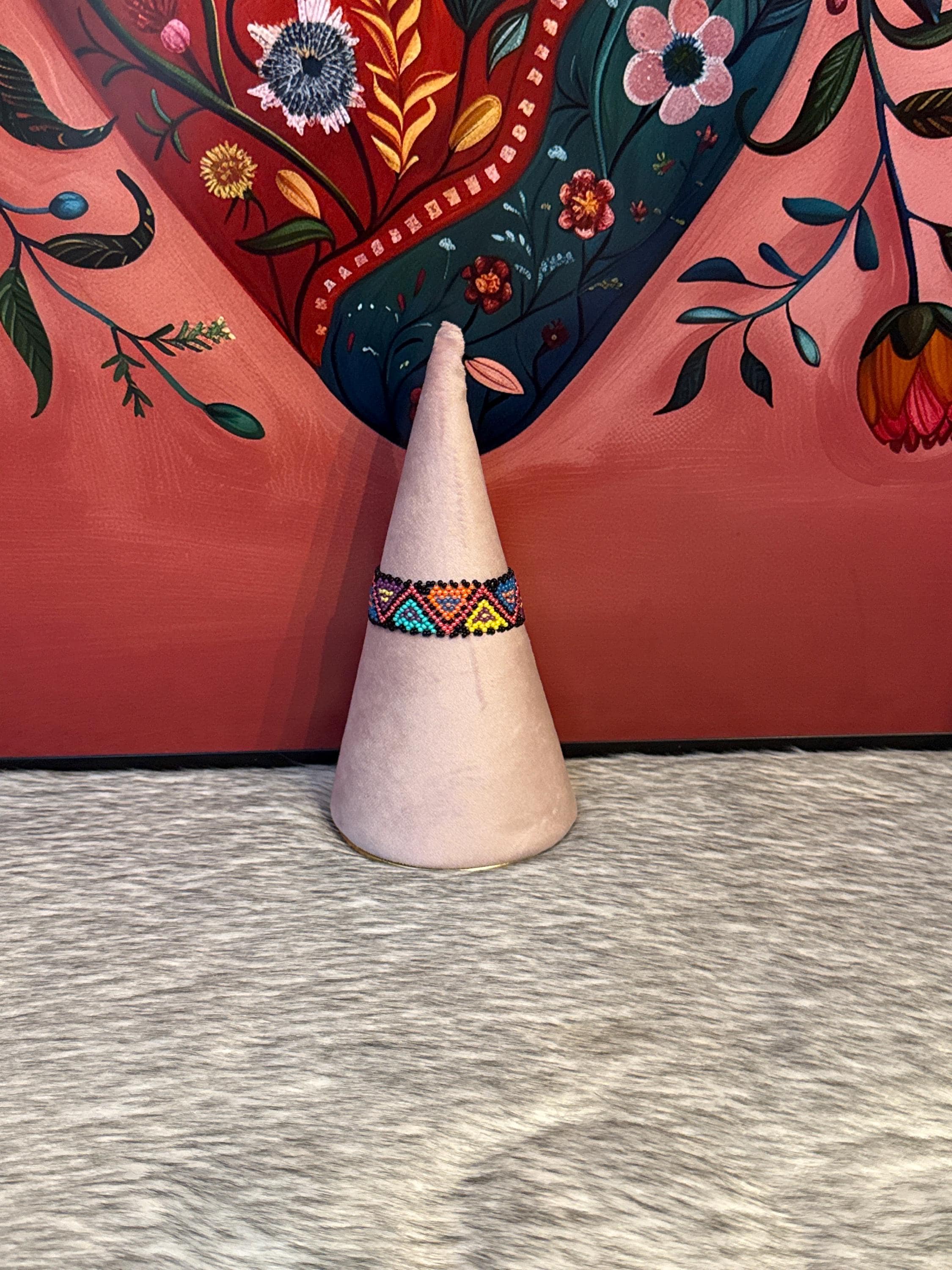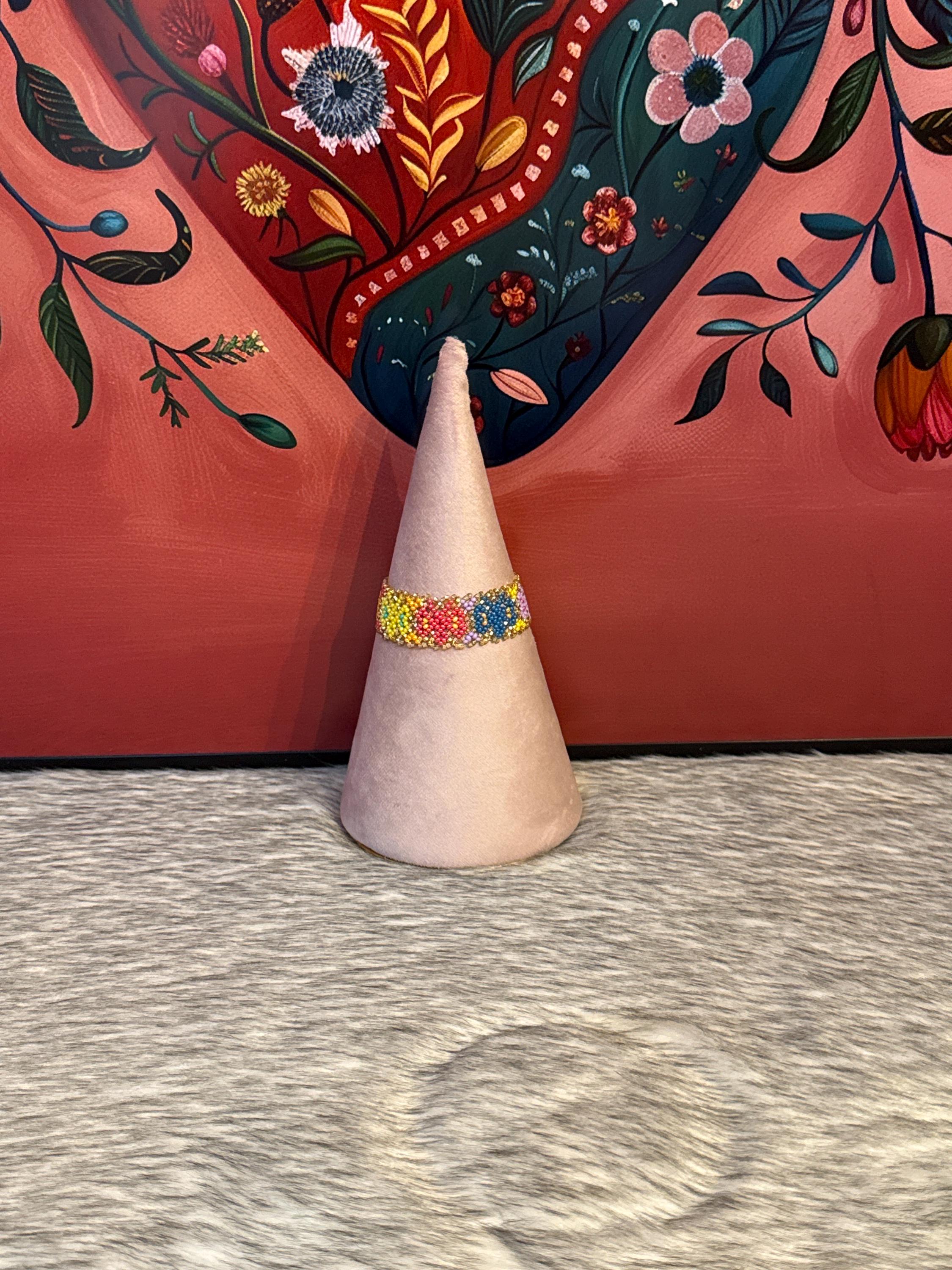 Handmade artisan bracelets made with glass beads called chaquiras, the bracelets measure approximately 7 inches long by 1 inch wide.