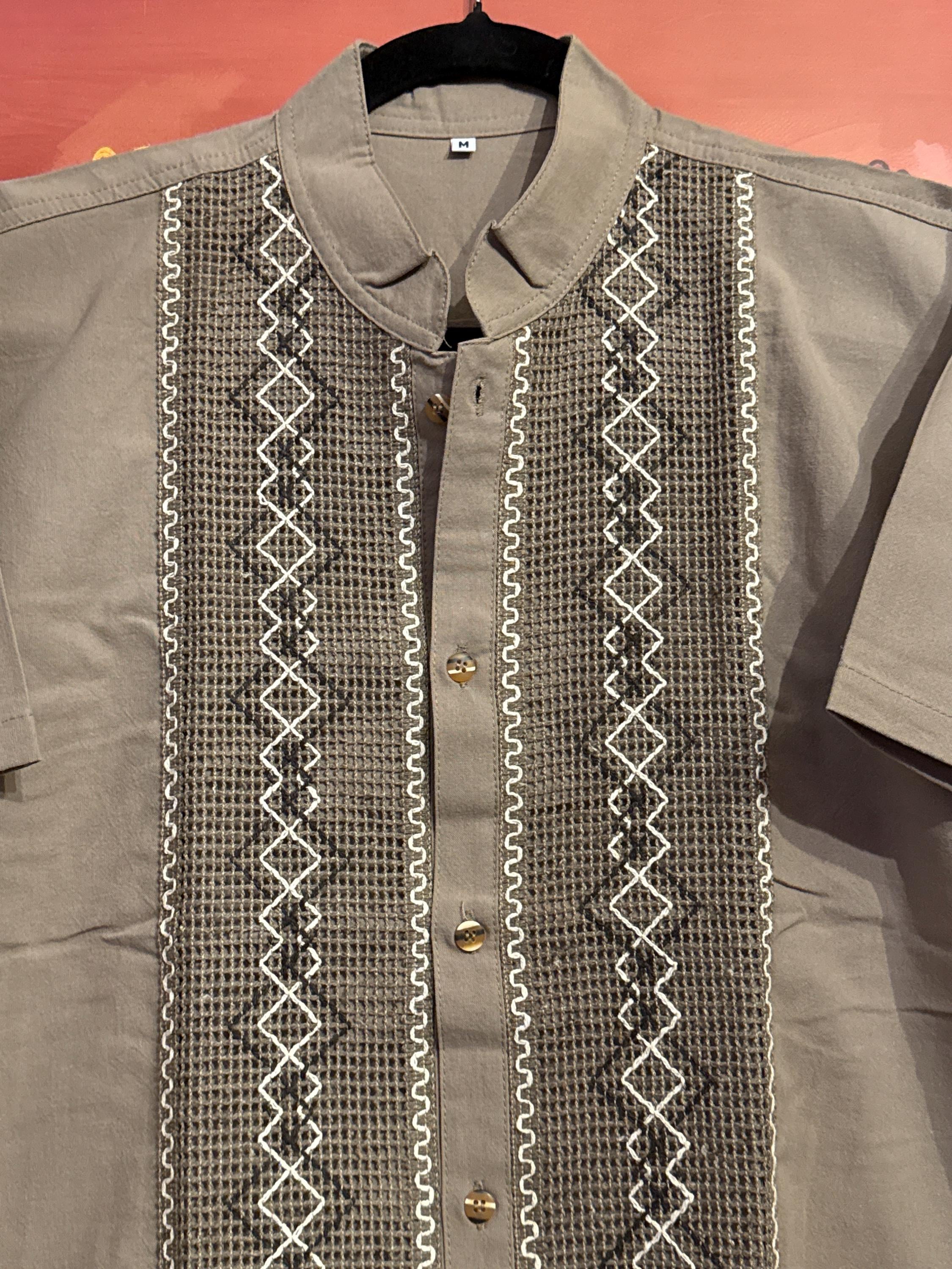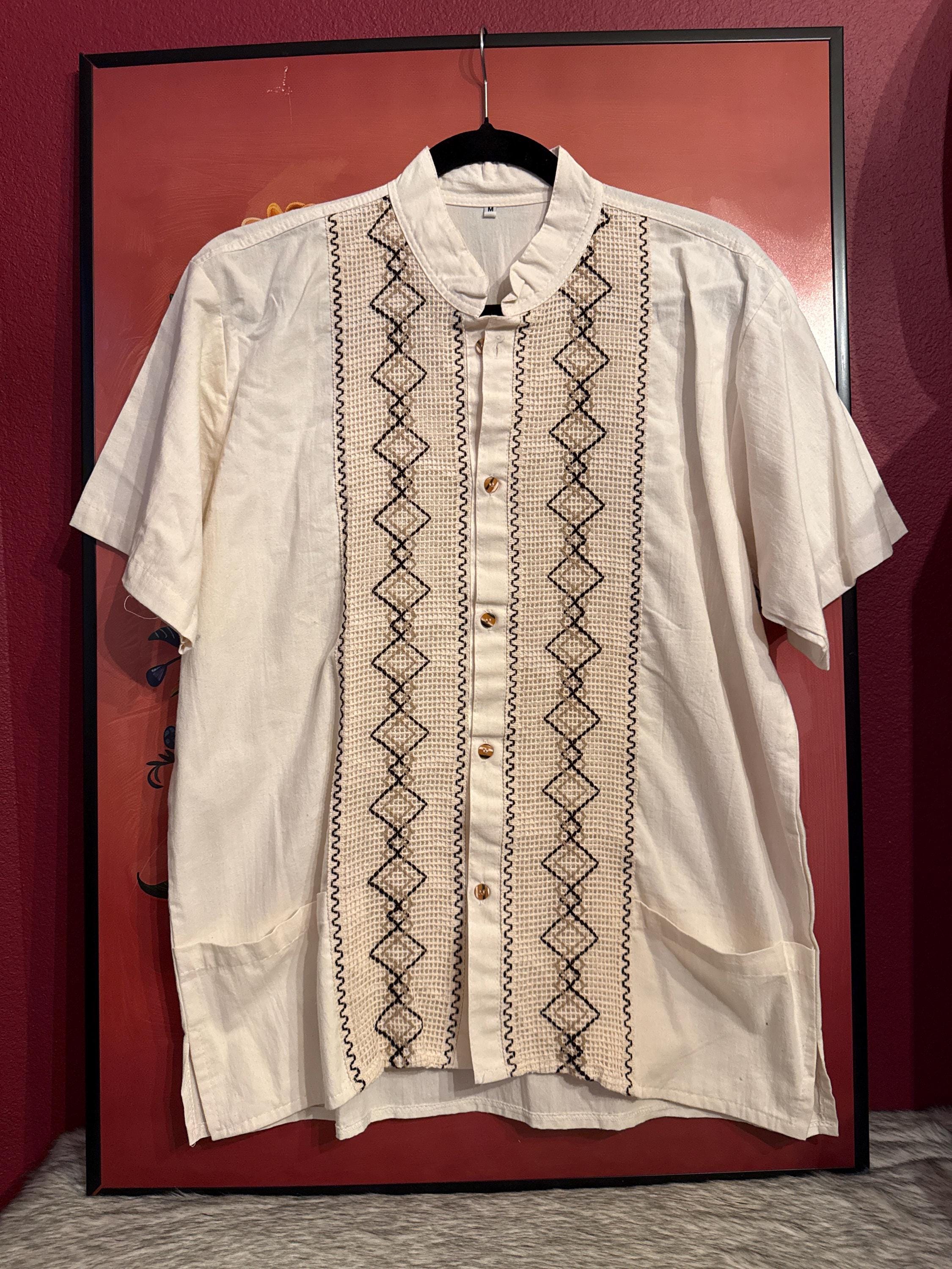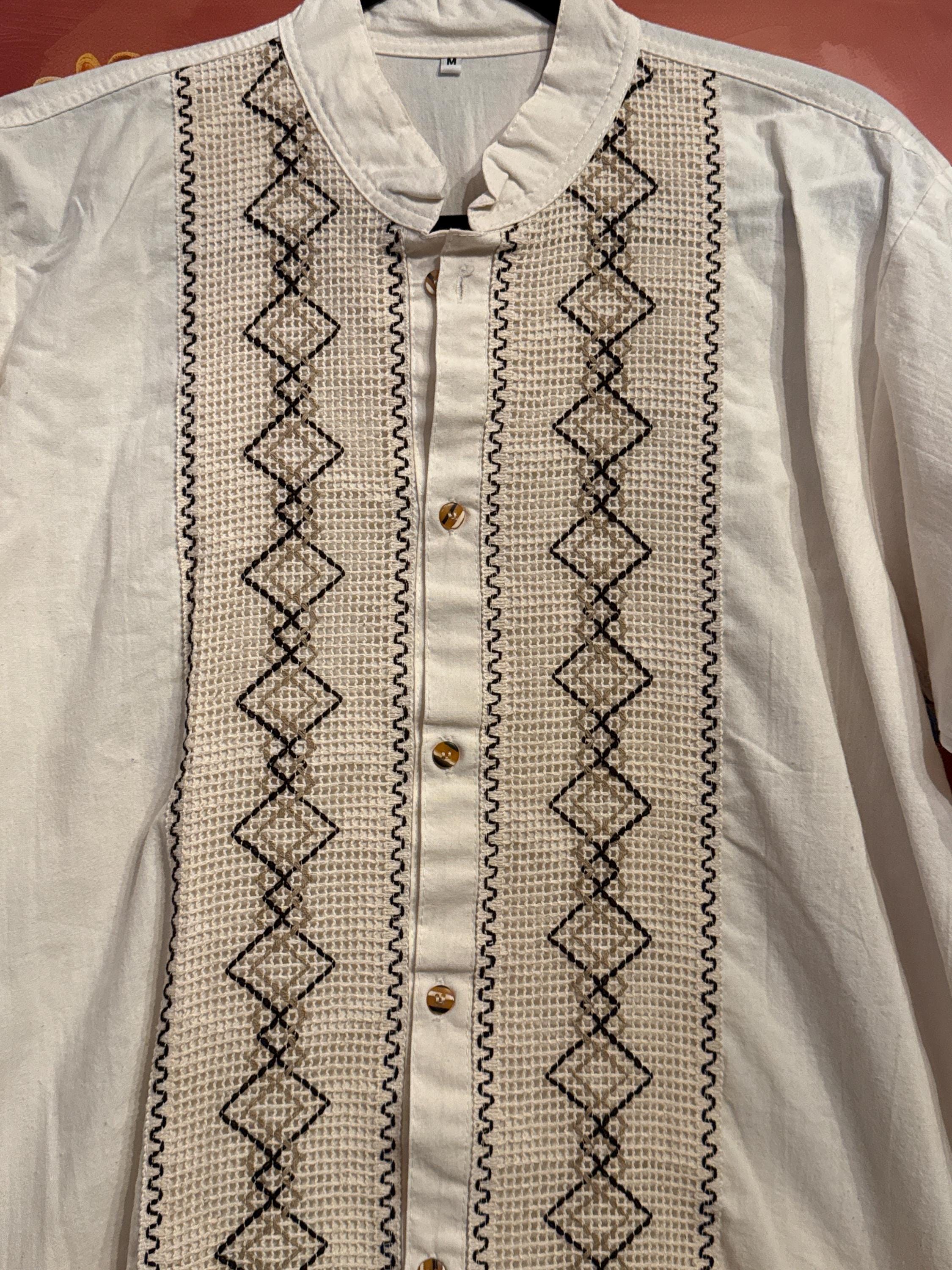 Mexican artisan shirt, guayabera style, handmade with cotton and linen fabric with embroidered patterns, medium size.