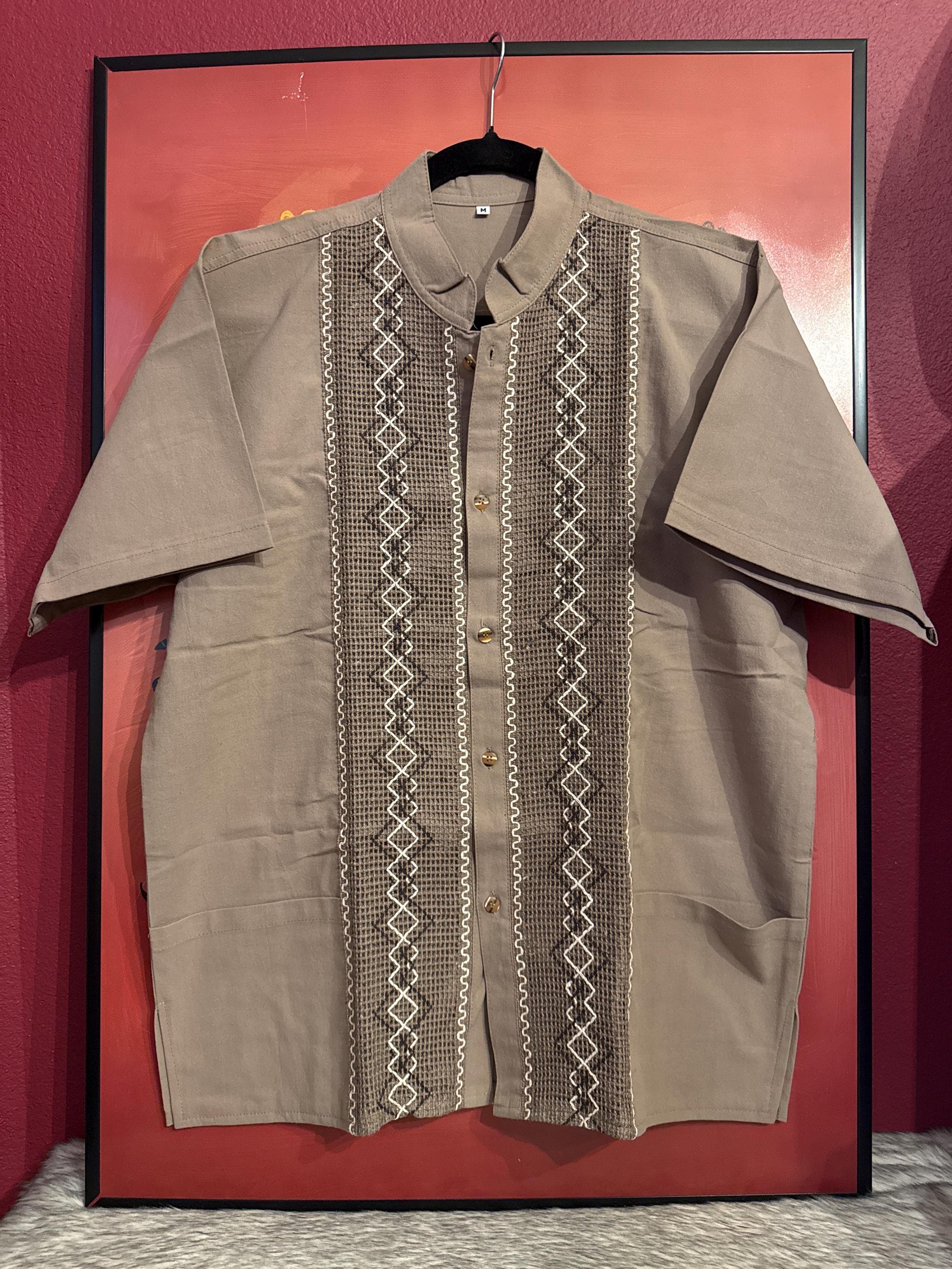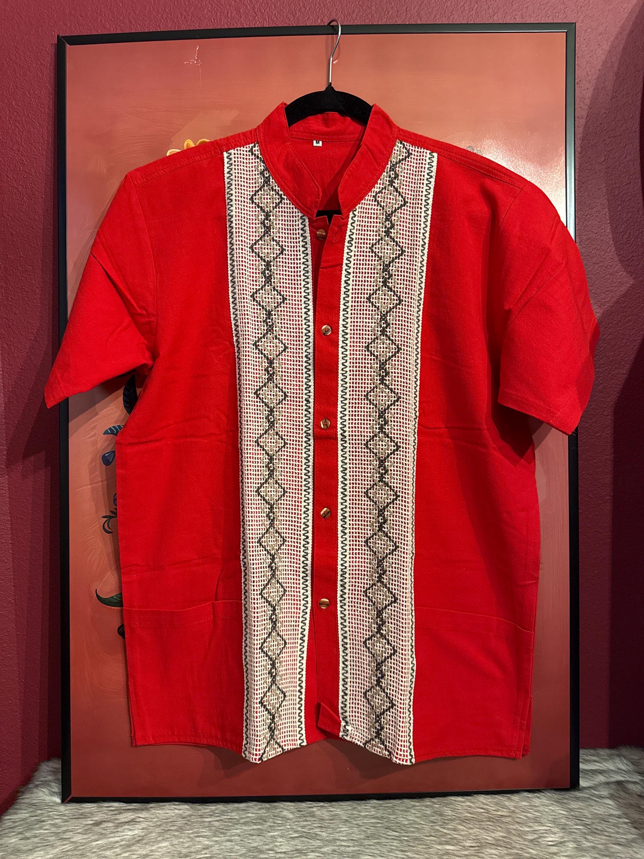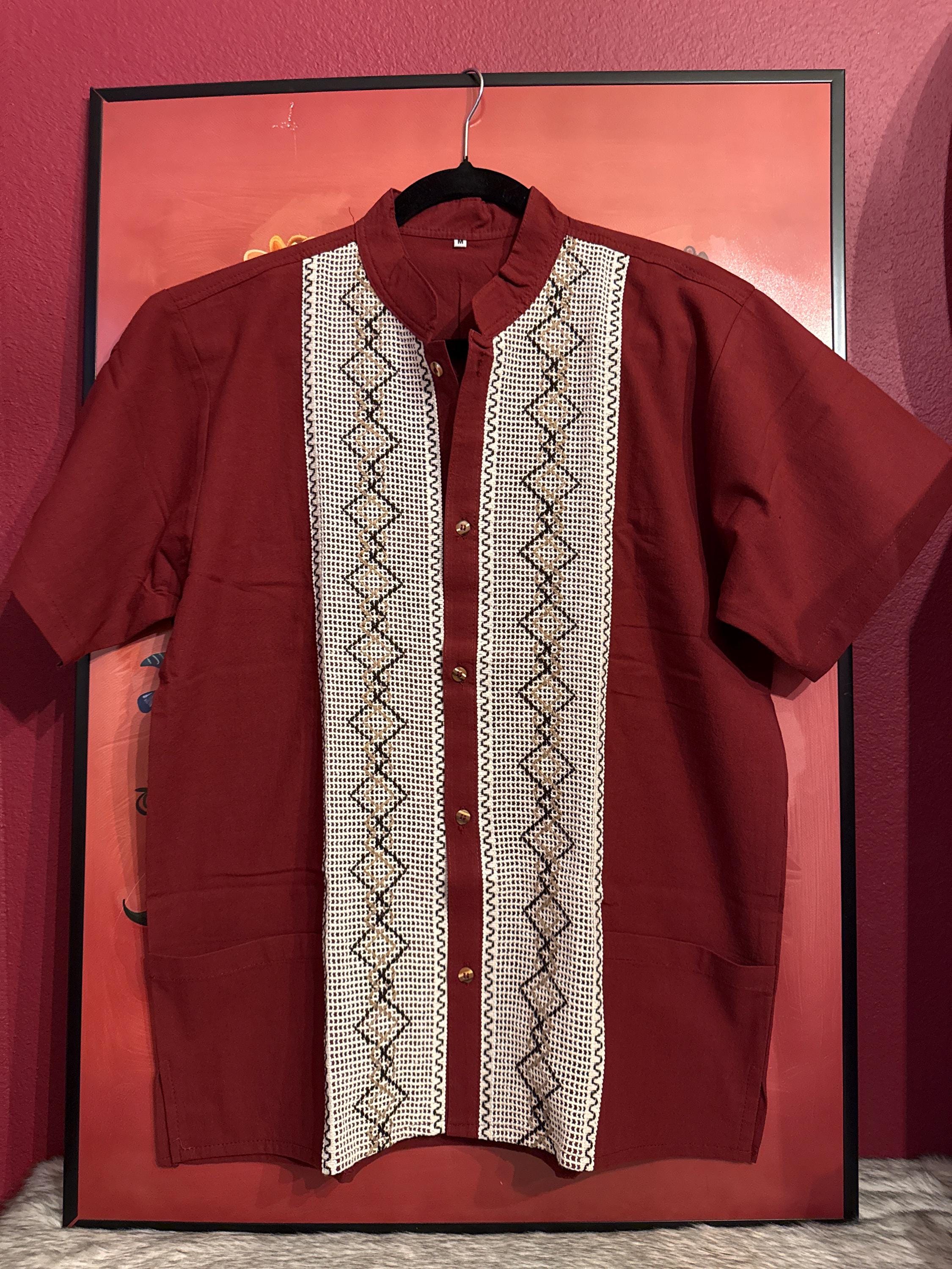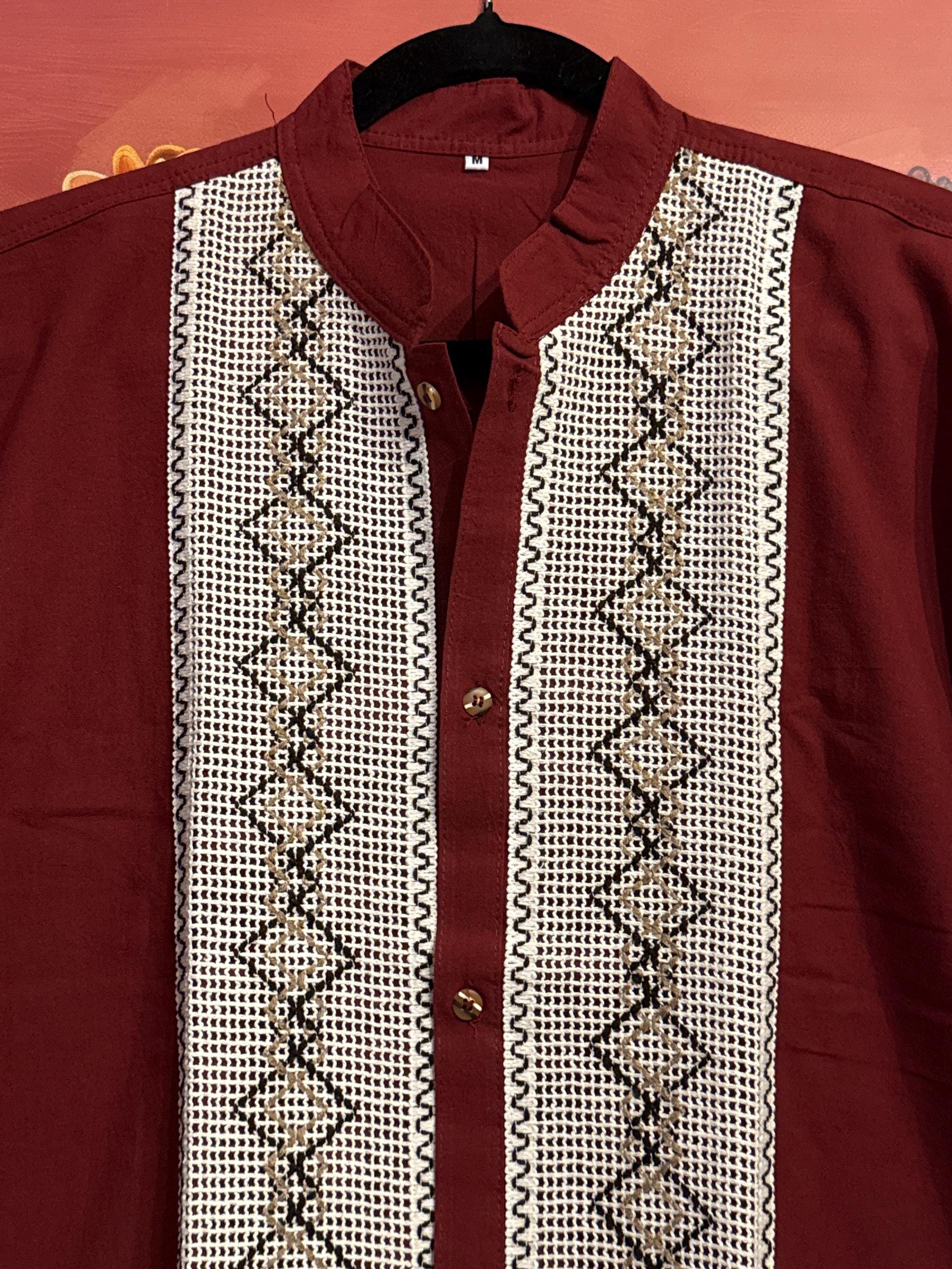 Mexican artisan shirt, guayabera style, handmade with cotton and linen fabric with embroidered patterns, medium size.