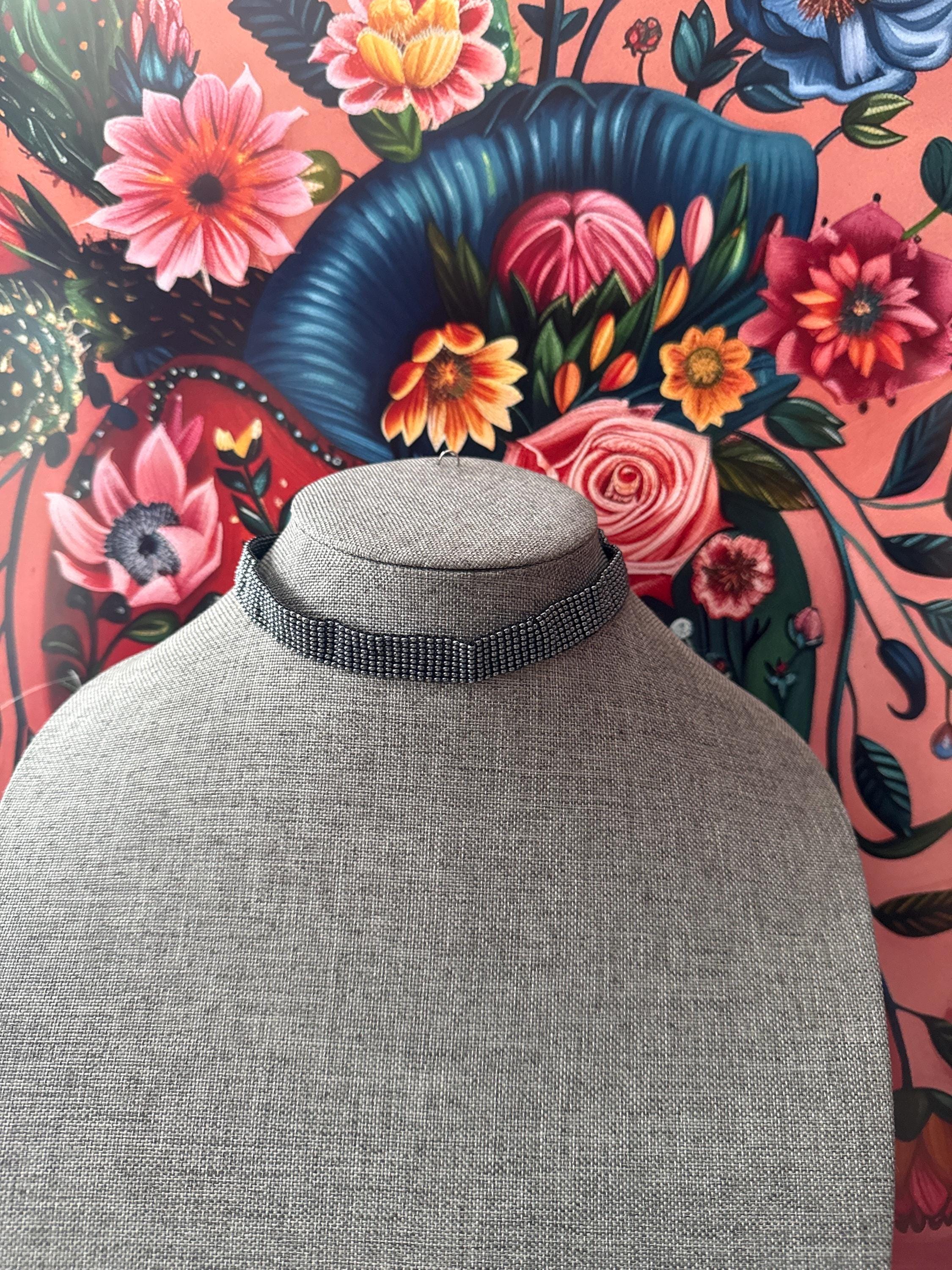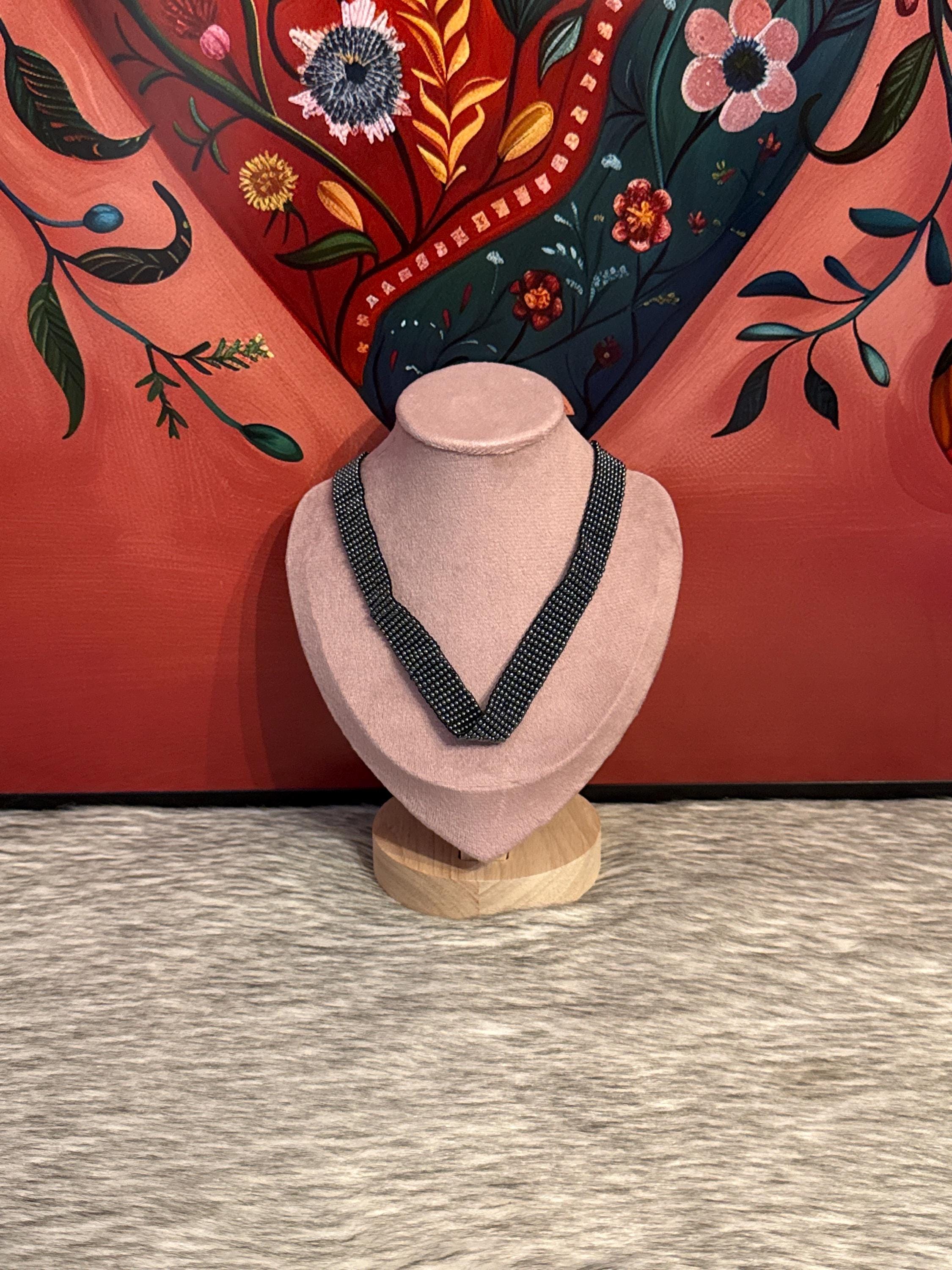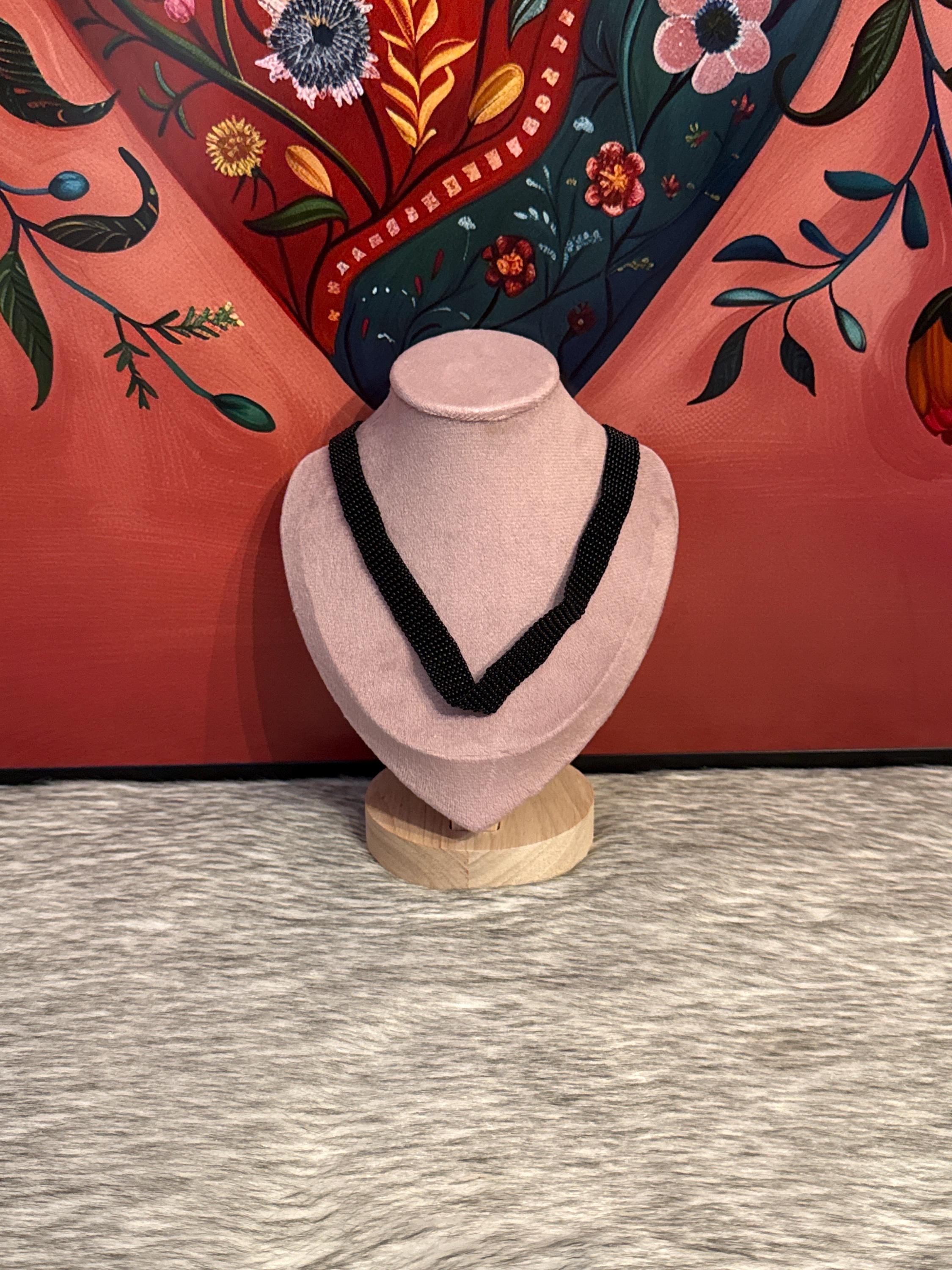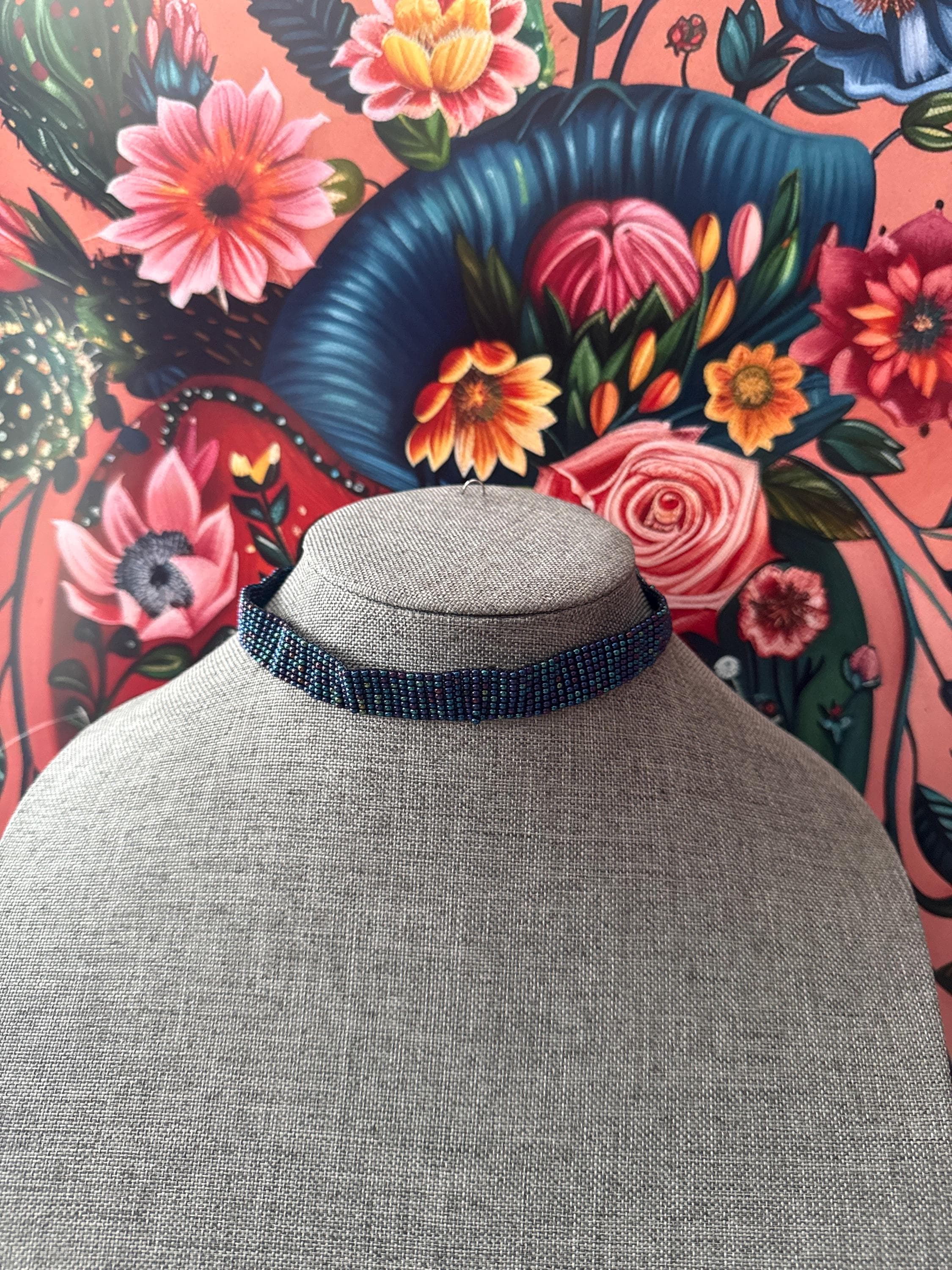 Beautiful handmade jewelry set that includes a choker, earrings, and bracelet, handmade with glass beads.