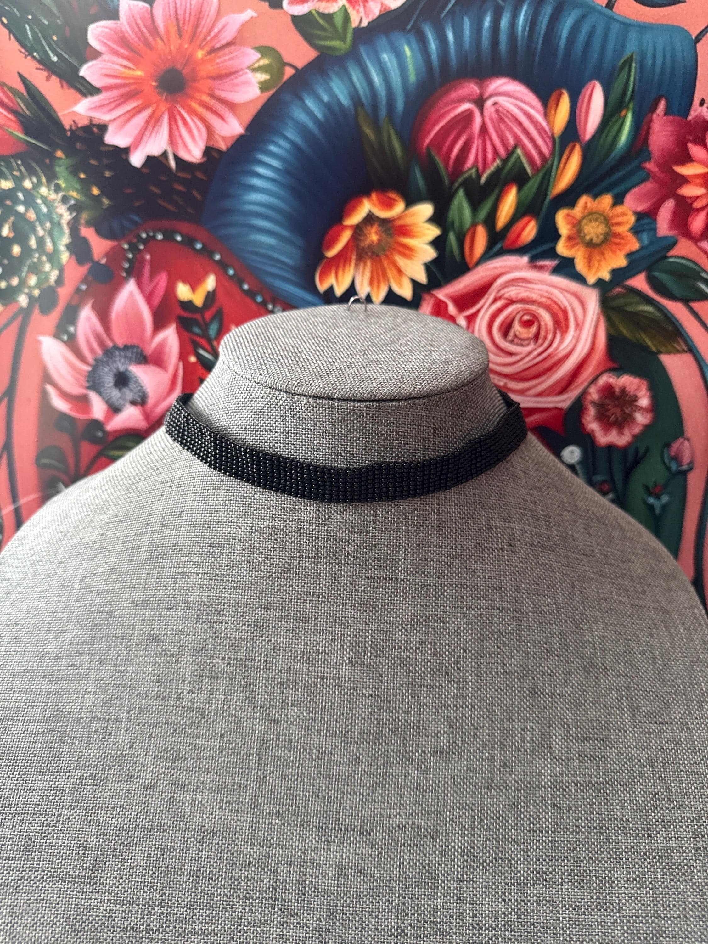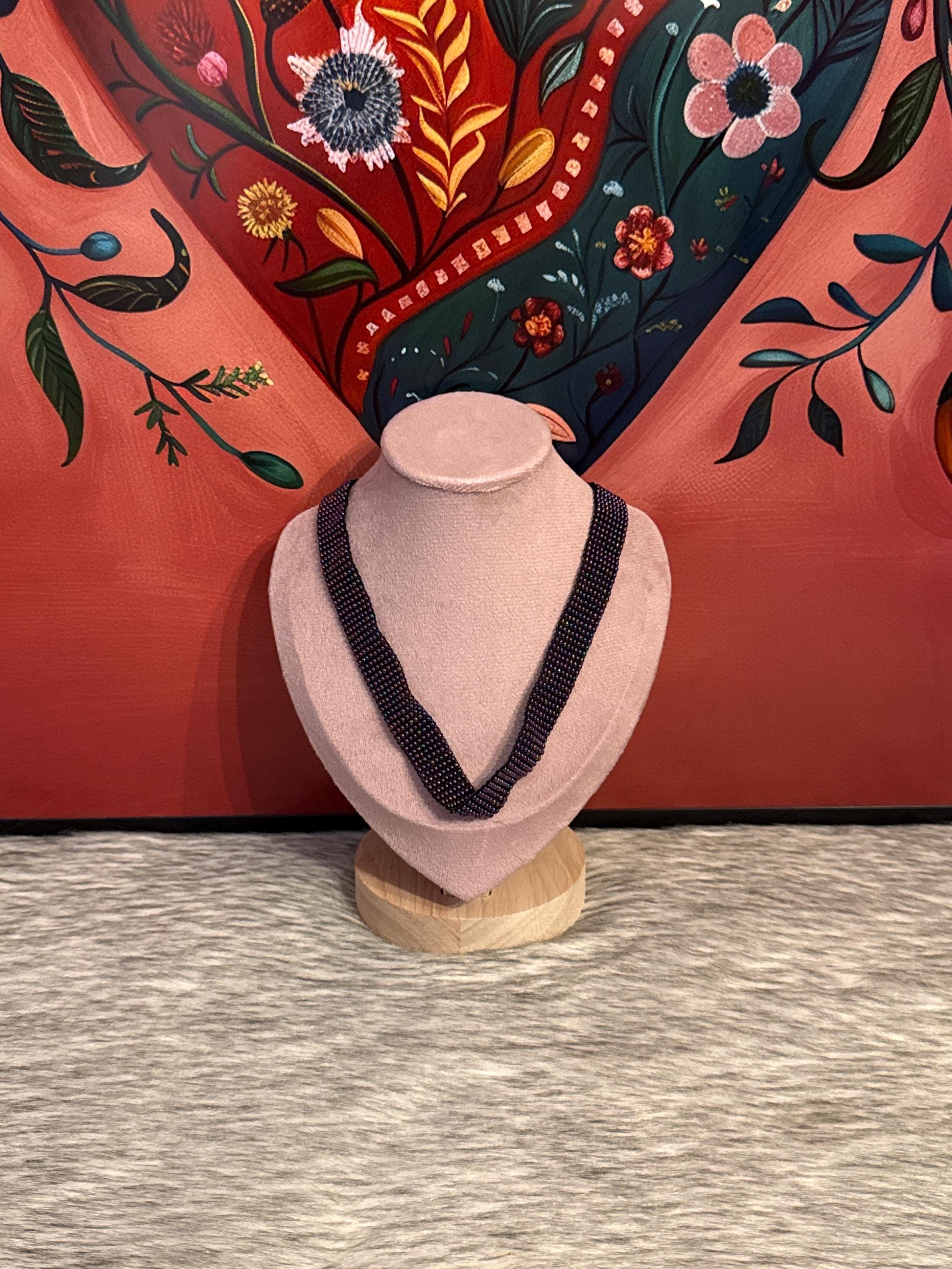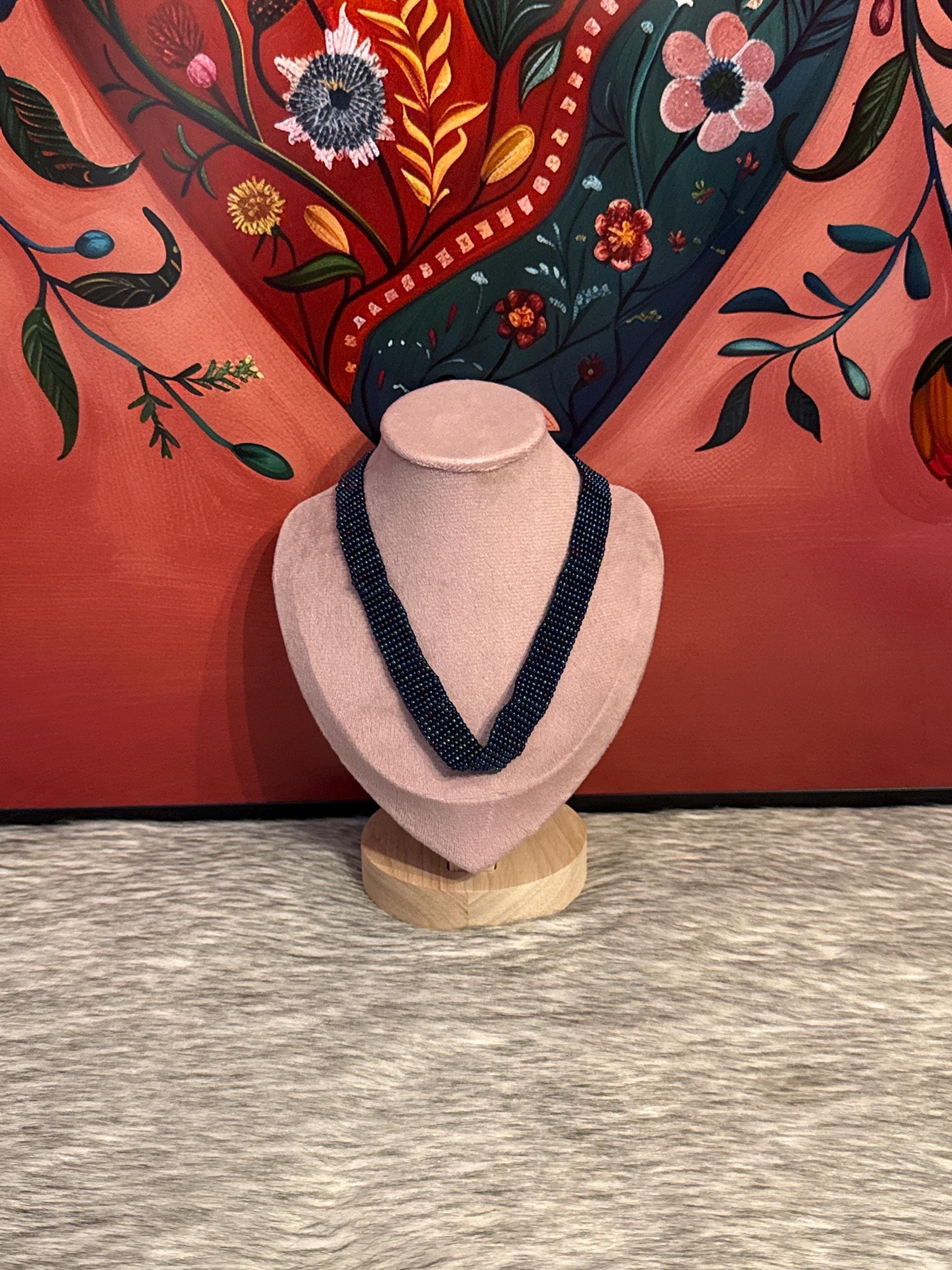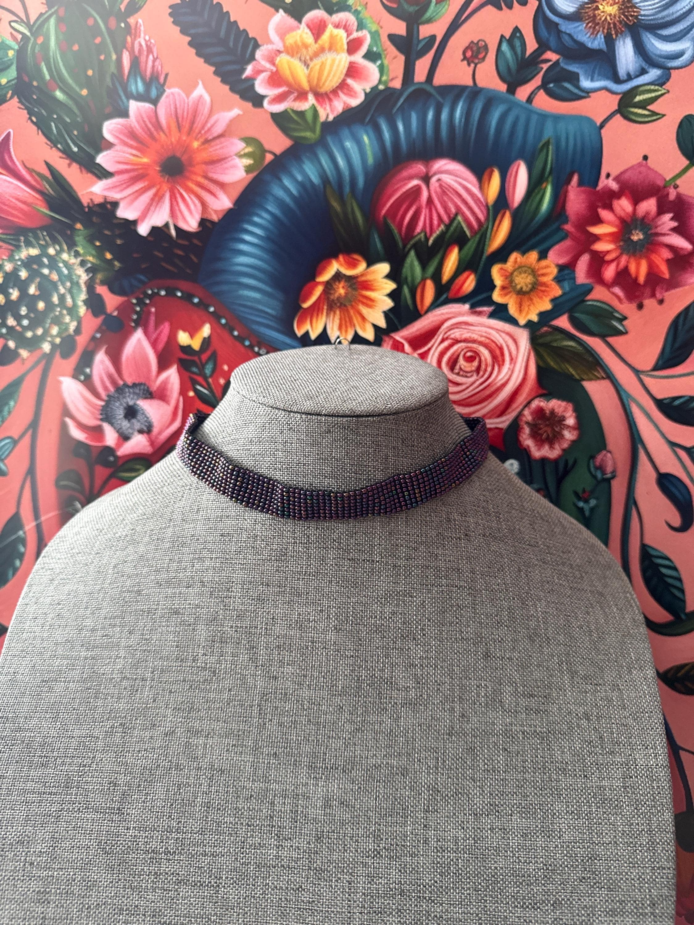 Beautiful handmade jewelry set that includes a choker, earrings, and bracelet, handmade with glass beads.