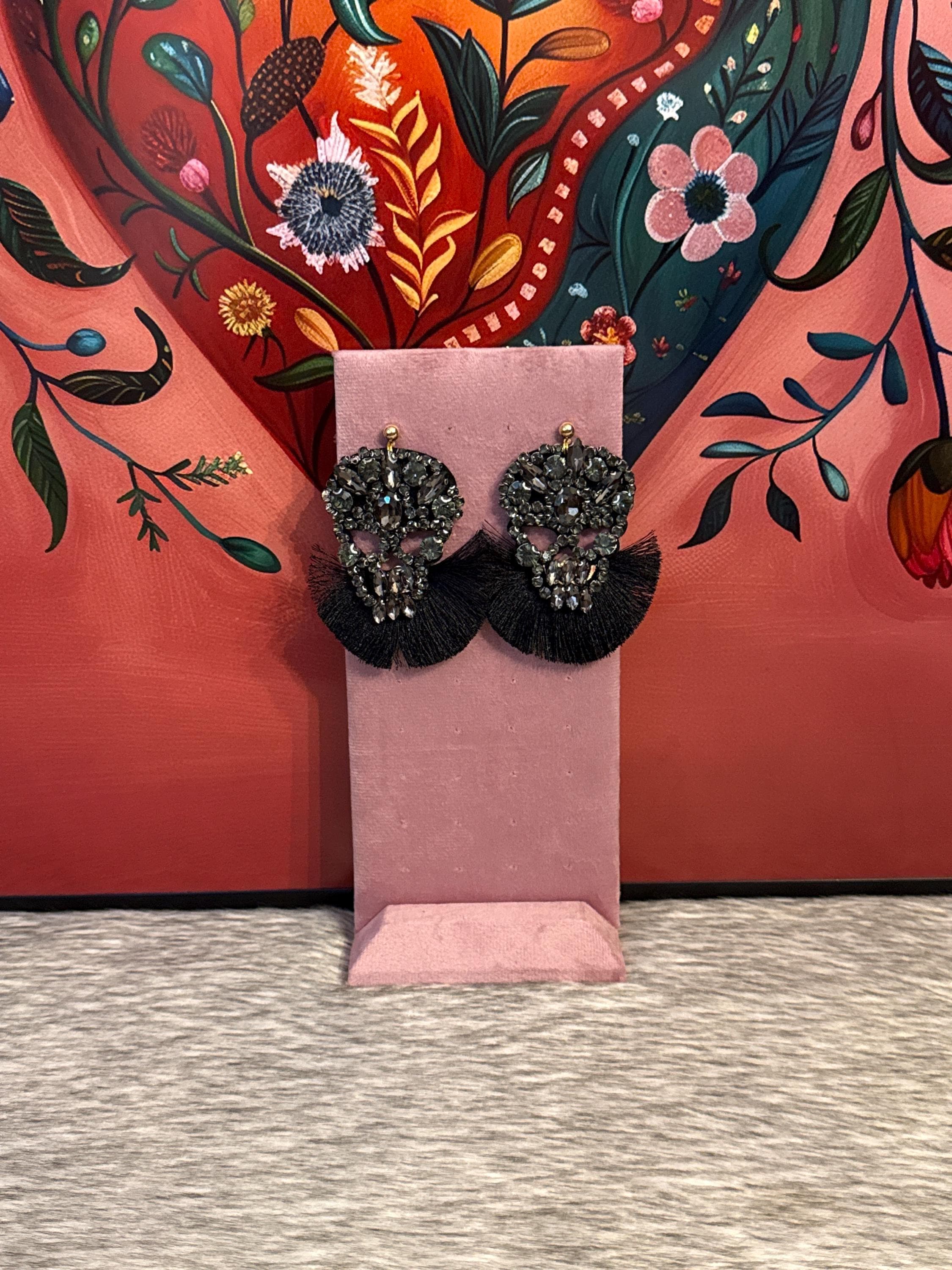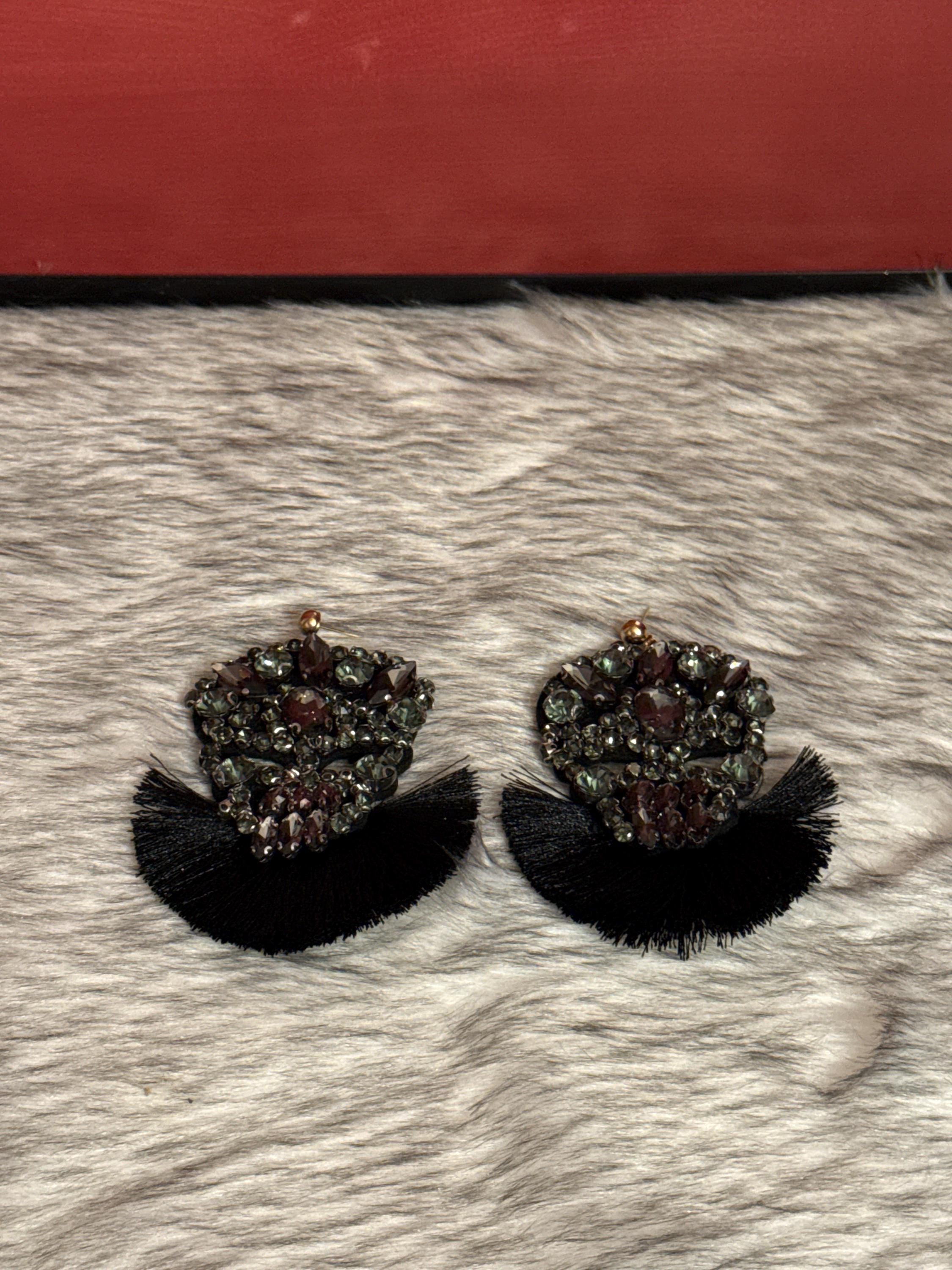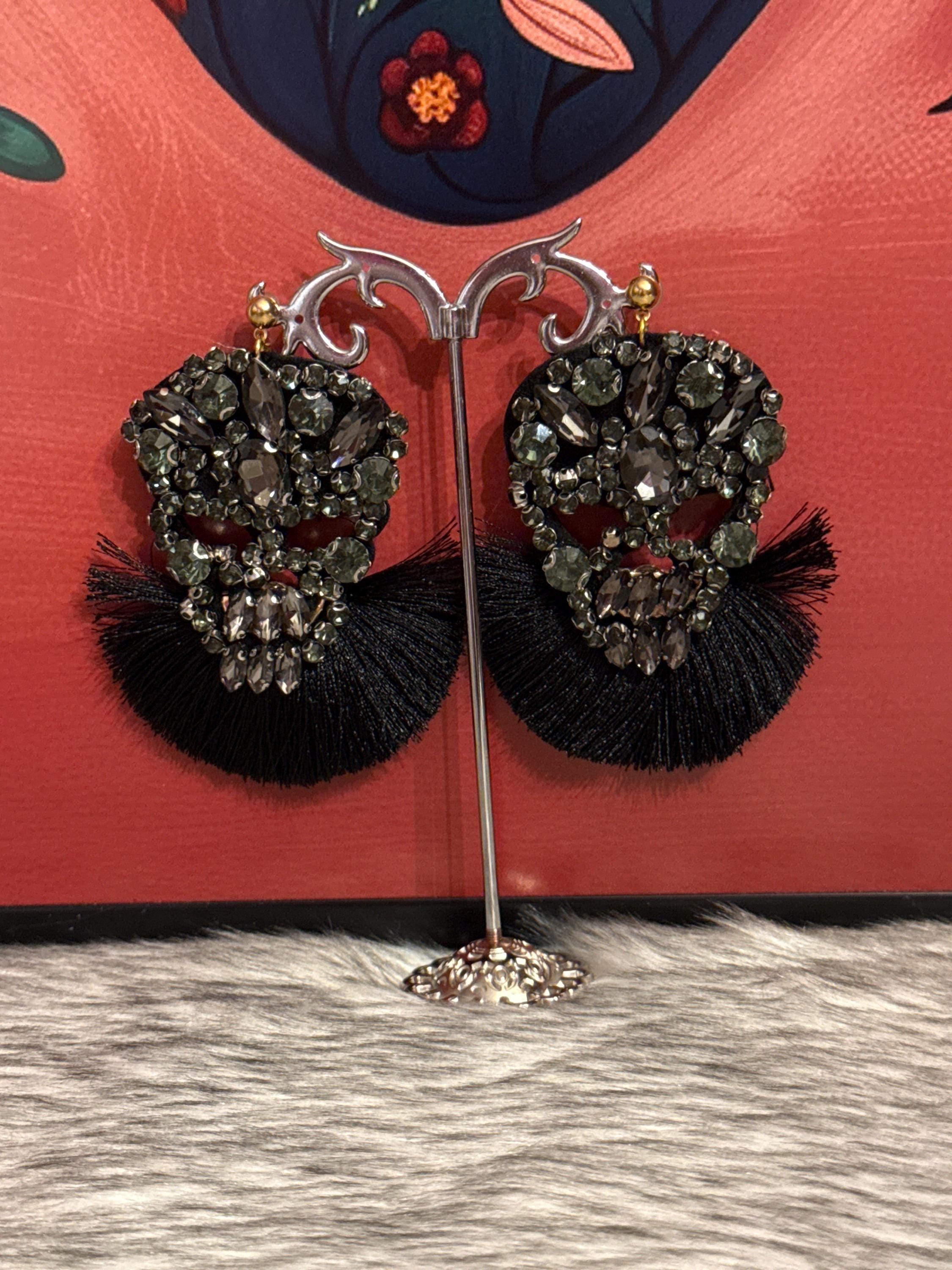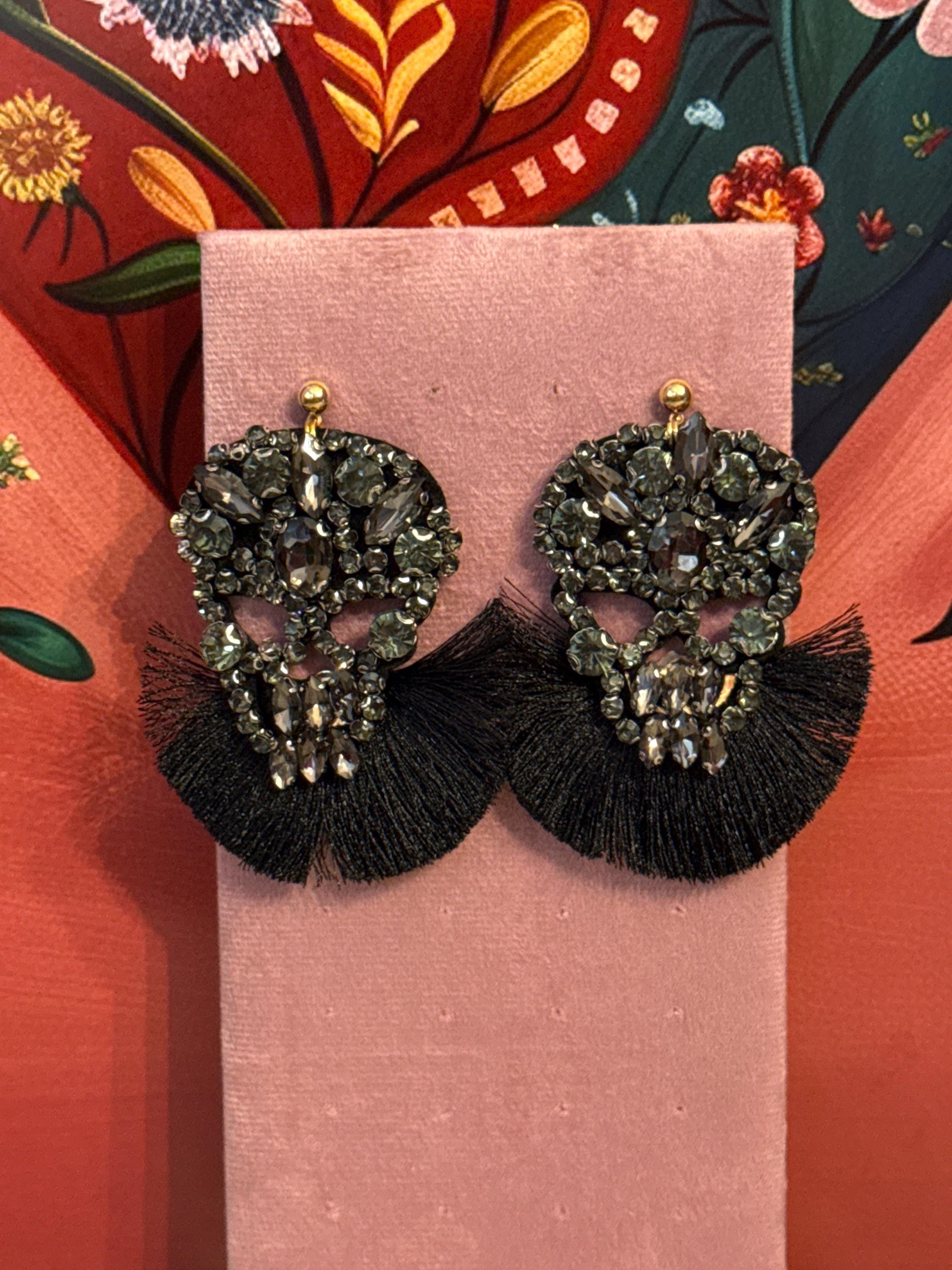 Beautiful handmade artisan earrings crafted with crystals and silk thread tassels. The earrings measure approximately 3.5 inches long by 2 inches wide.