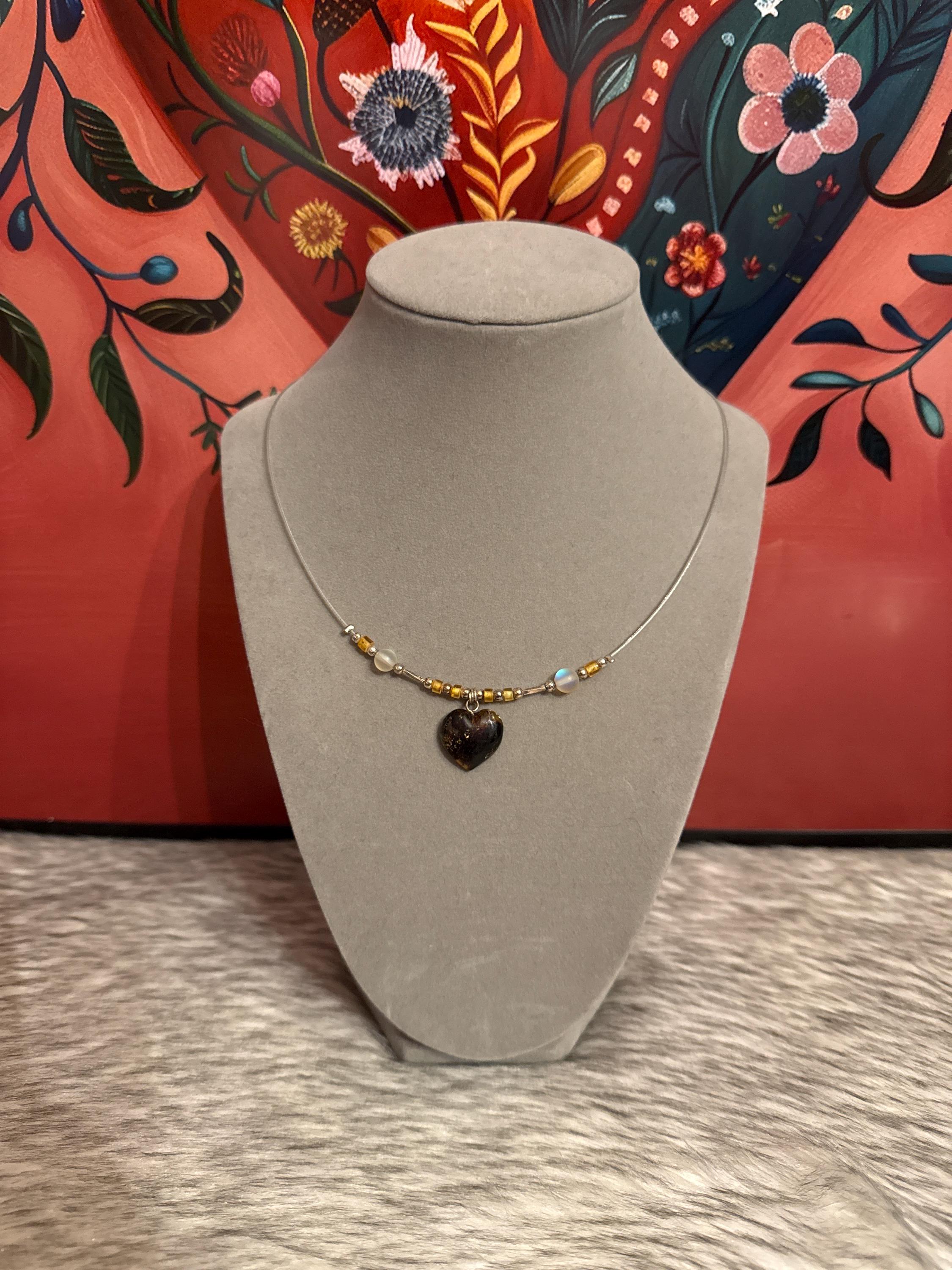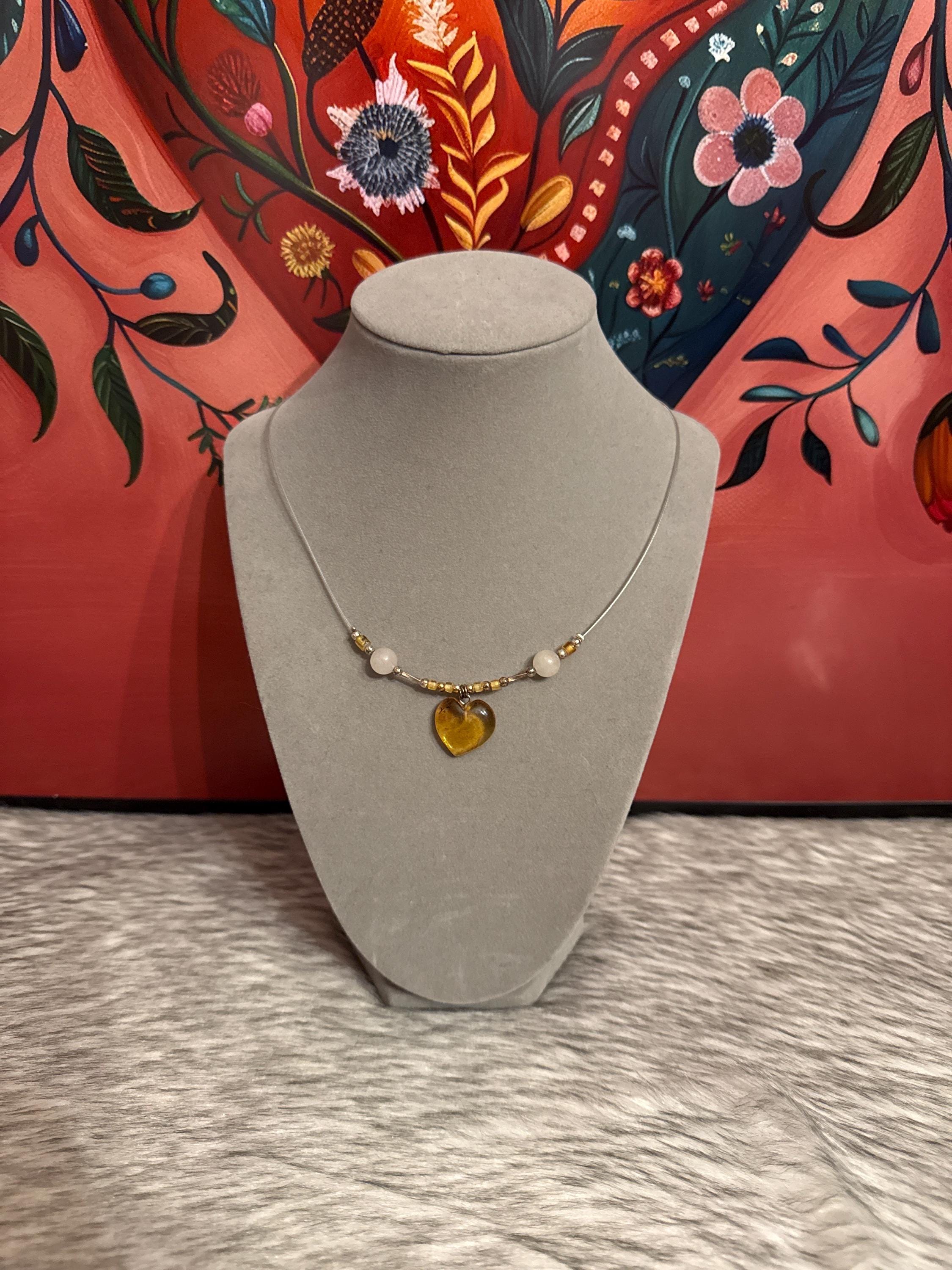 Beautiful necklace with silver thread, quartz beads and amber heart pendant, simply enjoy the simplicity that this jewel will give you.