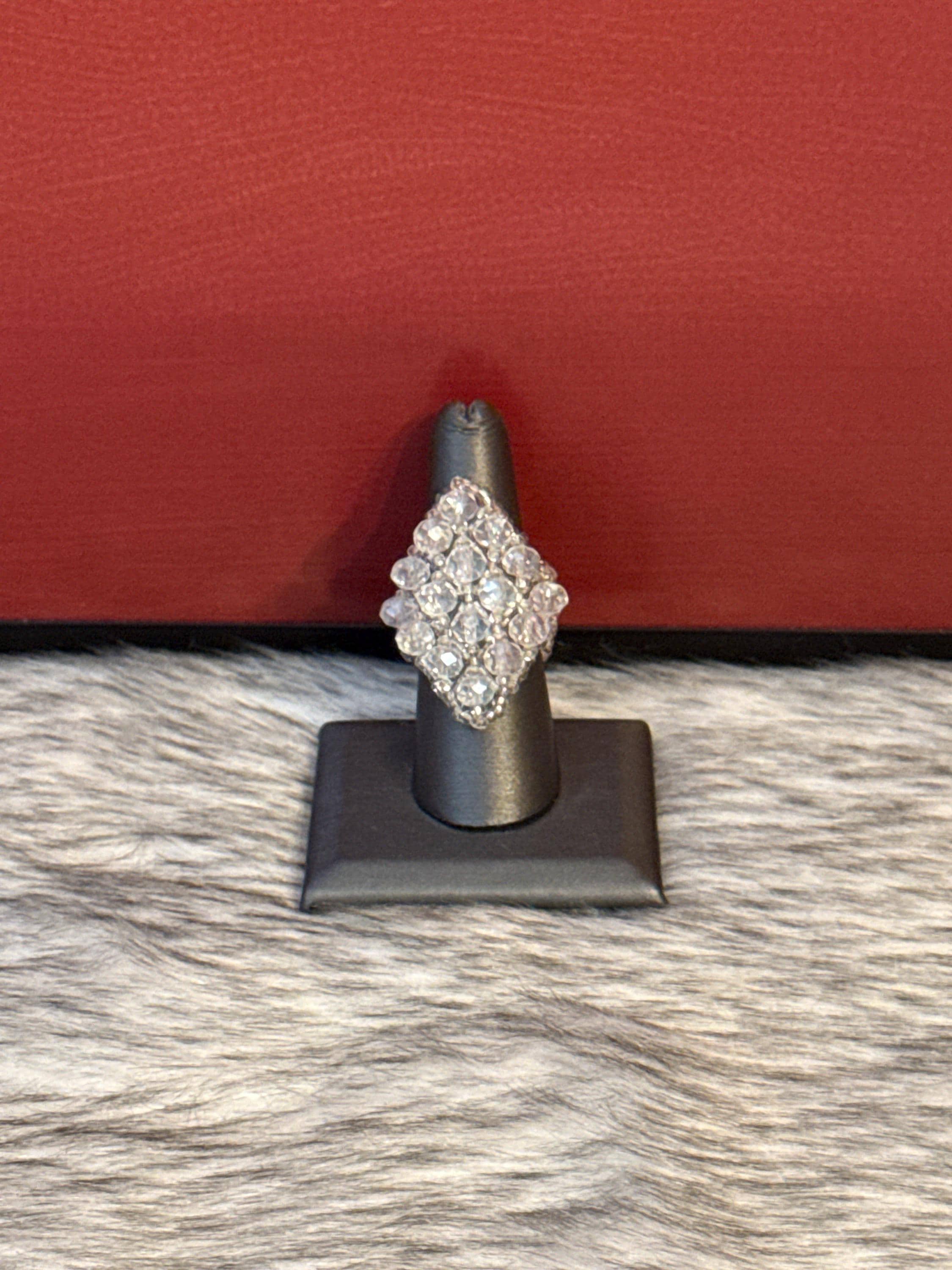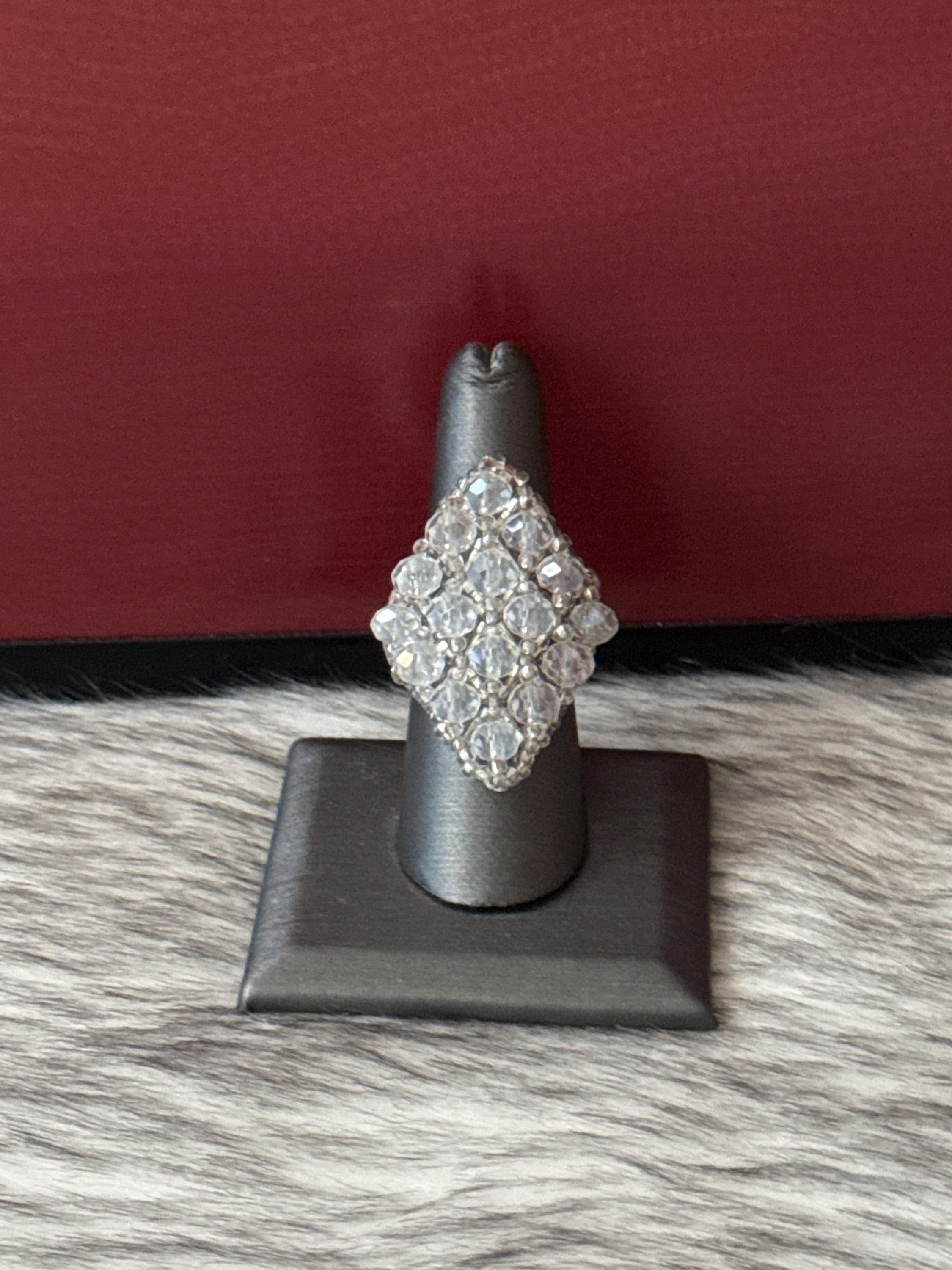 This ring fits most of the fingers on my right and left hand. These fingers range in size from 8 1/2 to 9 and the ring is not too loose or too tight. It is sparkly and usual in shape and design. It seems to change color based upon the lighting.