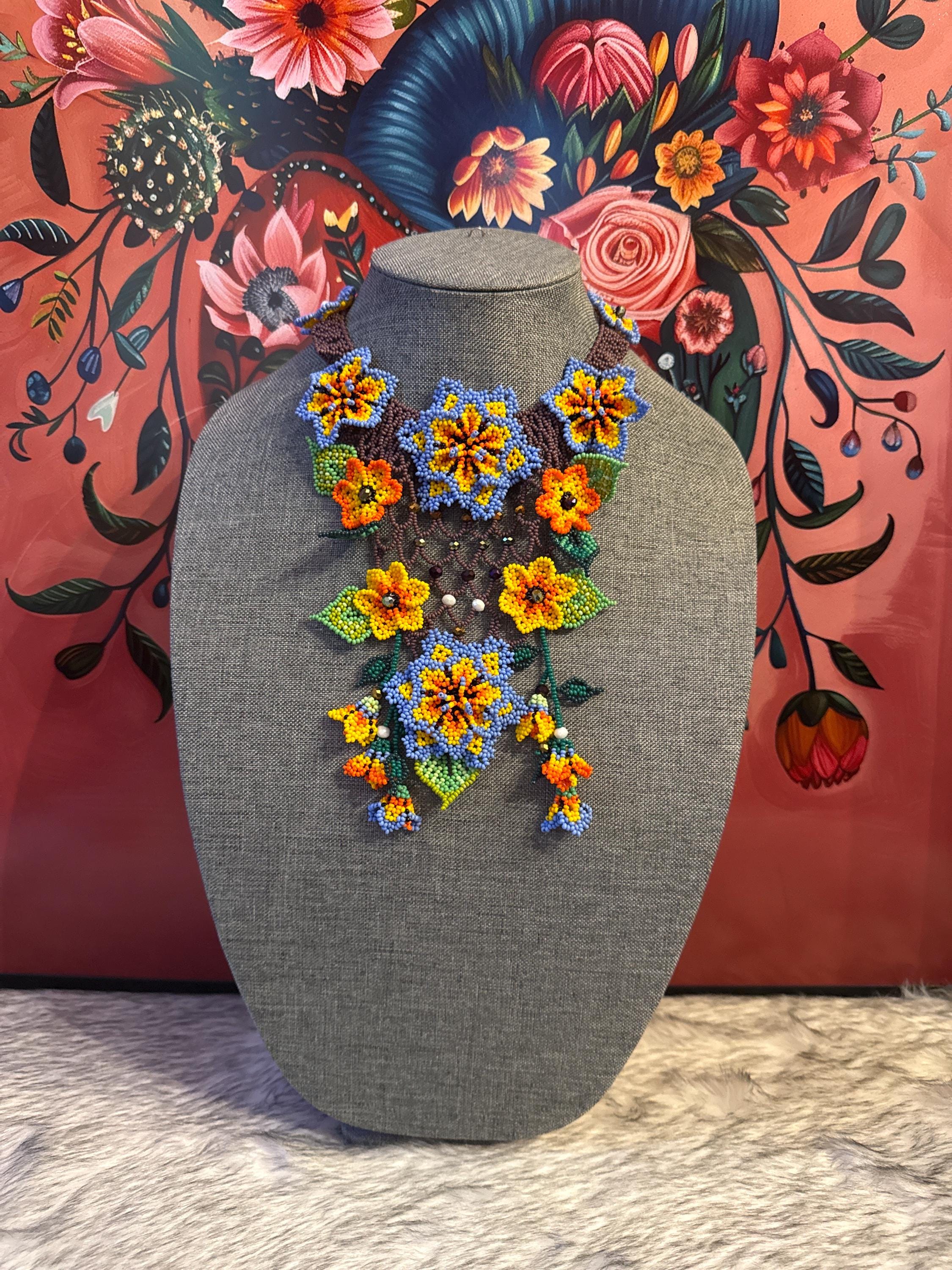 Beautiful Mayan-style necklace set, including earrings and a bracelet, handmade with glass beads and bugles.