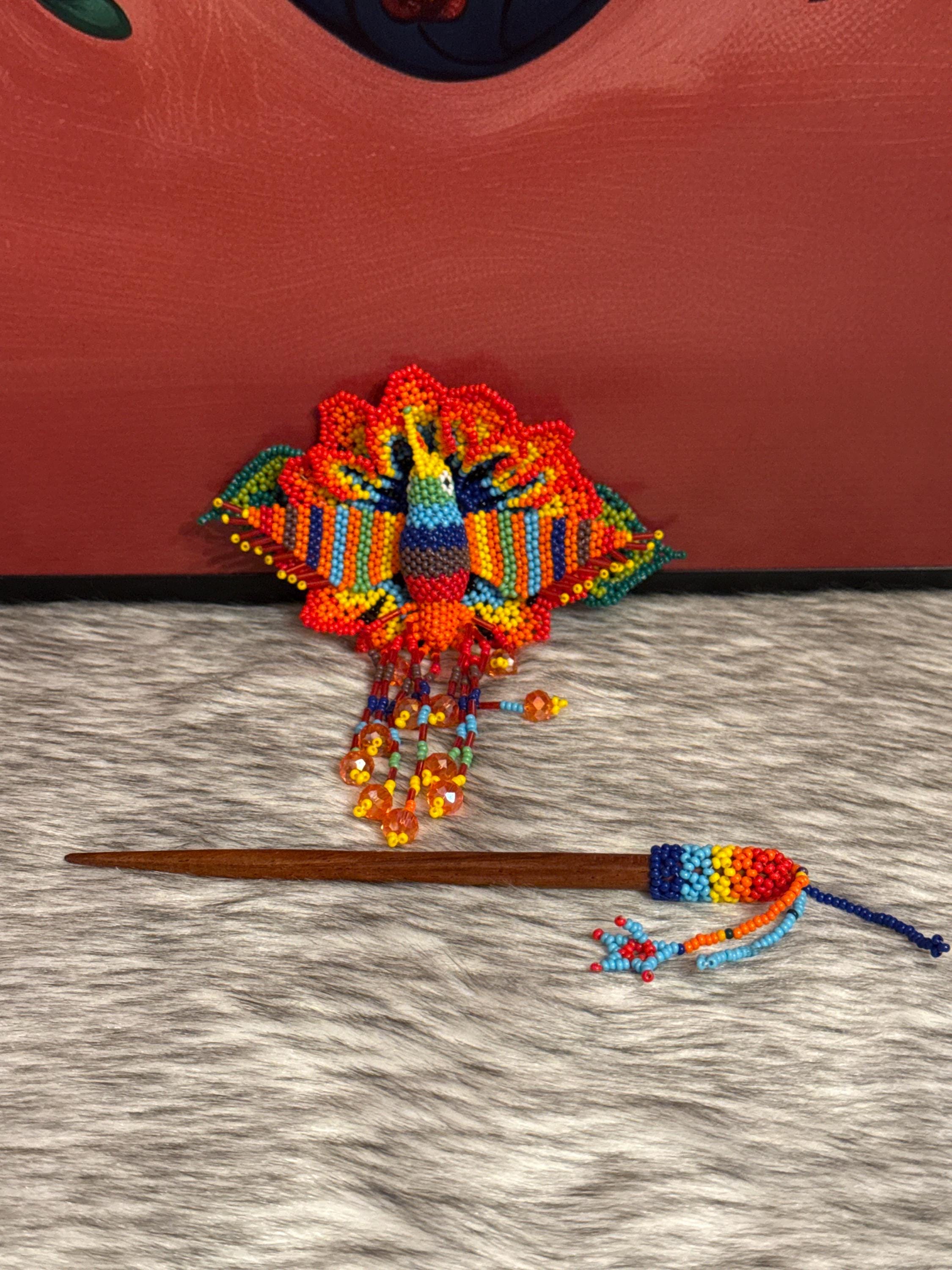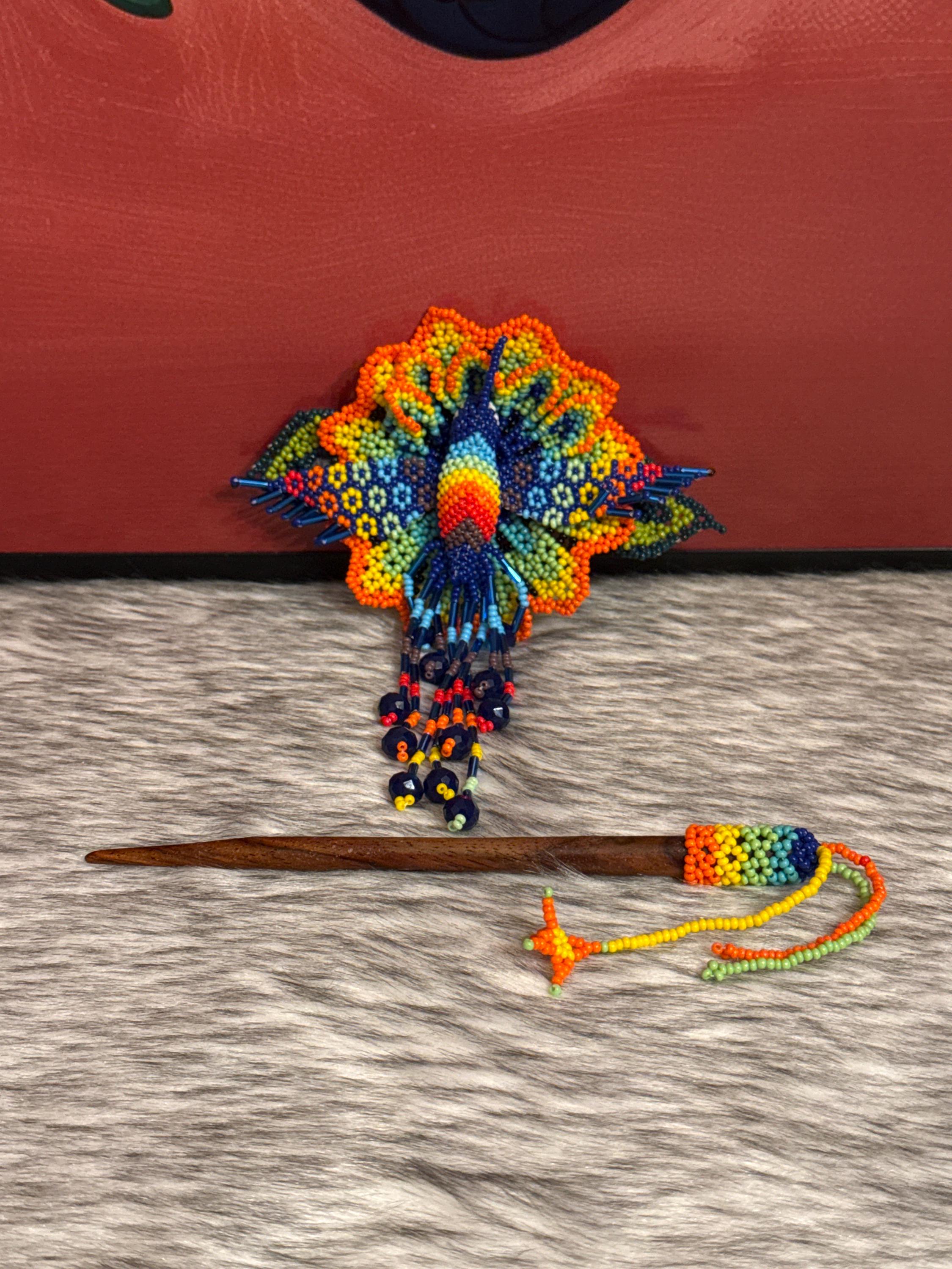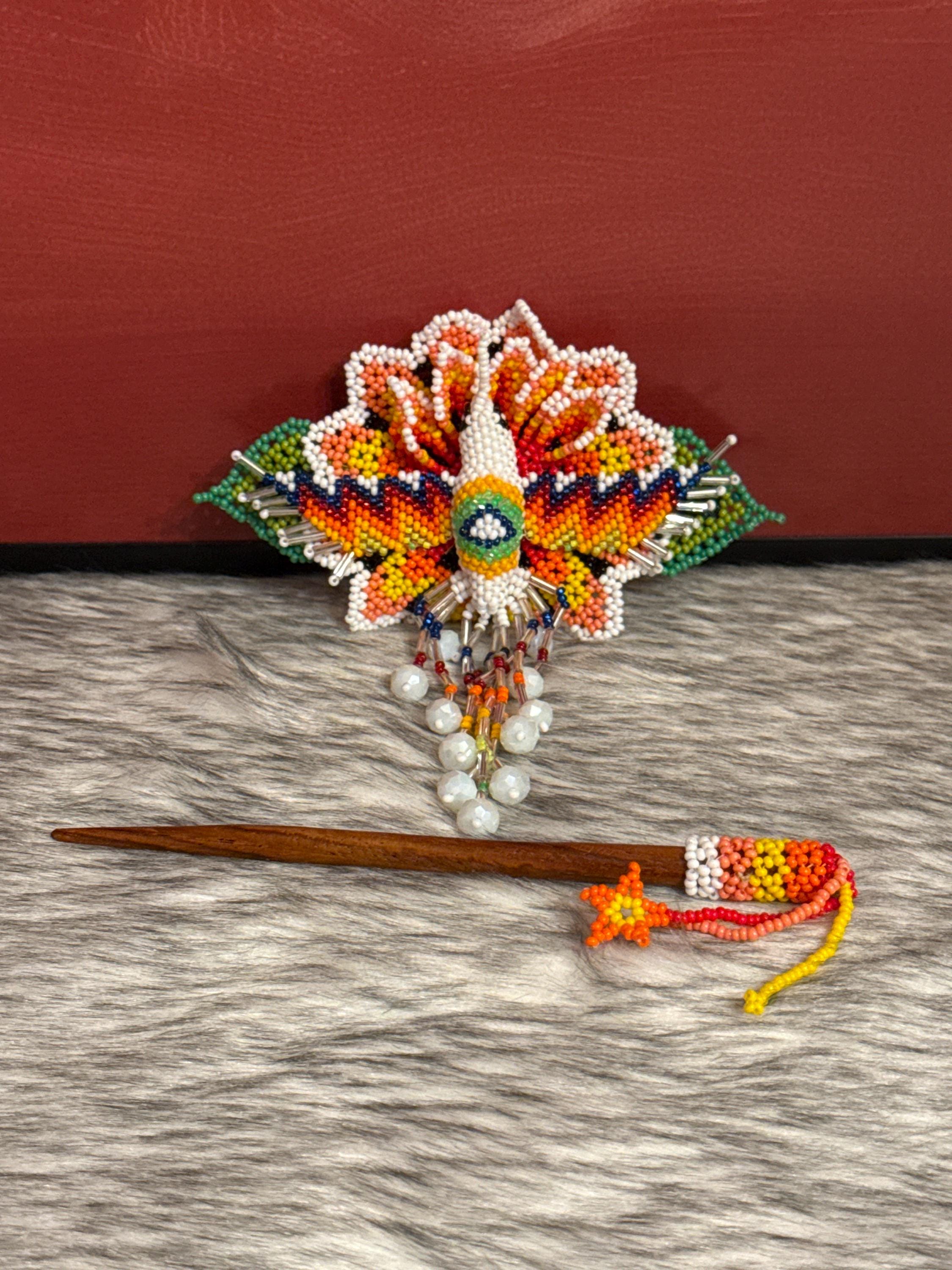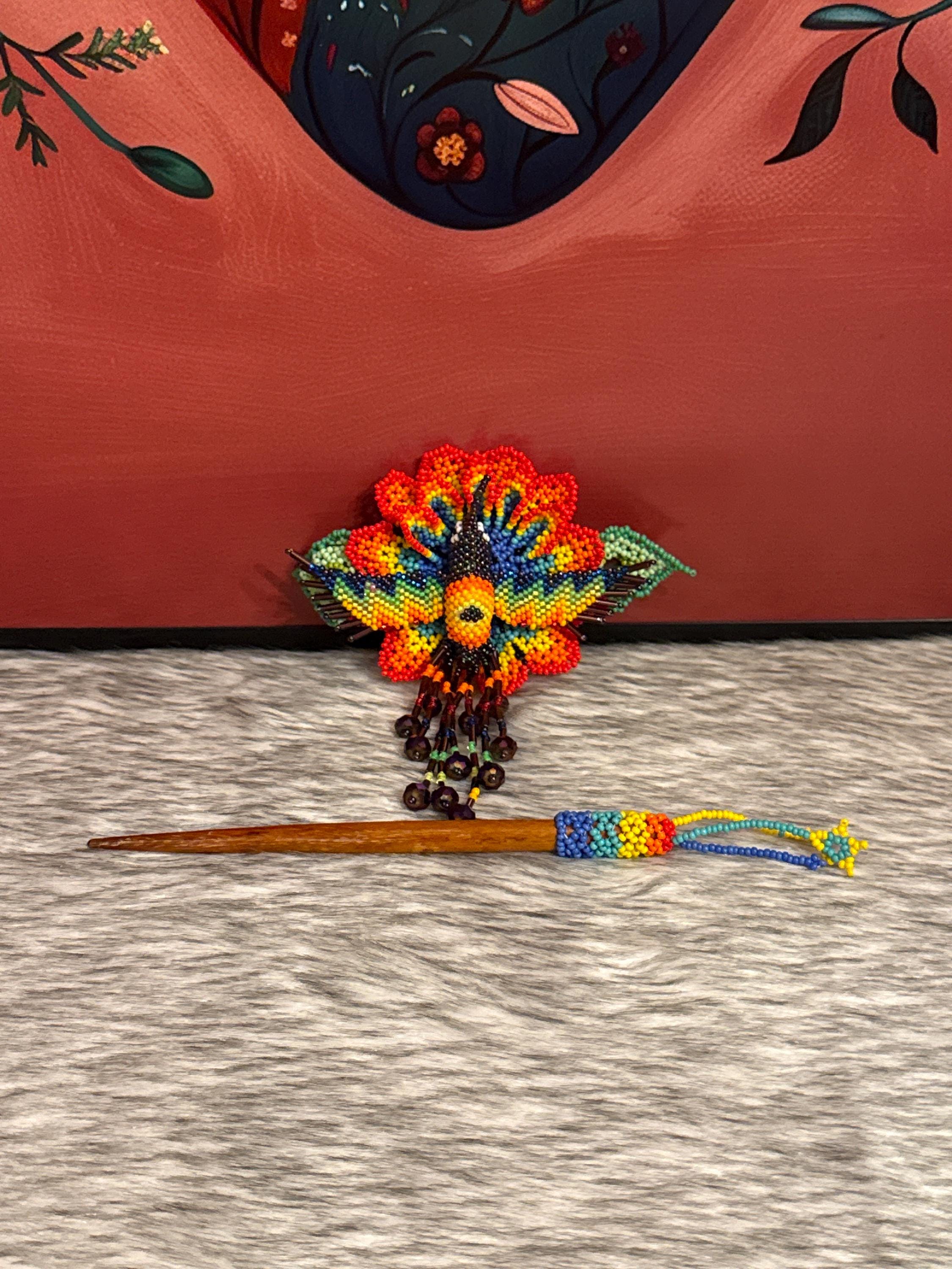 Hermoso broche con gancho de madera para el cabello,hecho con chaquiras que dan forma a una hermosa flor con colibrí.