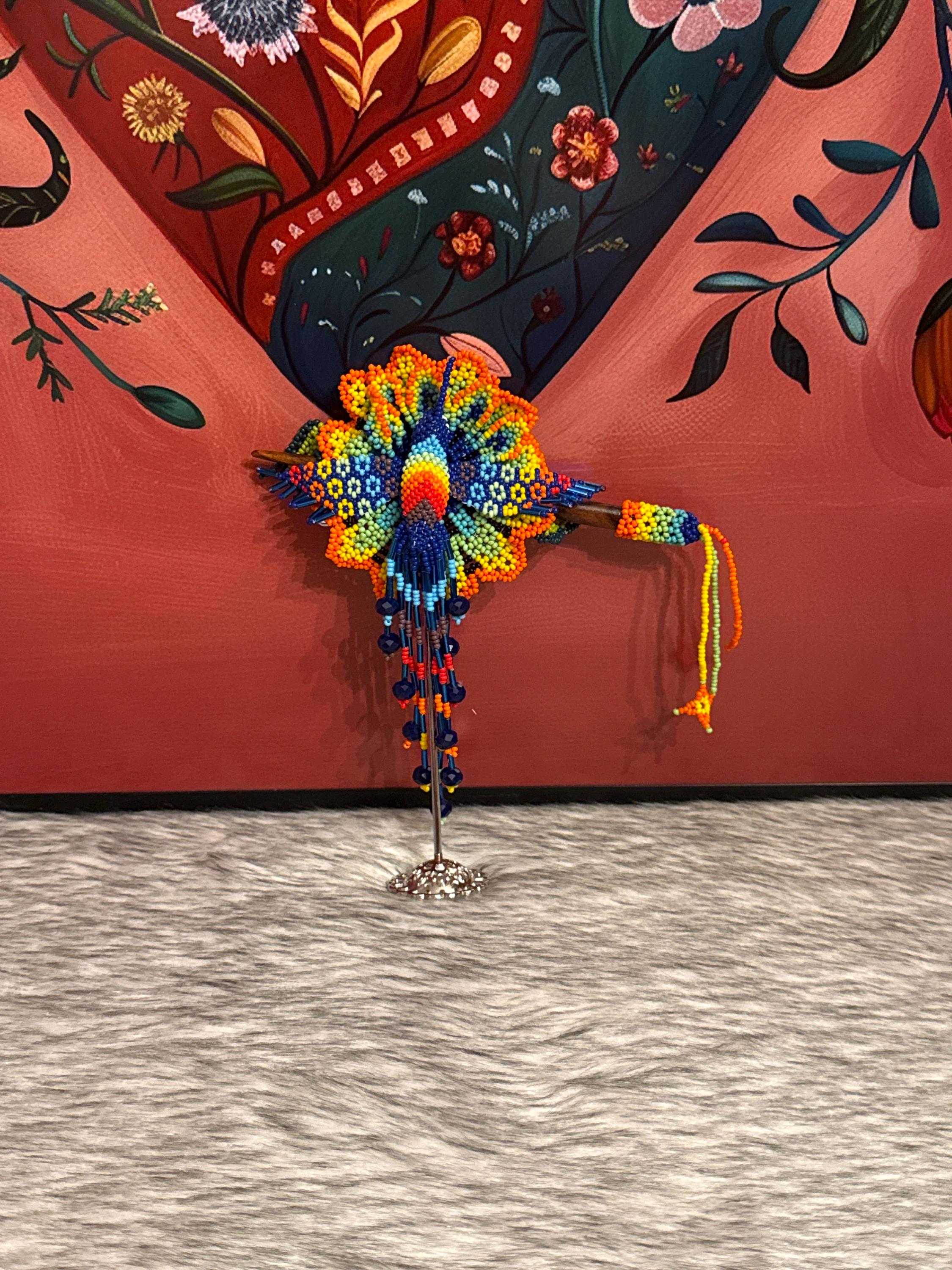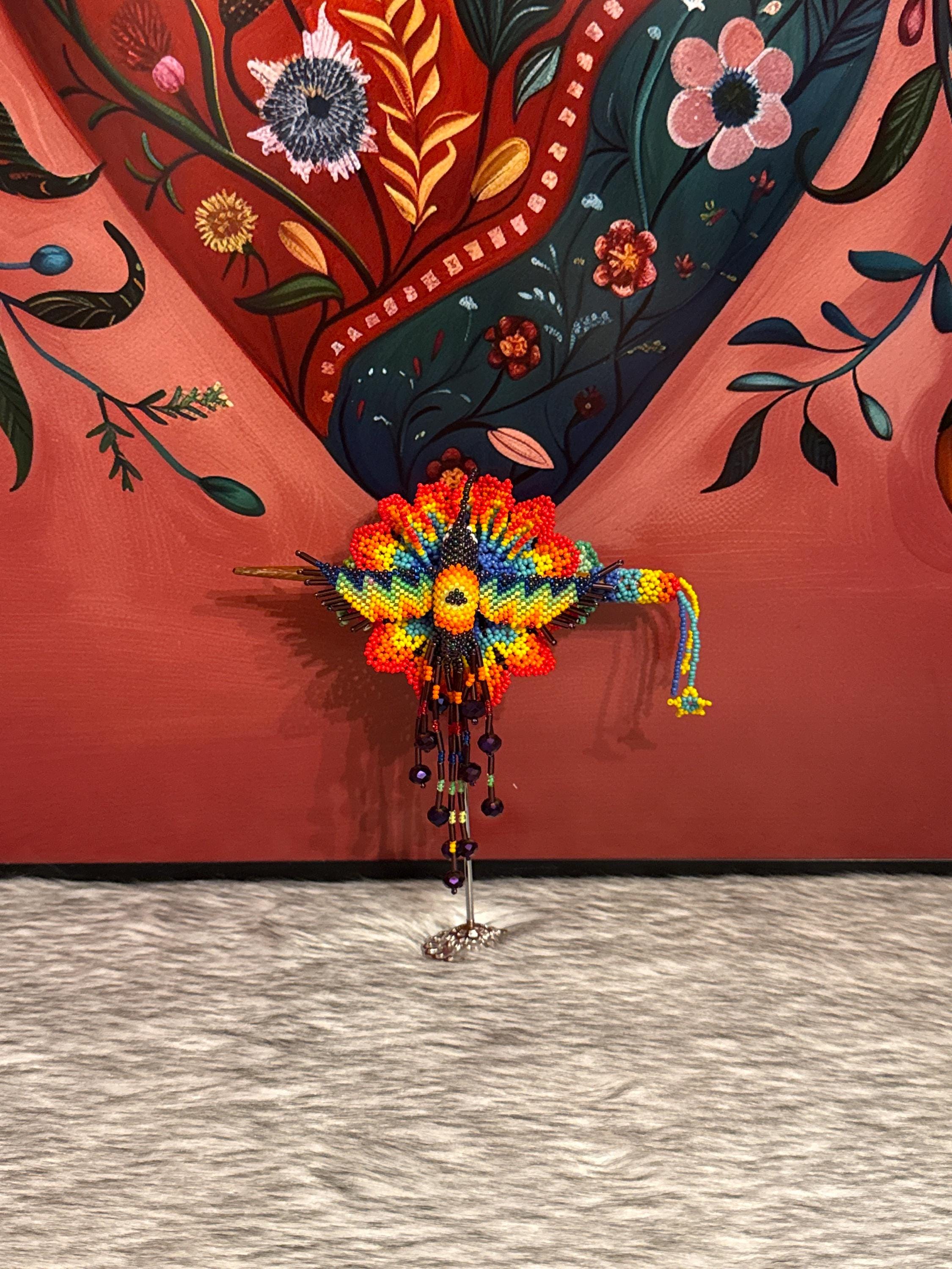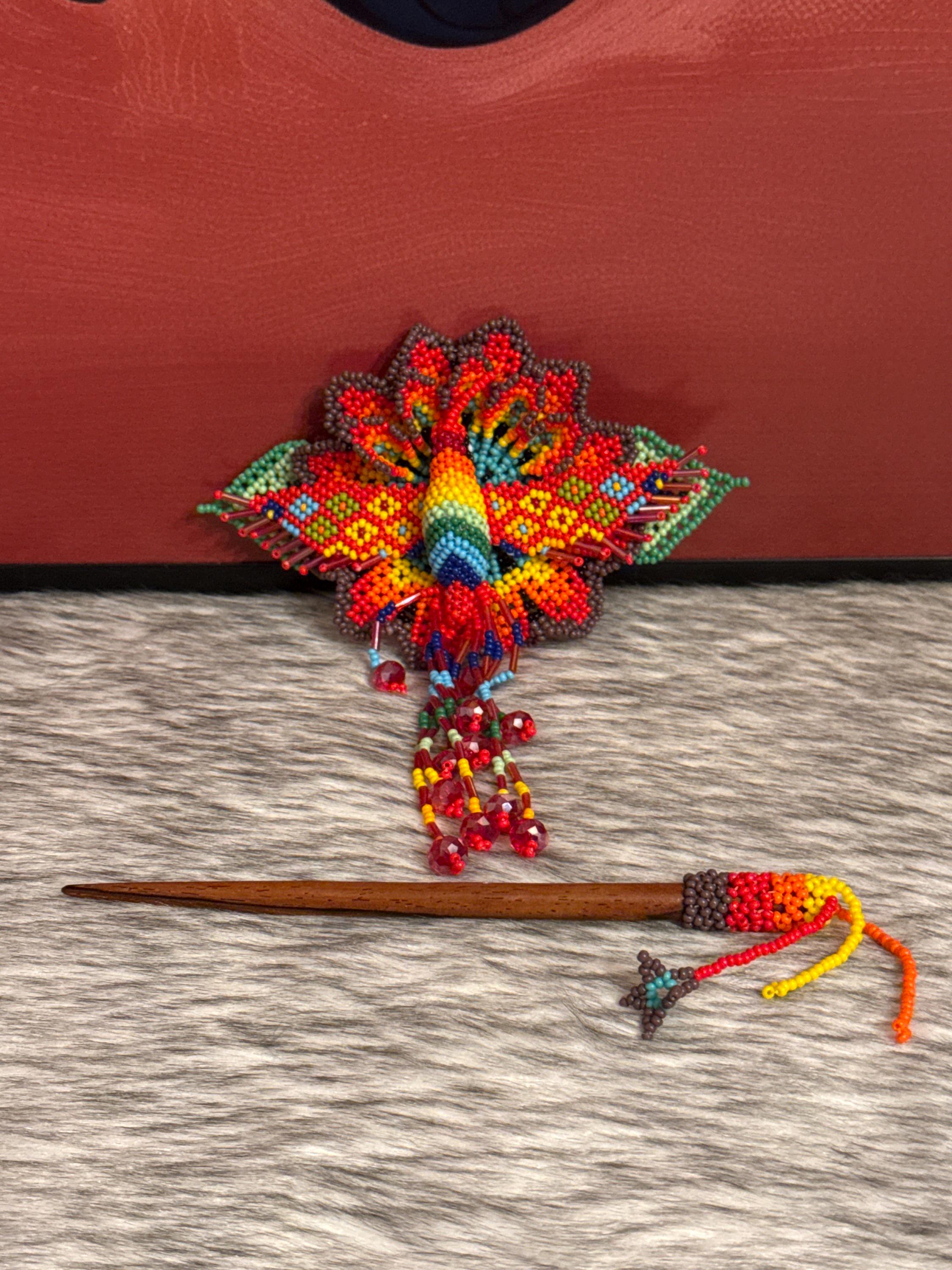 Hermoso broche con gancho de madera para el cabello,hecho con chaquiras que dan forma a una hermosa flor con colibrí.