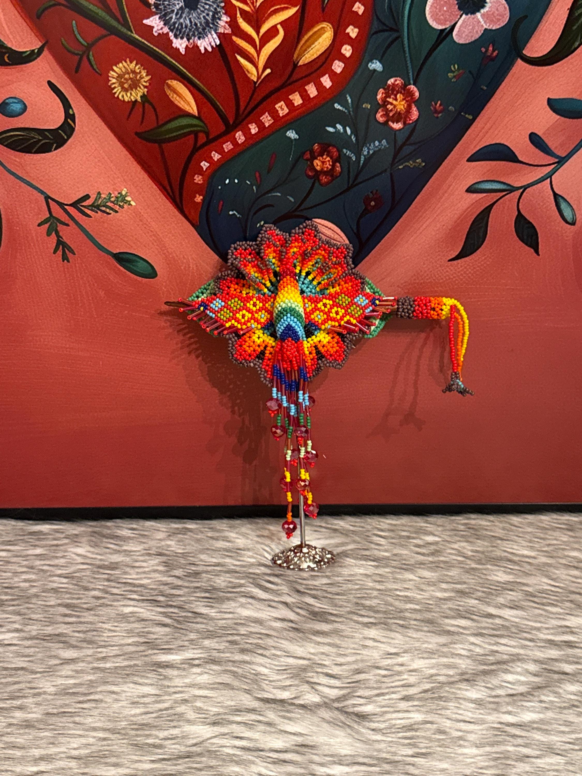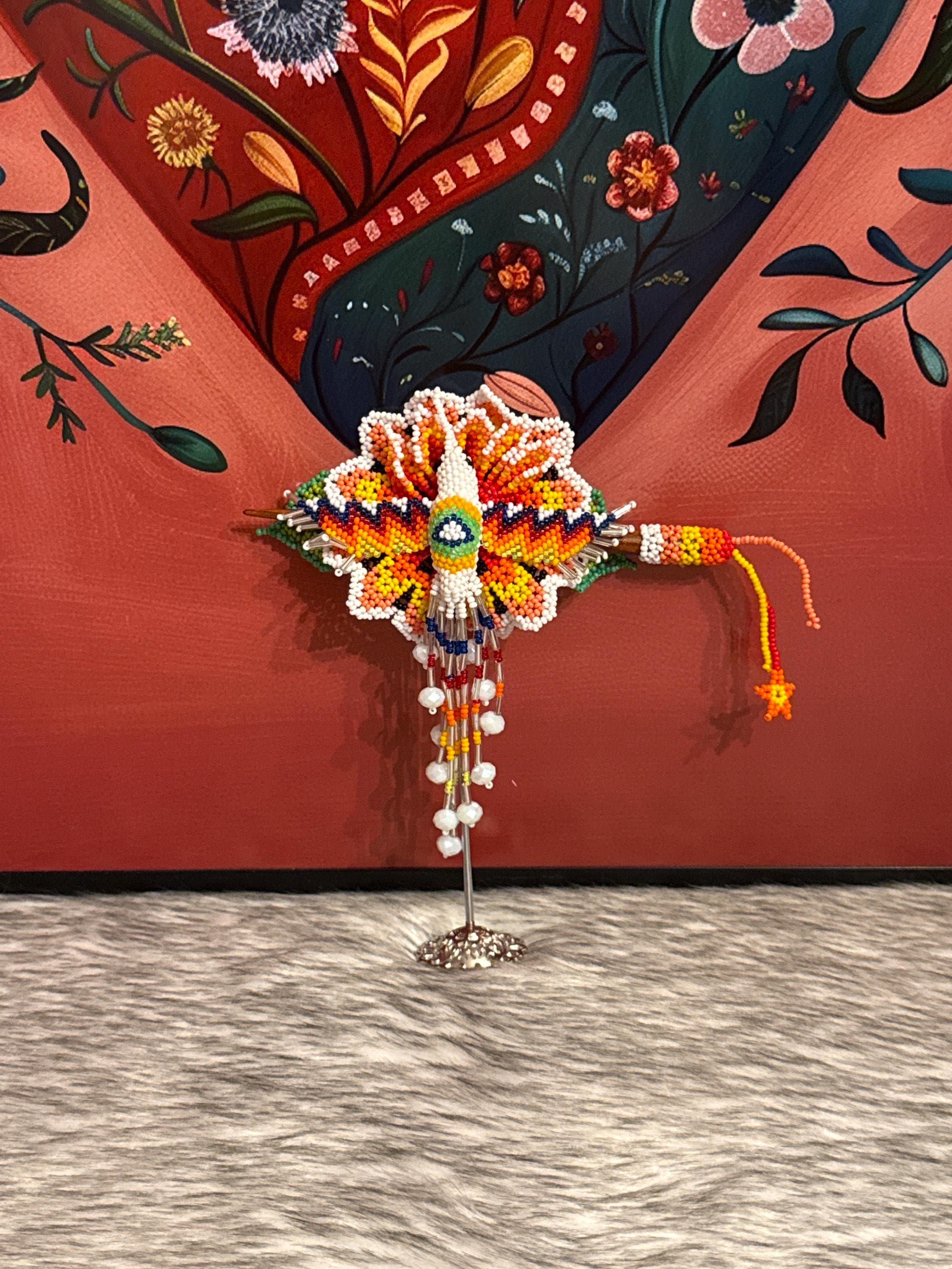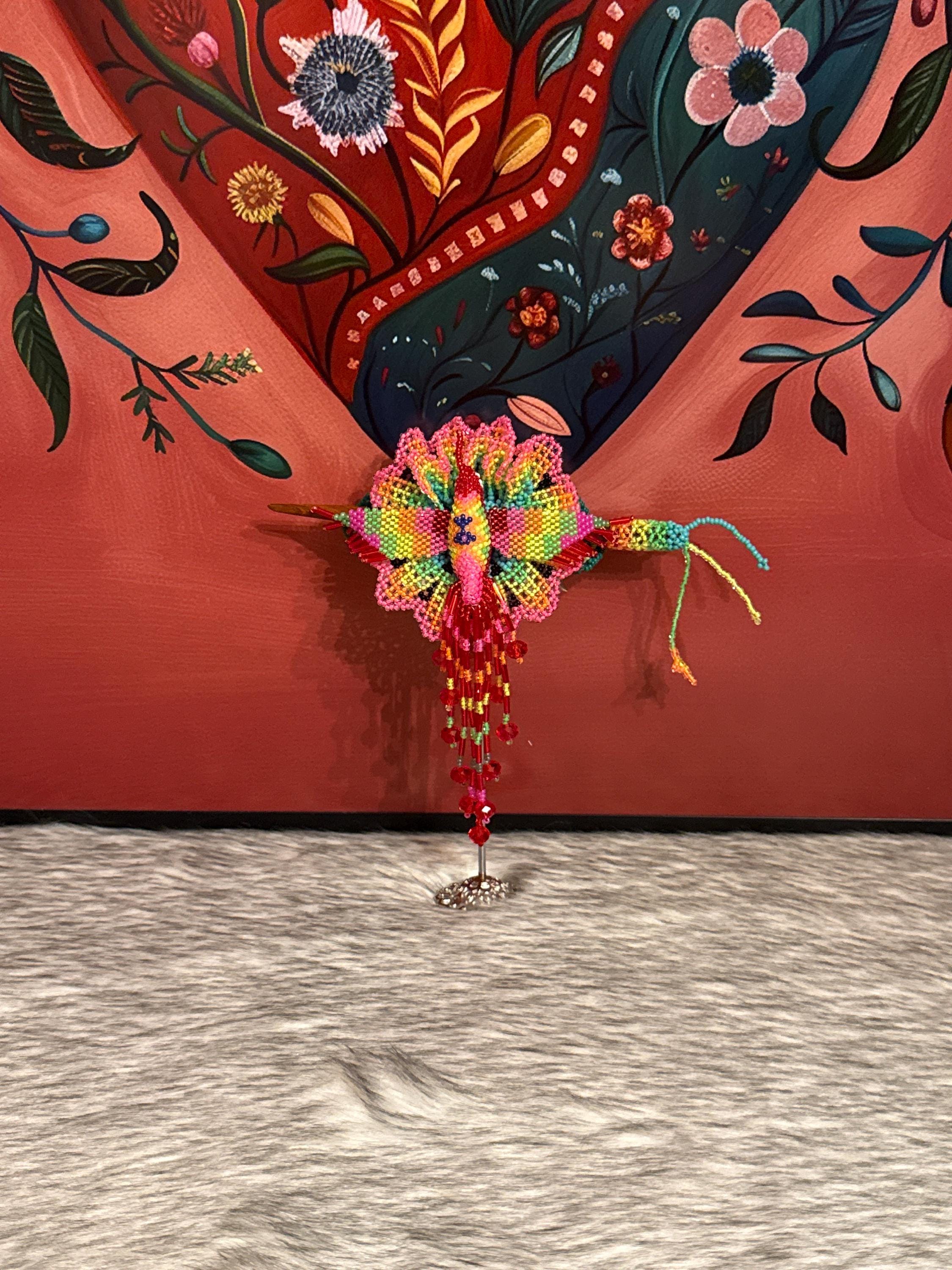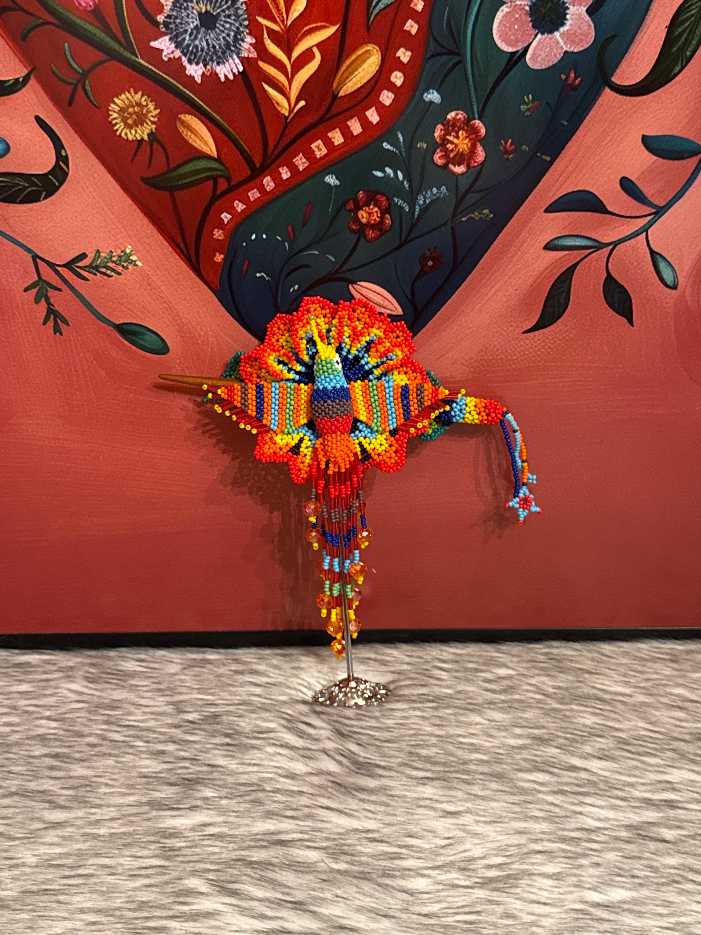 Hermoso broche con gancho de madera para el cabello,hecho con chaquiras que dan forma a una hermosa flor con colibrí.