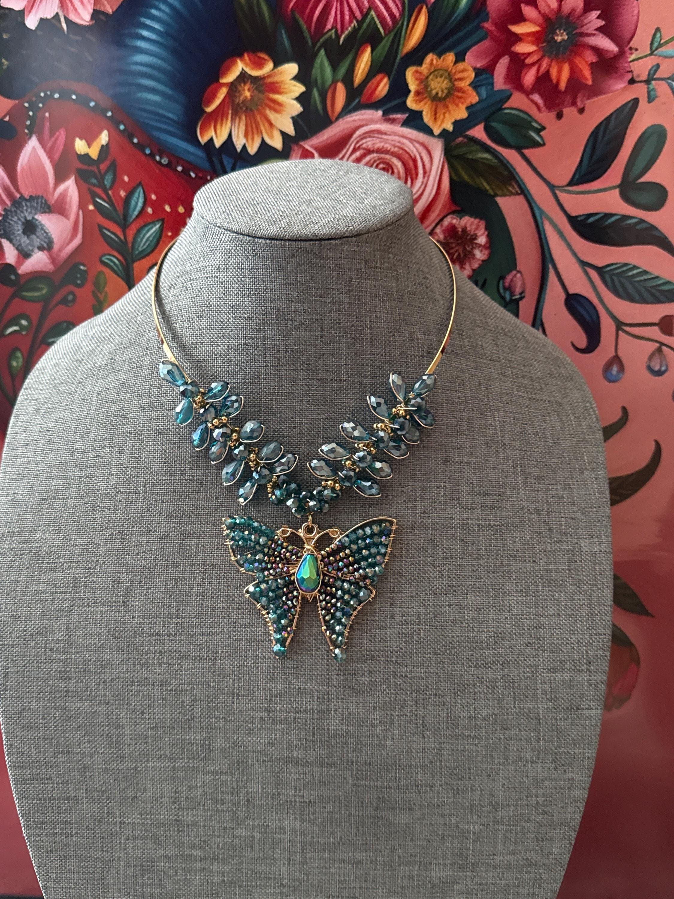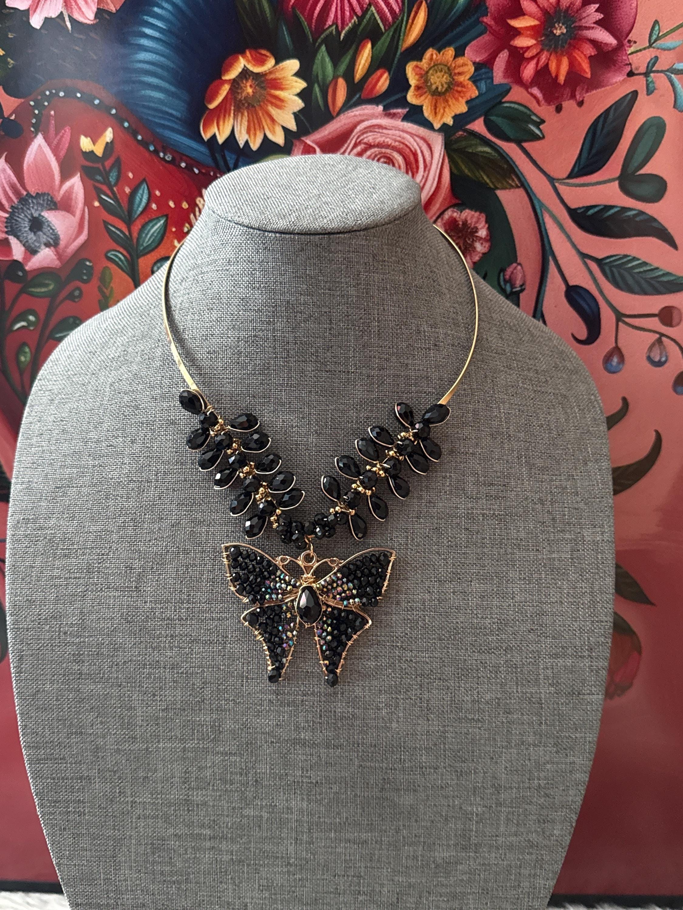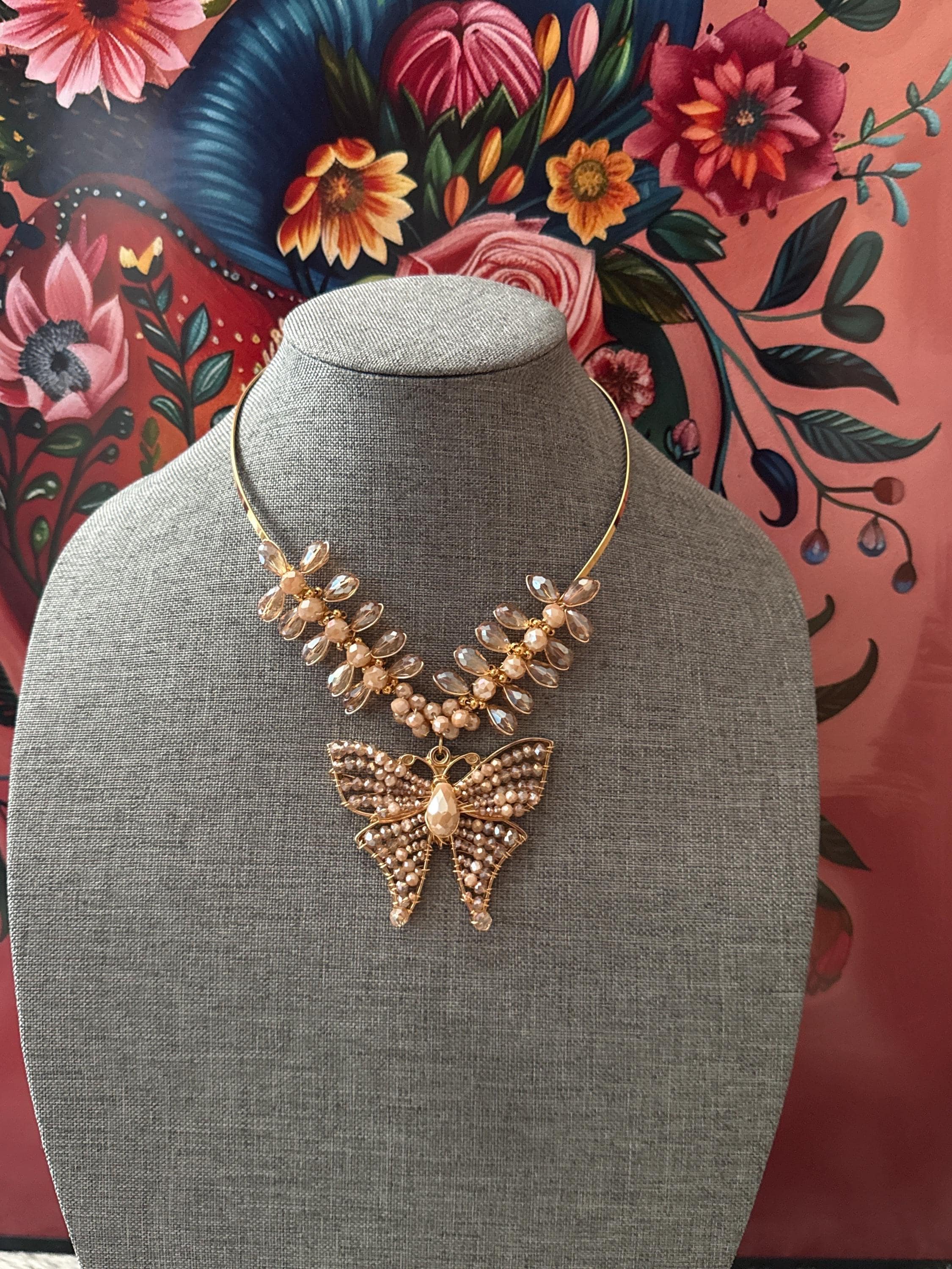 Beautiful gold-plated choker with an inlaid butterfly made using wire wrapping and Czech crystals.