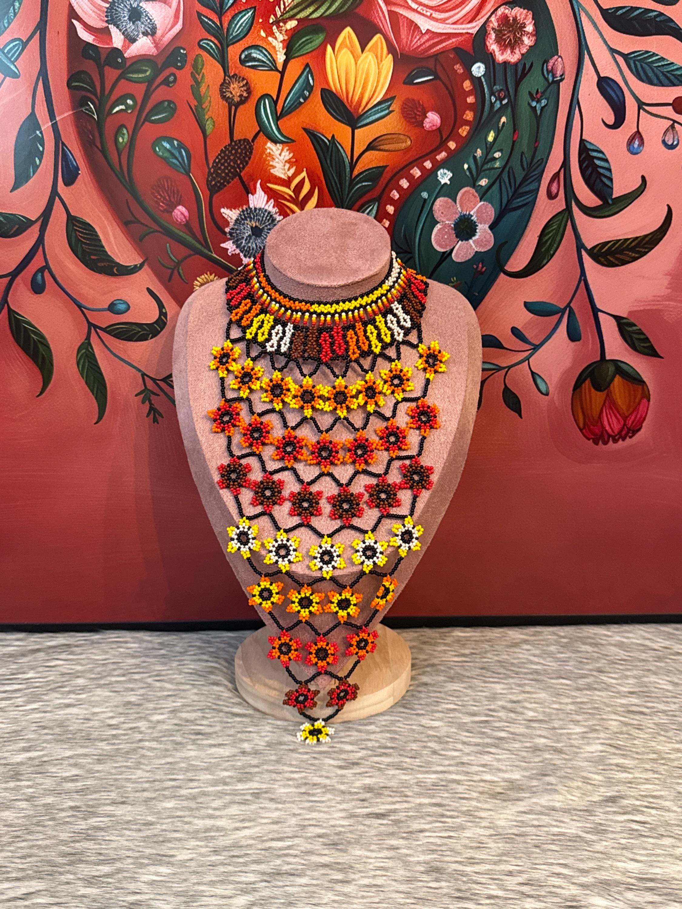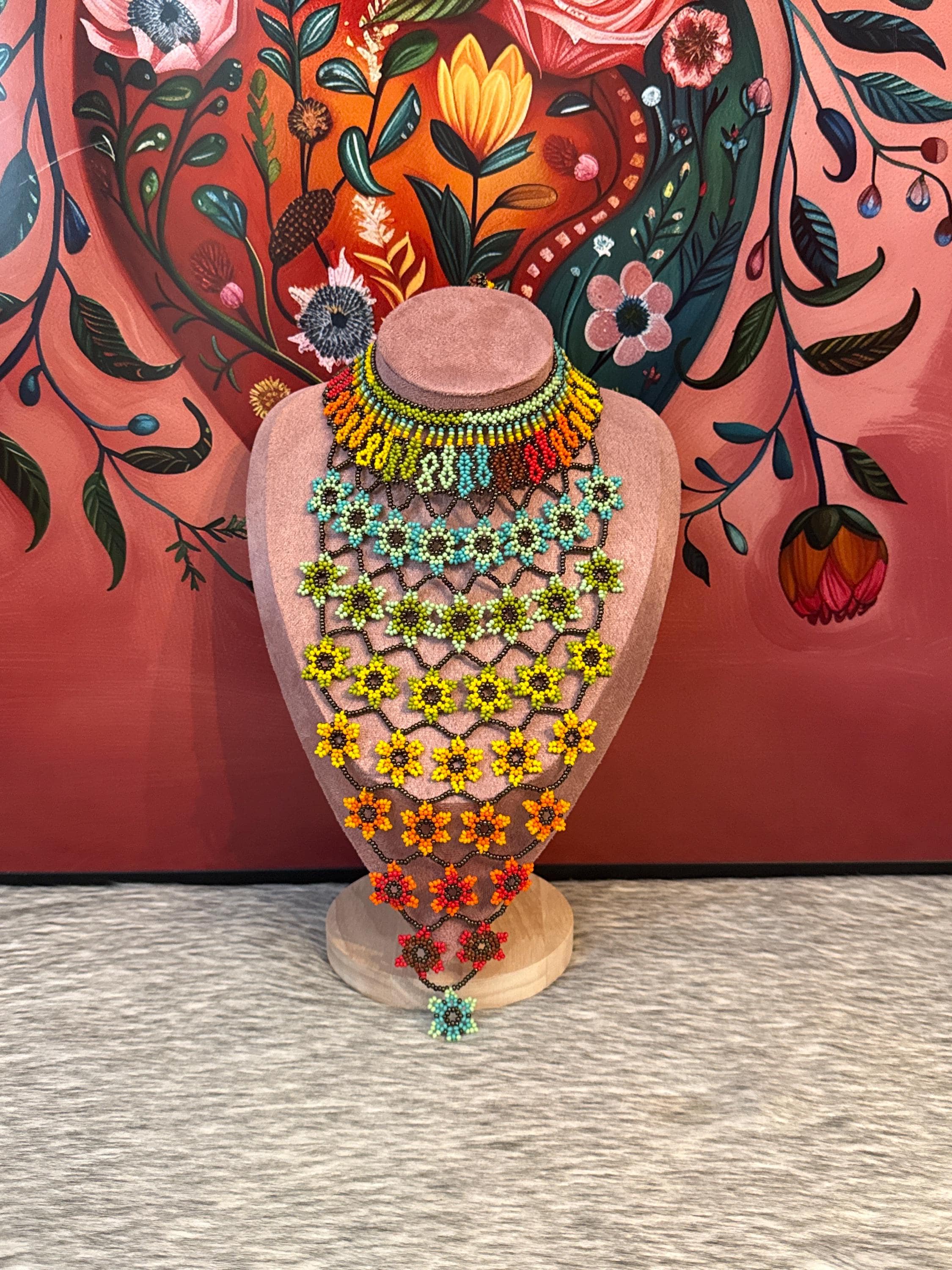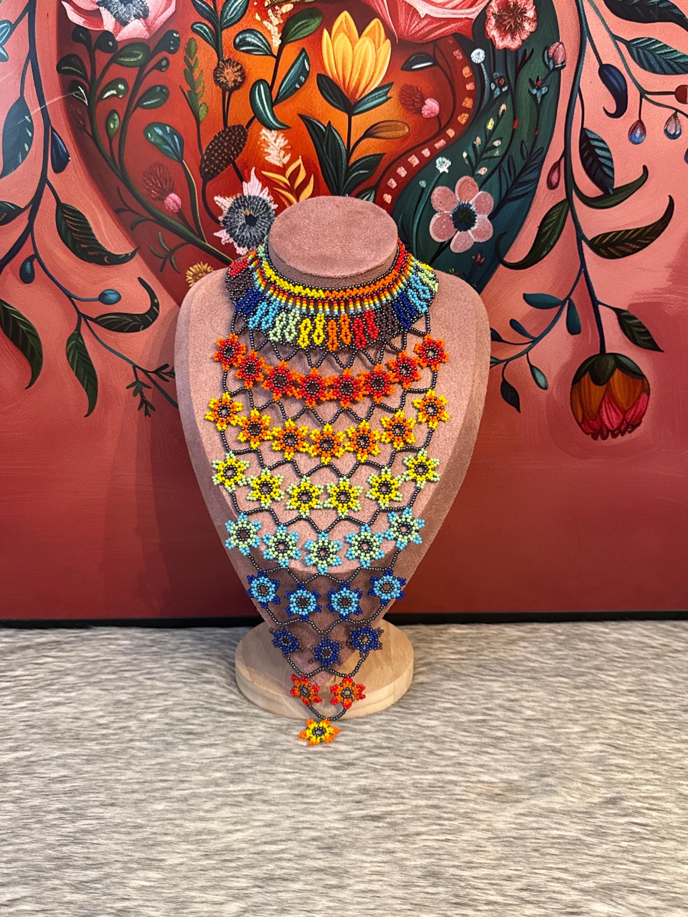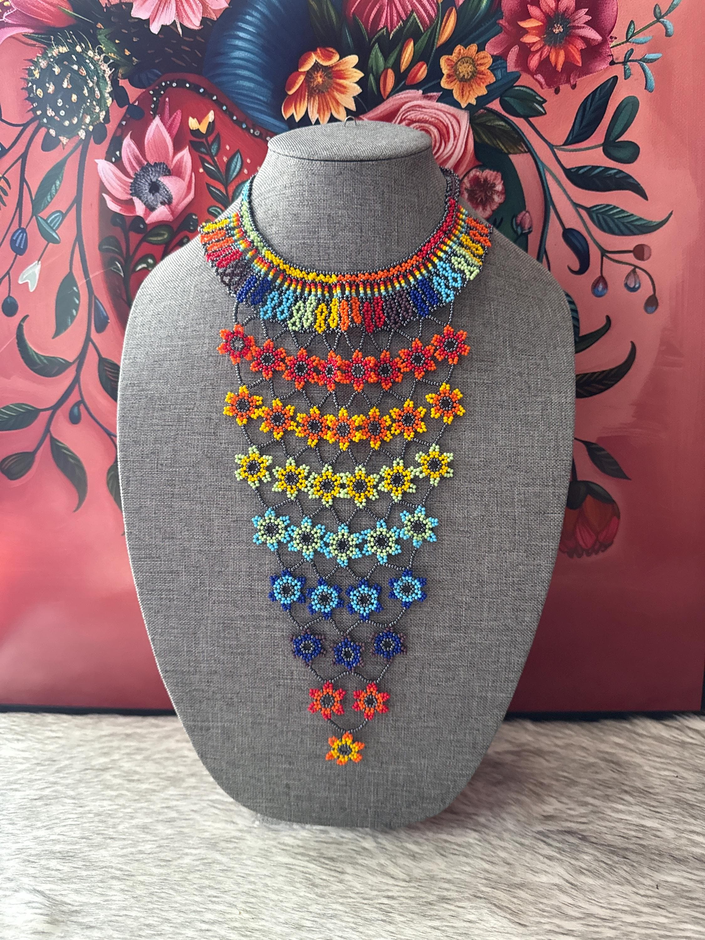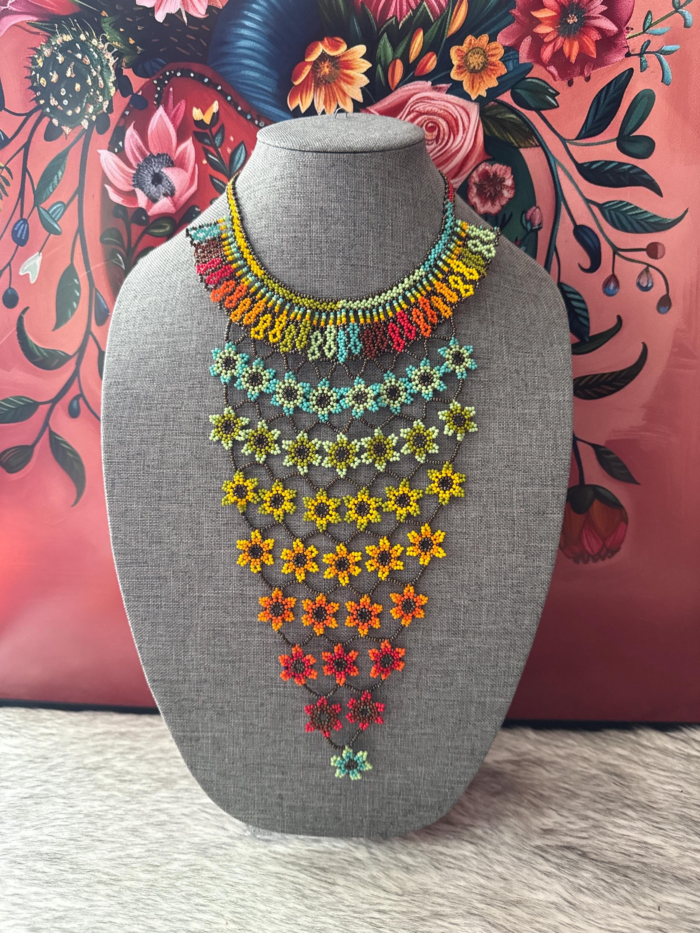 Beautiful handcrafted necklace made with glass beads, handmade by Mexican artisans. Liven up that dress or blouse and look spectacular with this beautiful creation, made with beaded flowers.