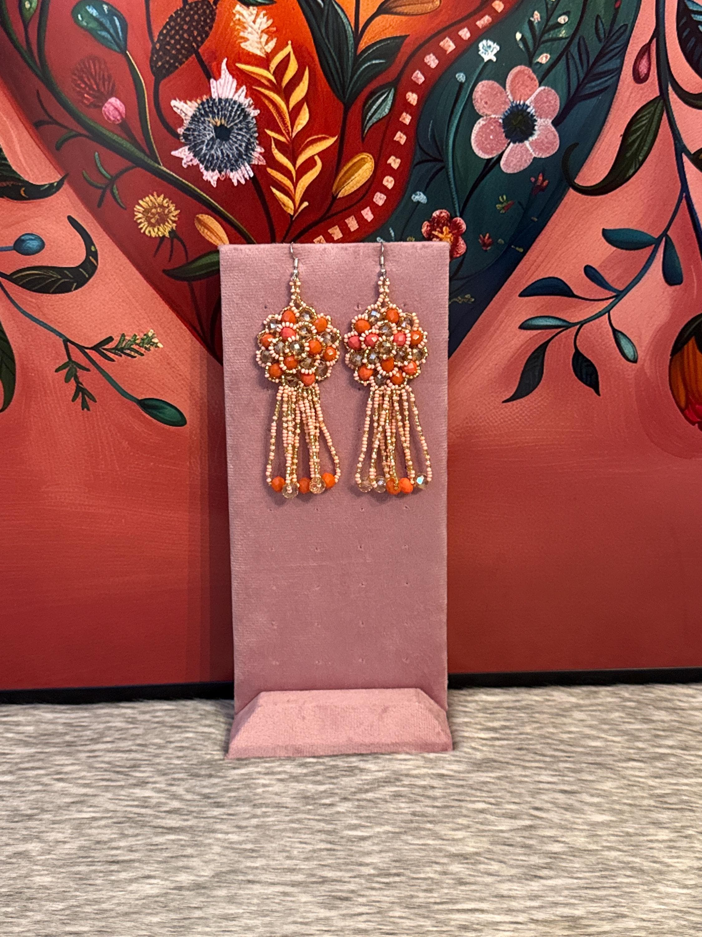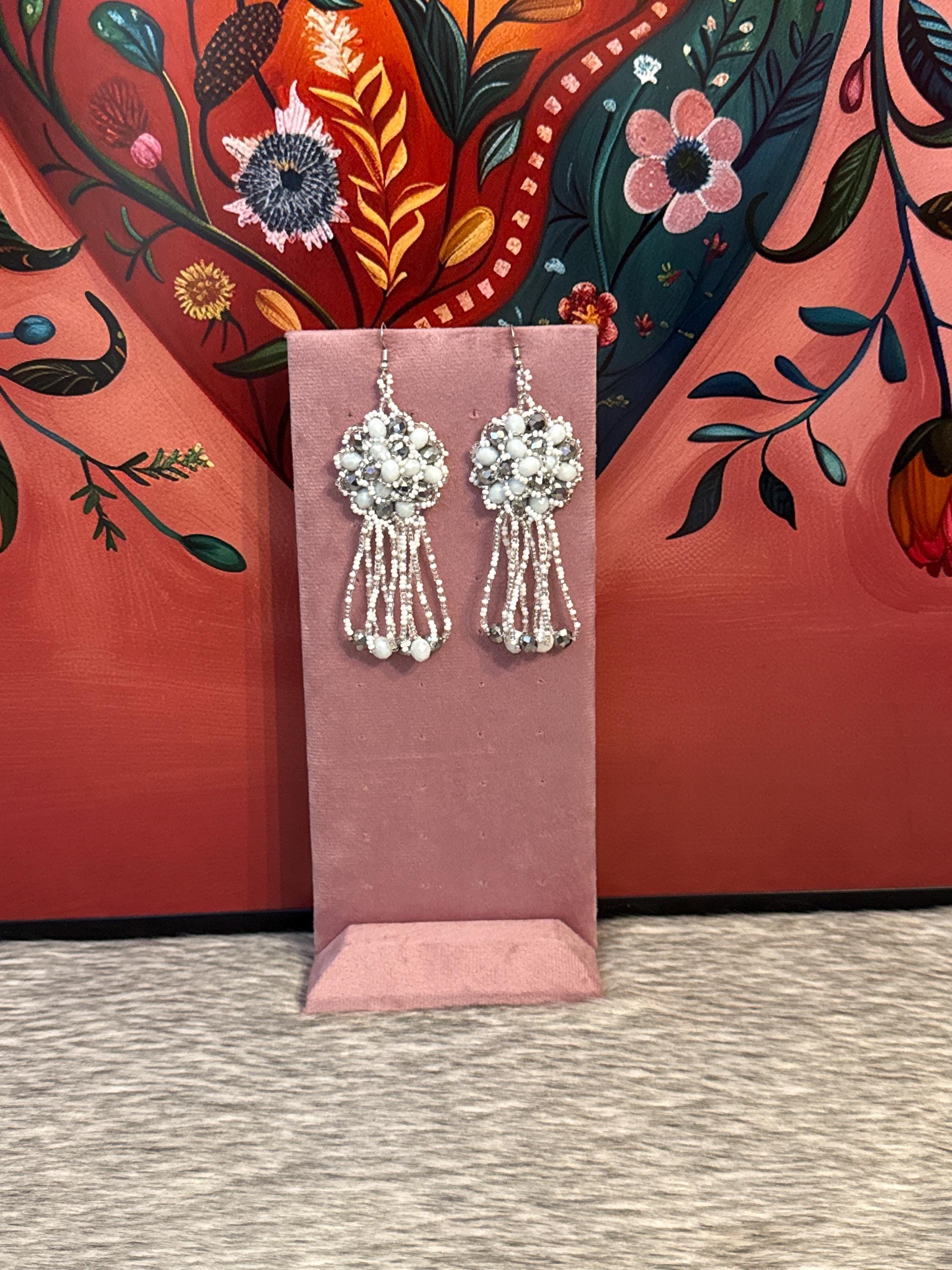 Beautiful handmade earrings made with glass beads and Czech crystals, the earrings measure approximately 4.5 inches long.