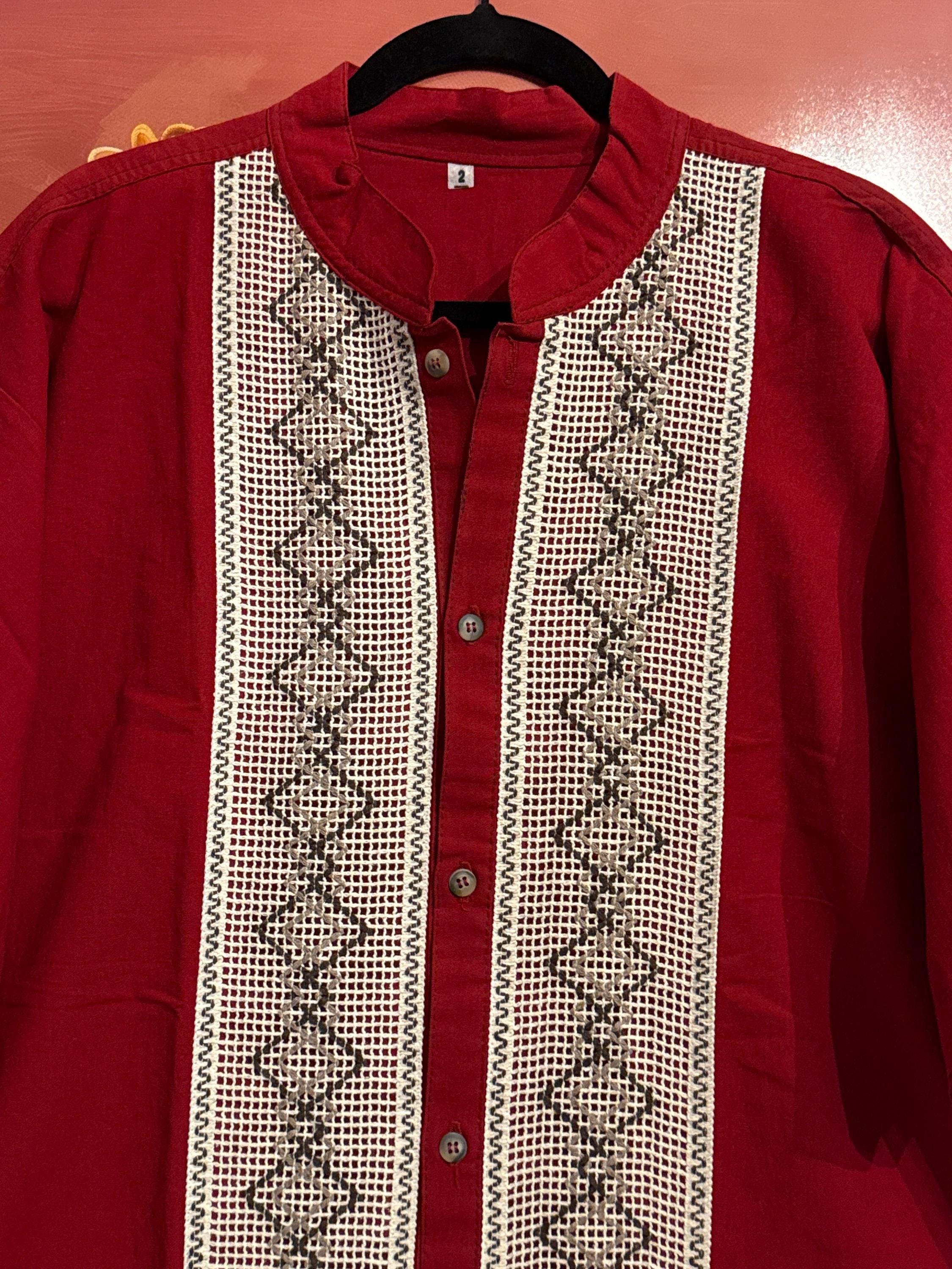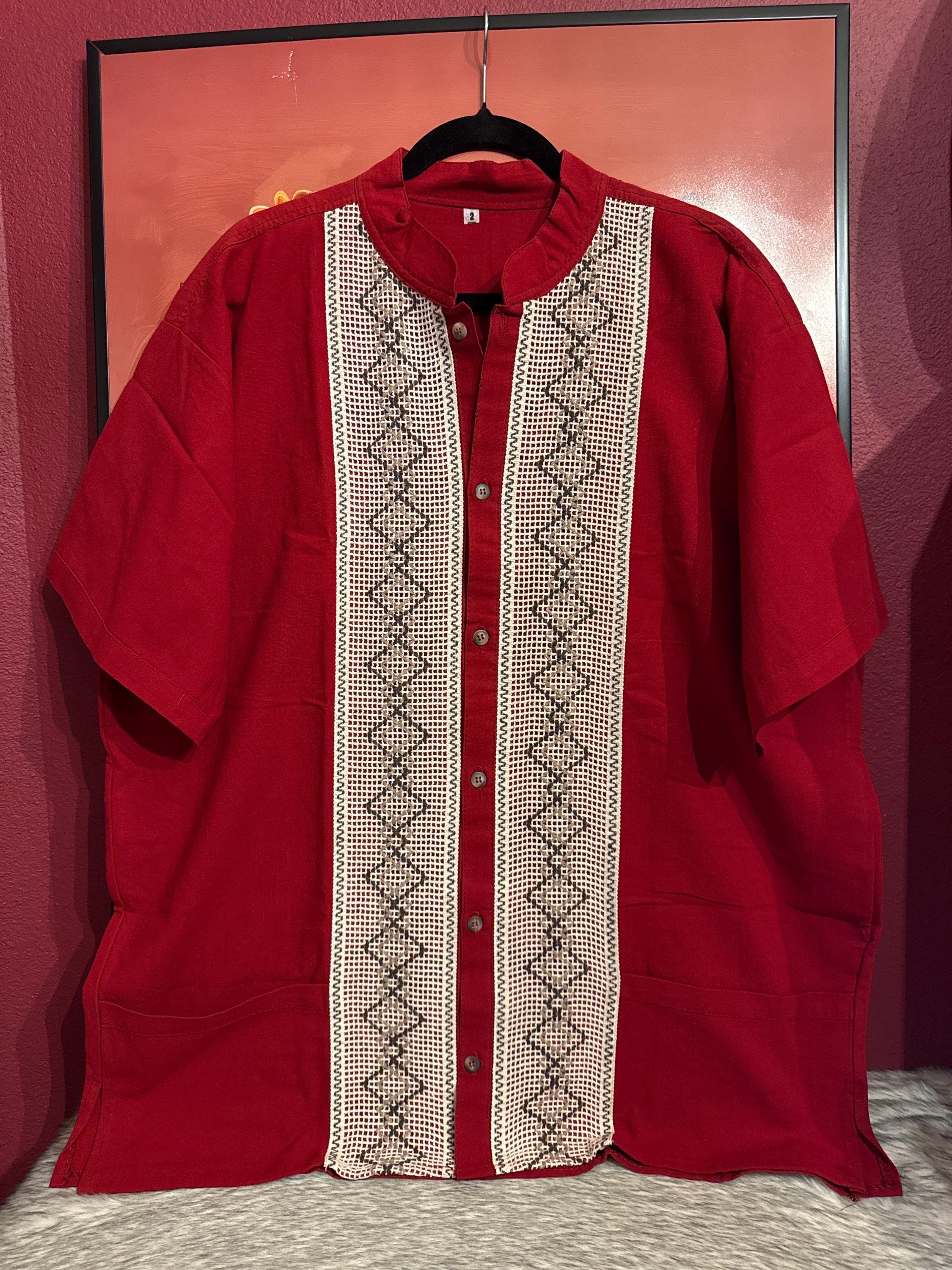 Mexican artisanal guayabera-style shirt, handmade with muslin fabric and embroidered patterns, has 2 pockets, size 2XL