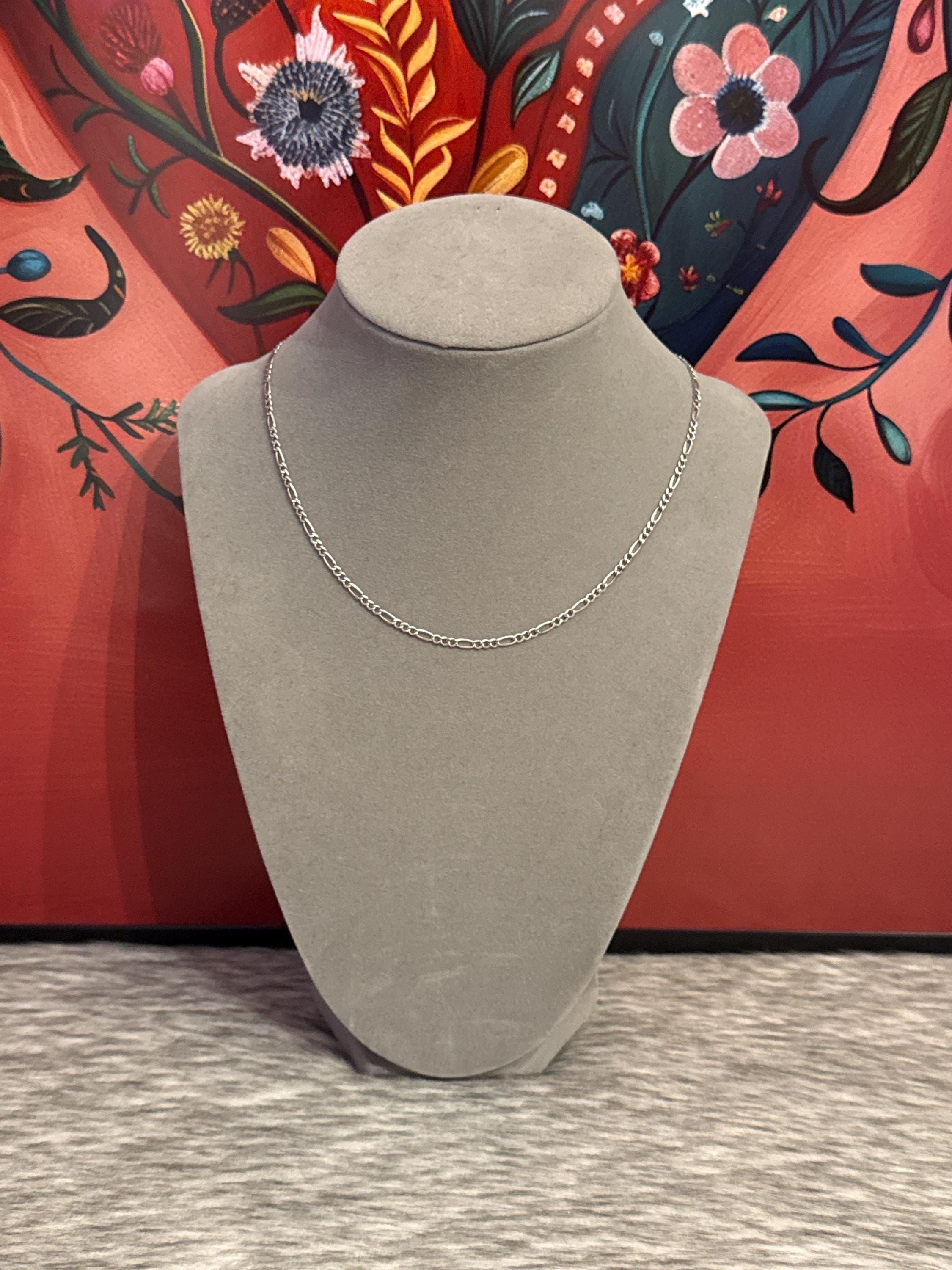 Mexican silver 925 figaro style chains, approximately 2 millimeters wide by 16 inches long. Fine and delicate, they give a special touch to your neck.
