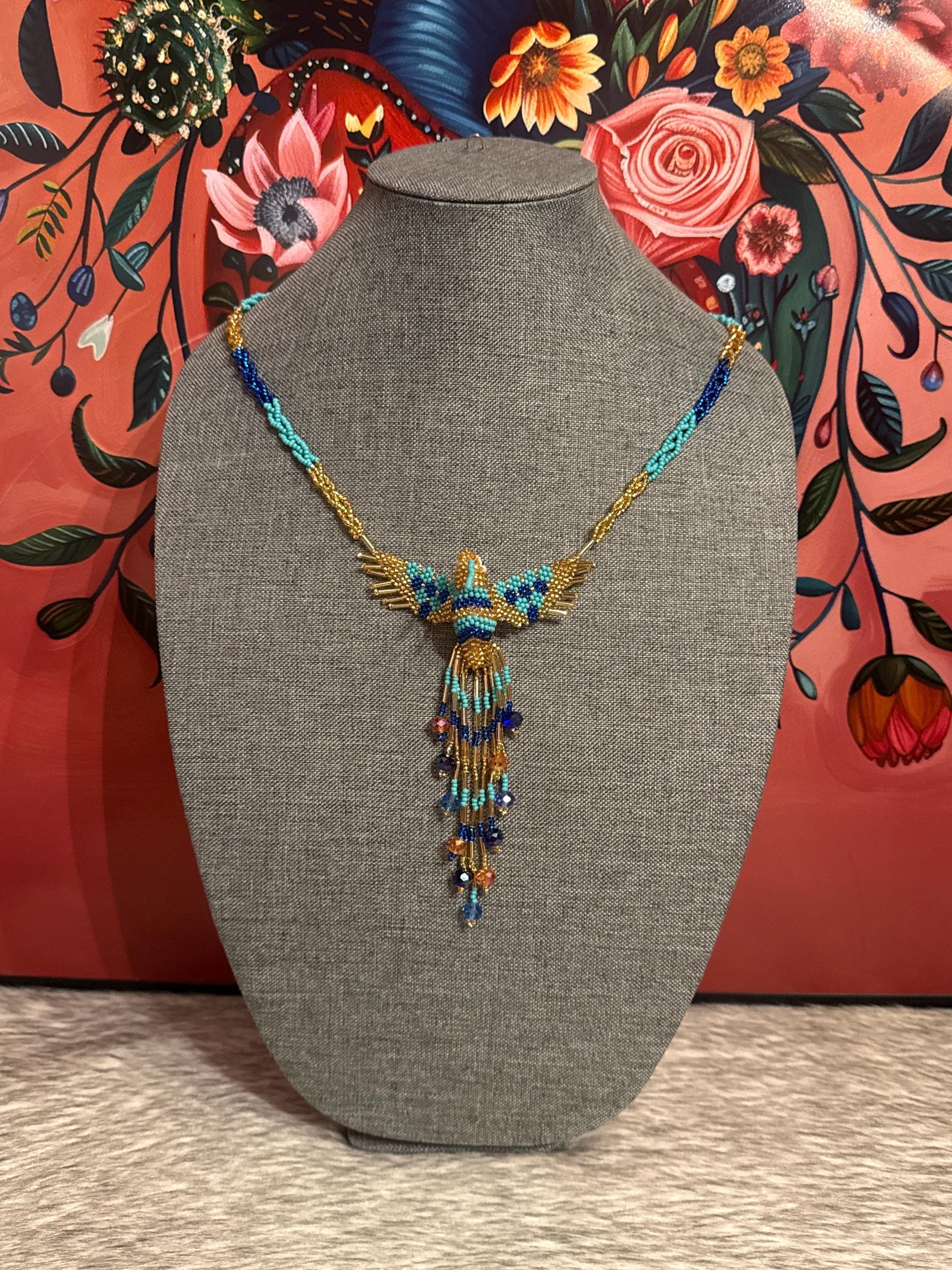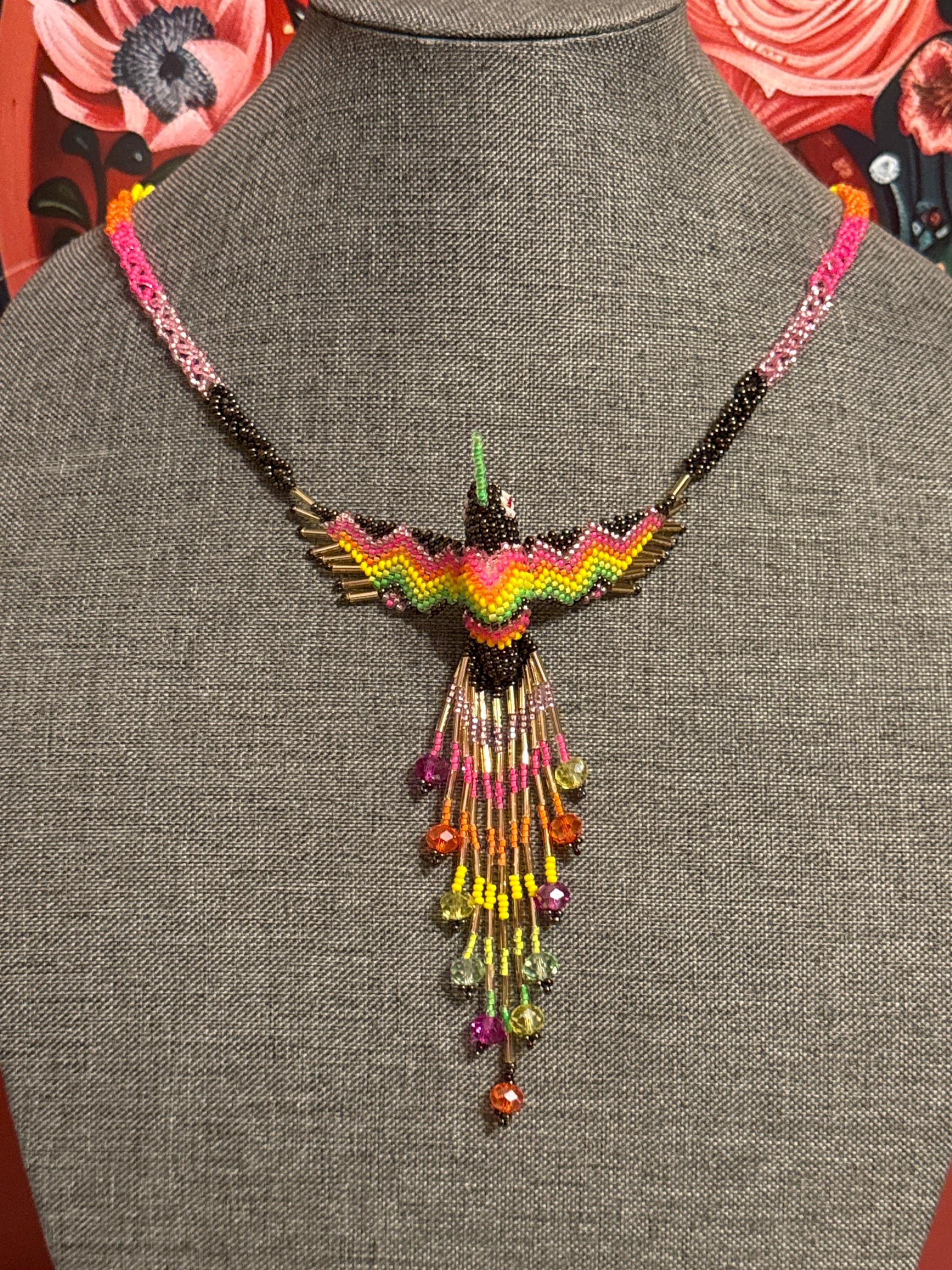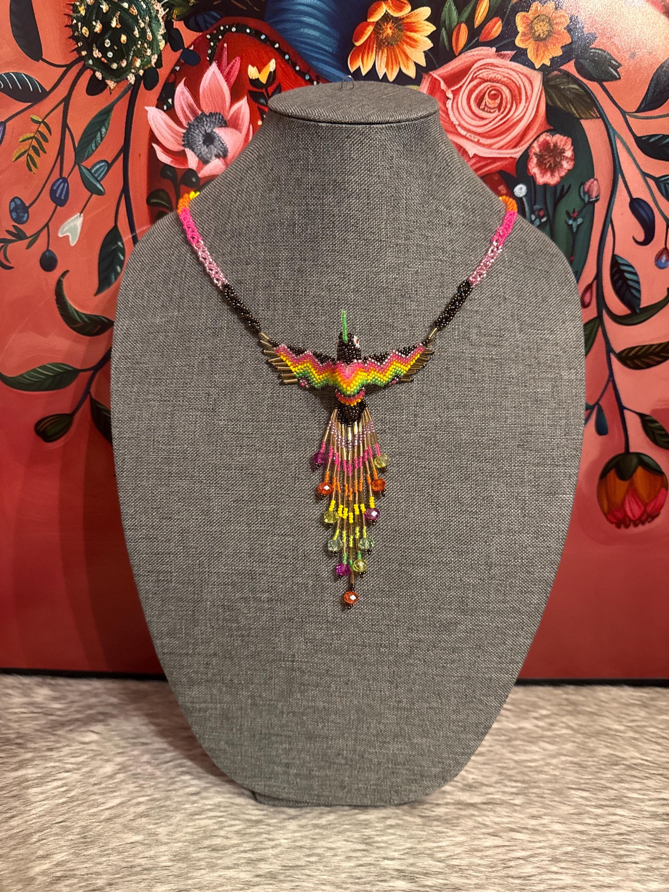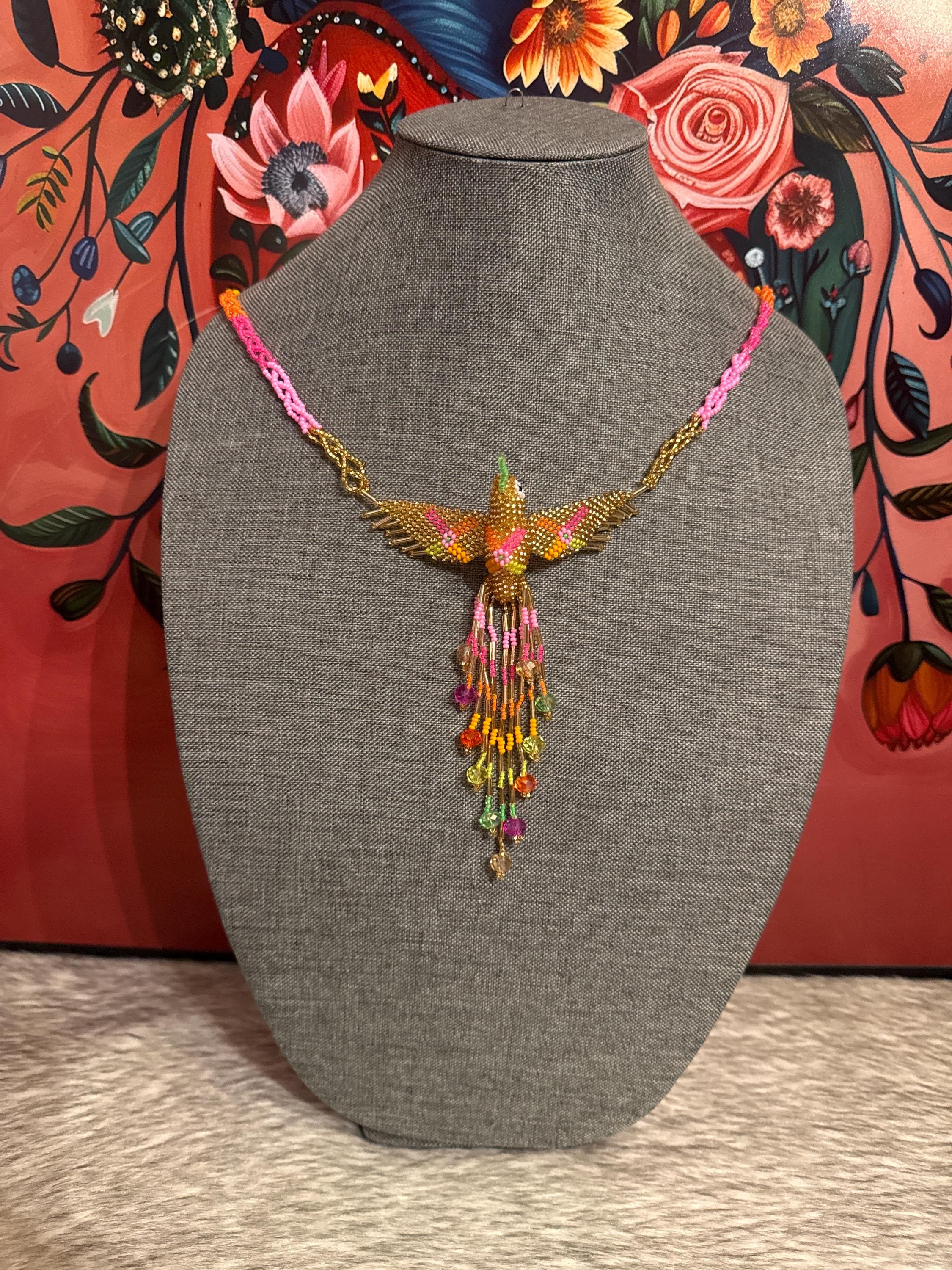 Hermoso collar colibrí hecho a mano por artesanos mexicanos.