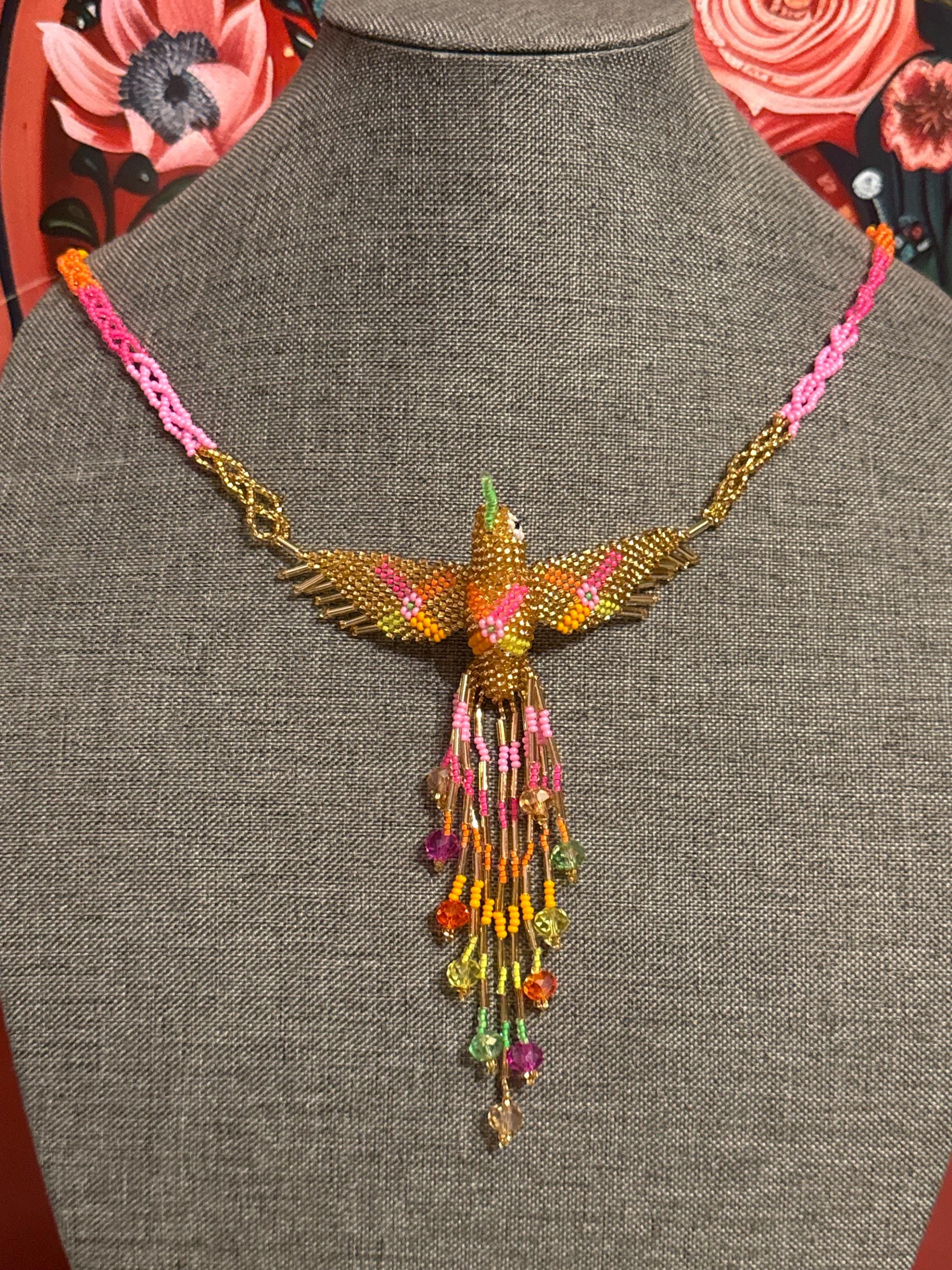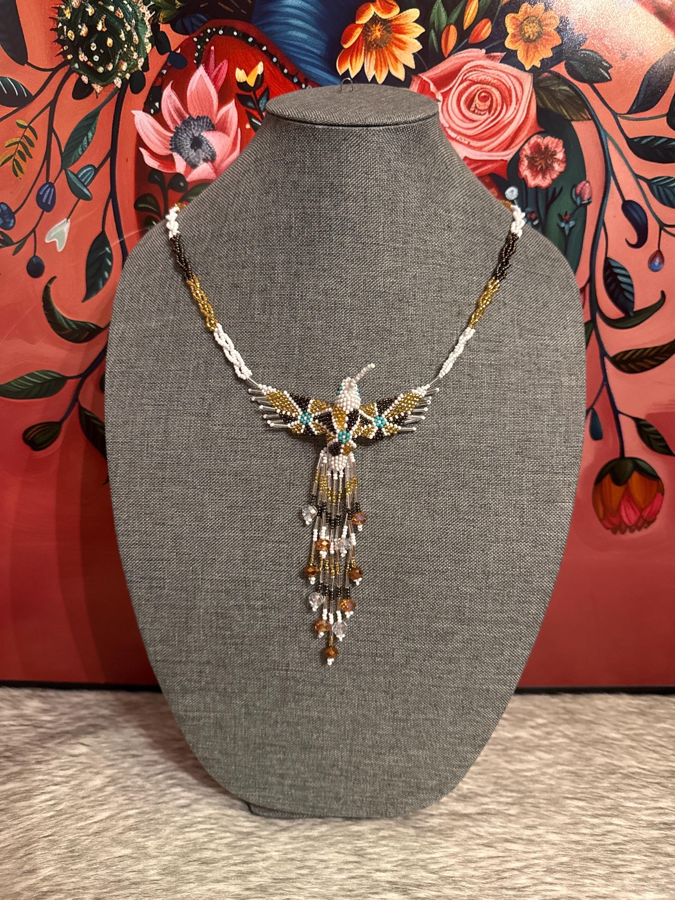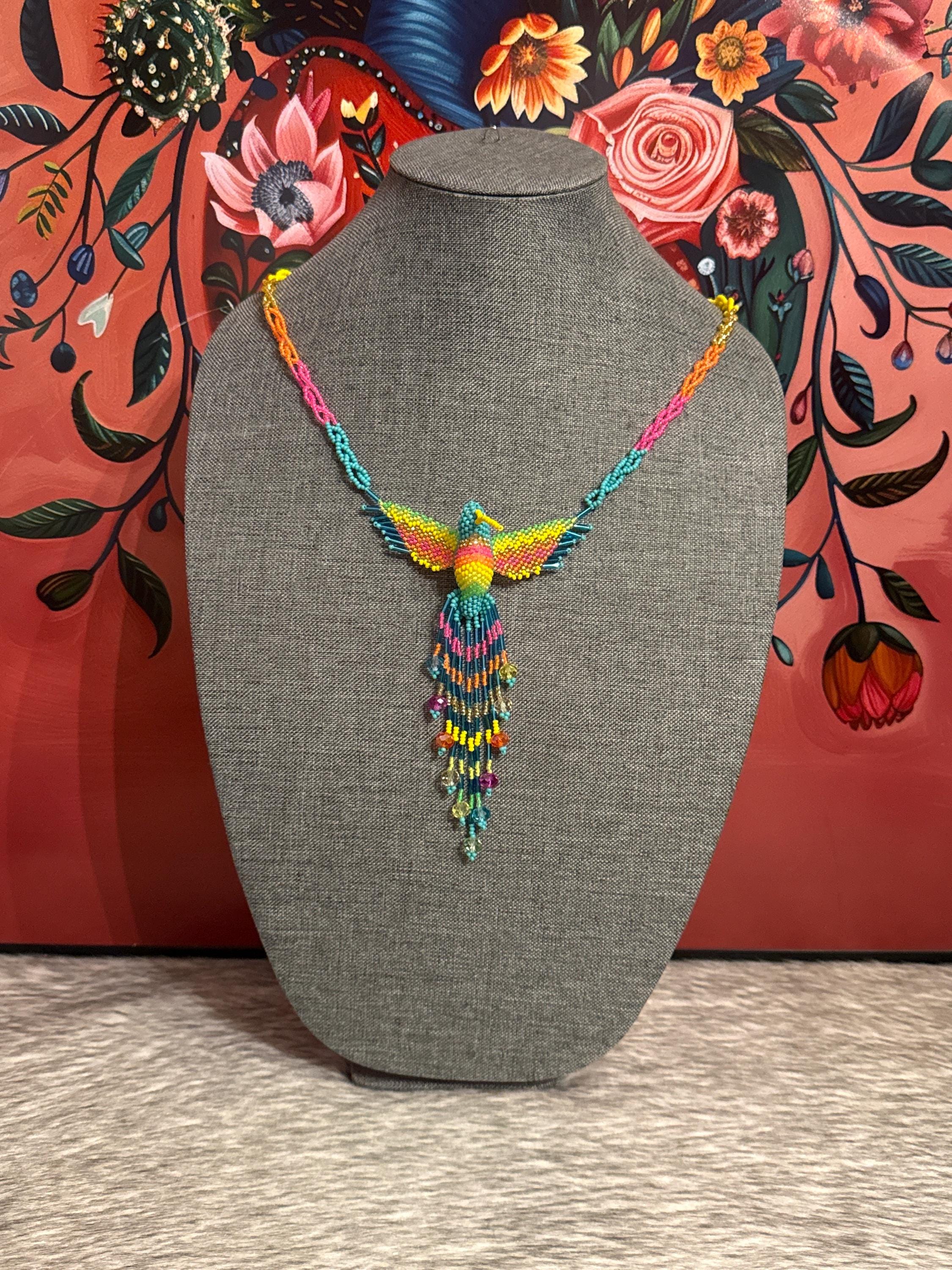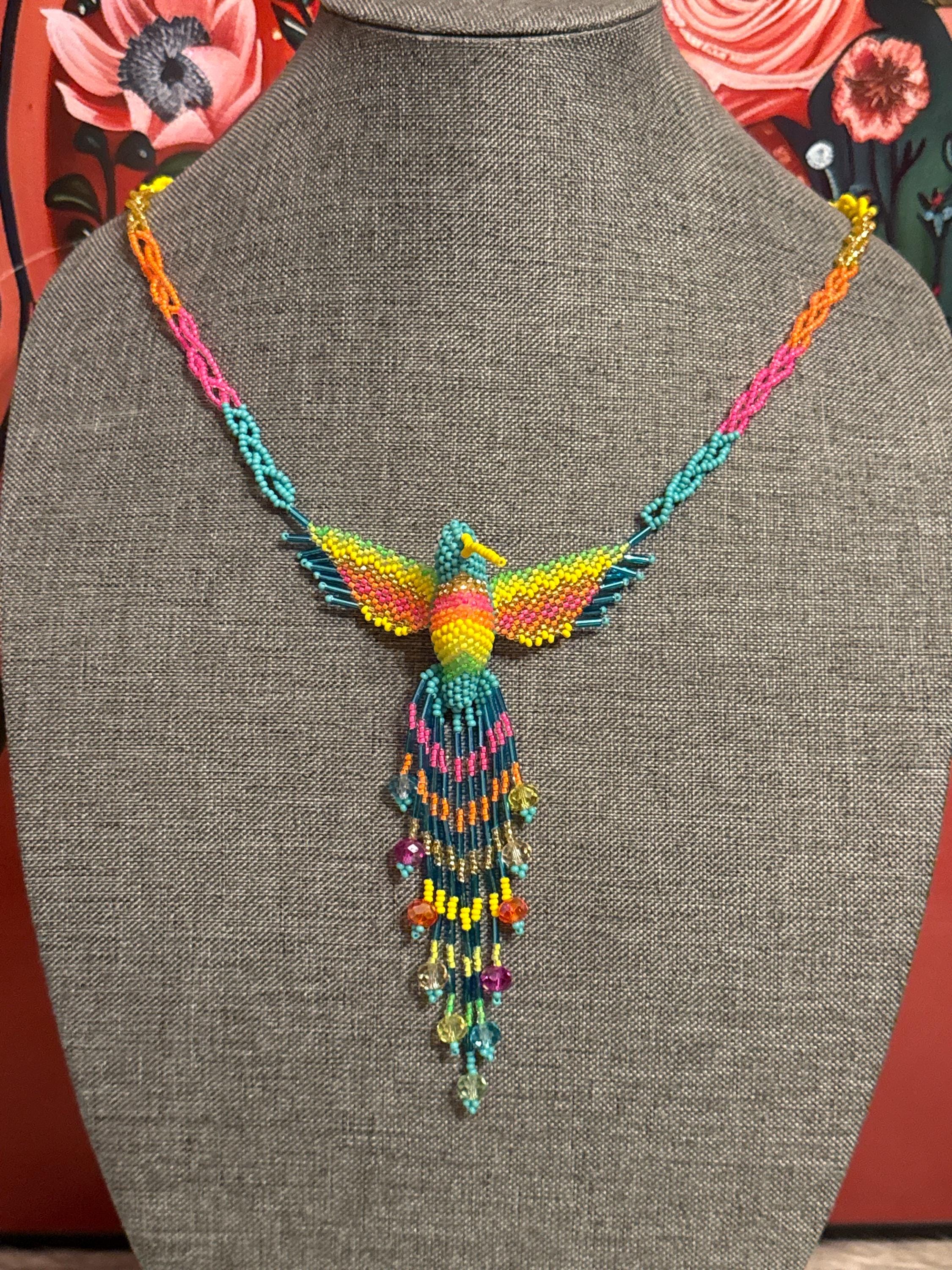 Hermoso collar colibrí hecho a mano por artesanos mexicanos.