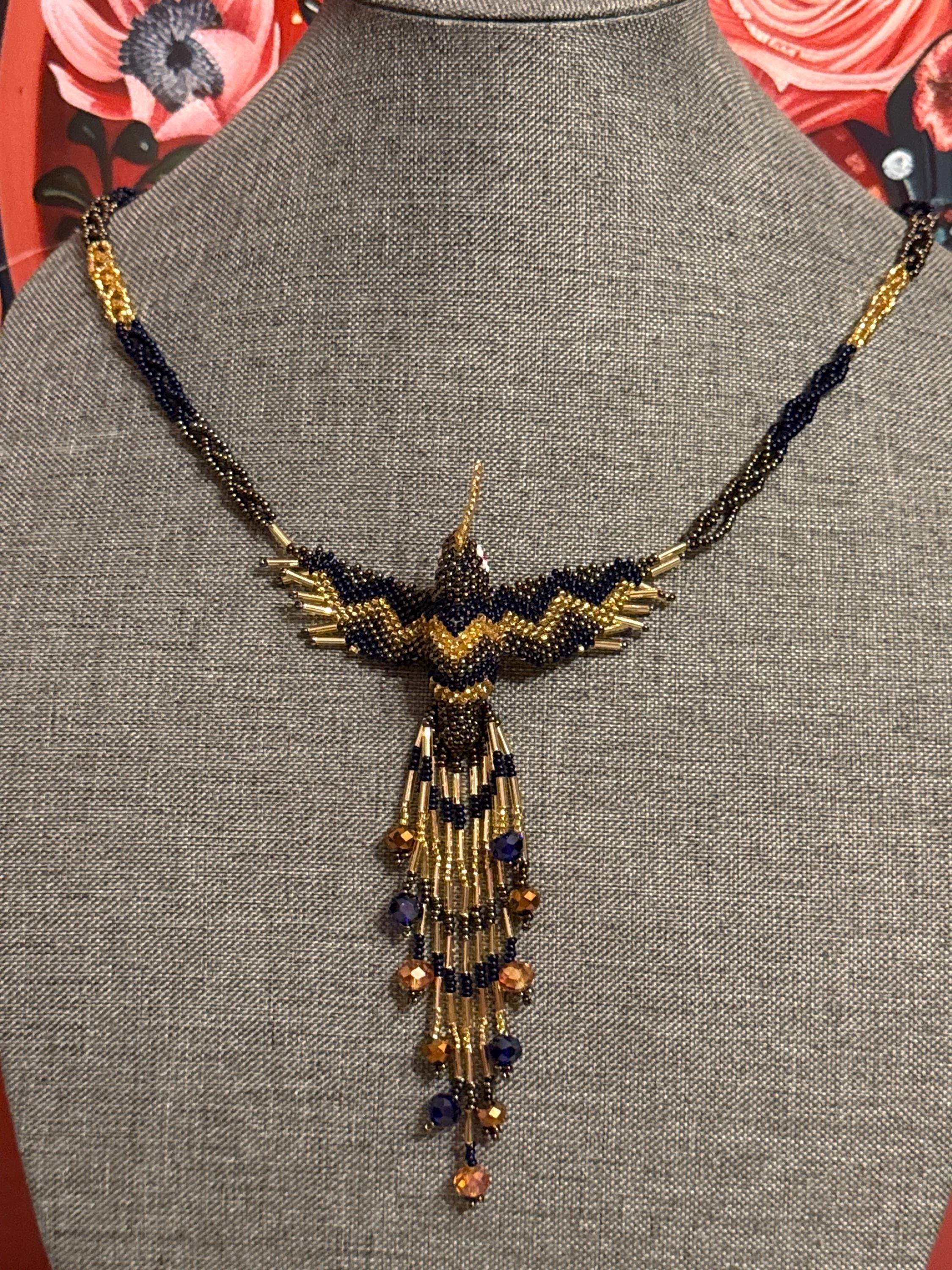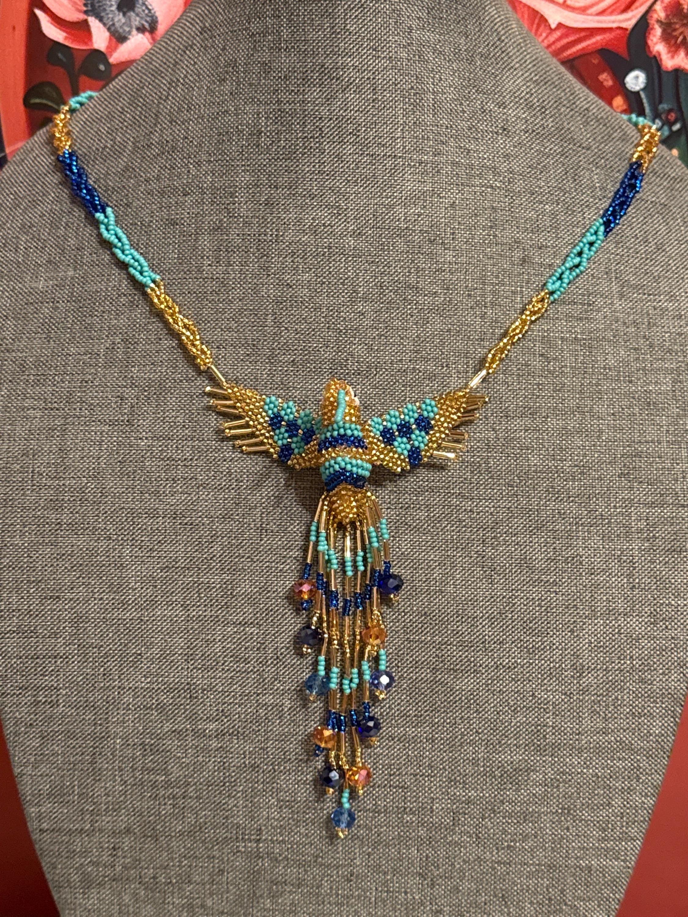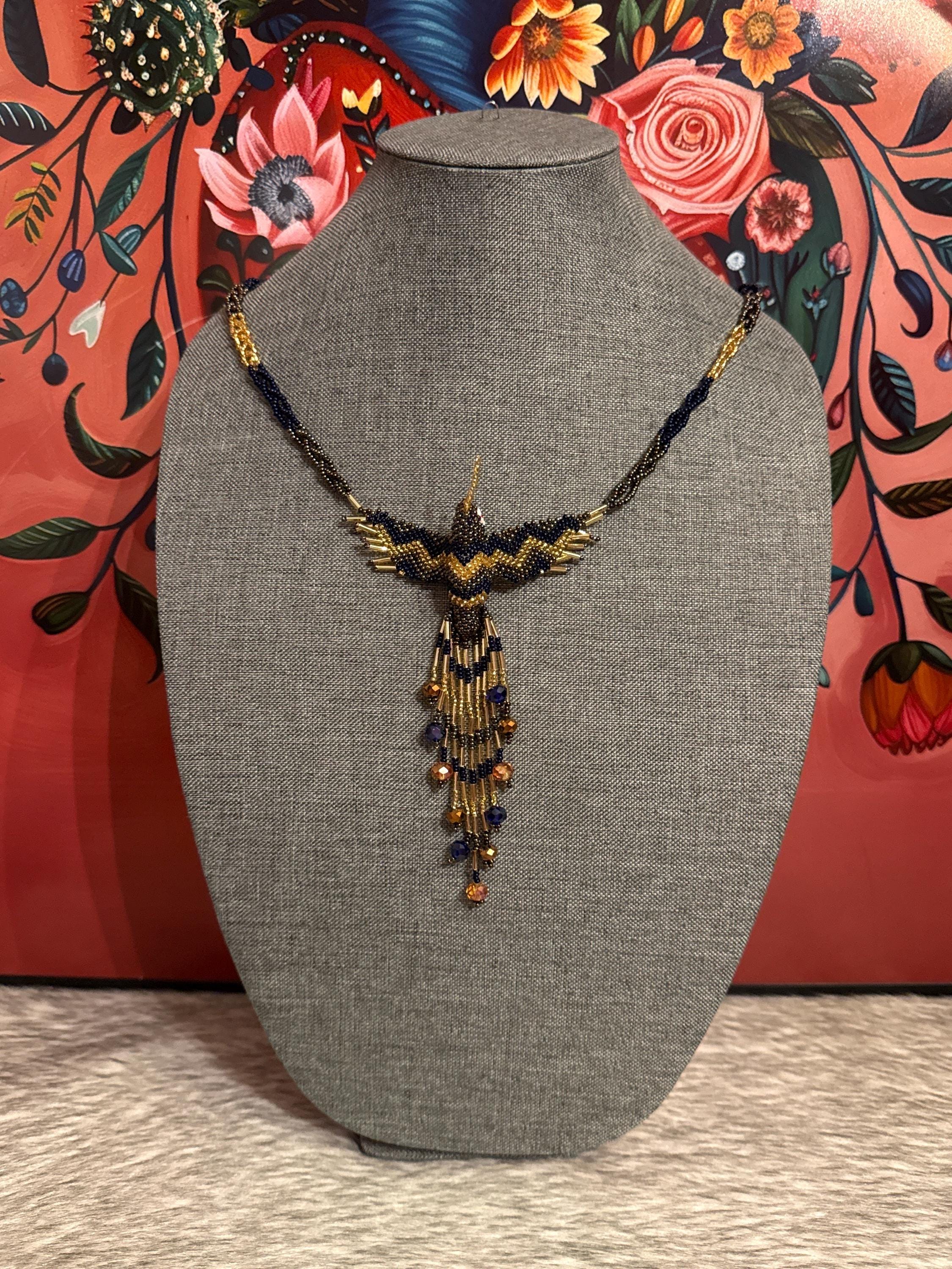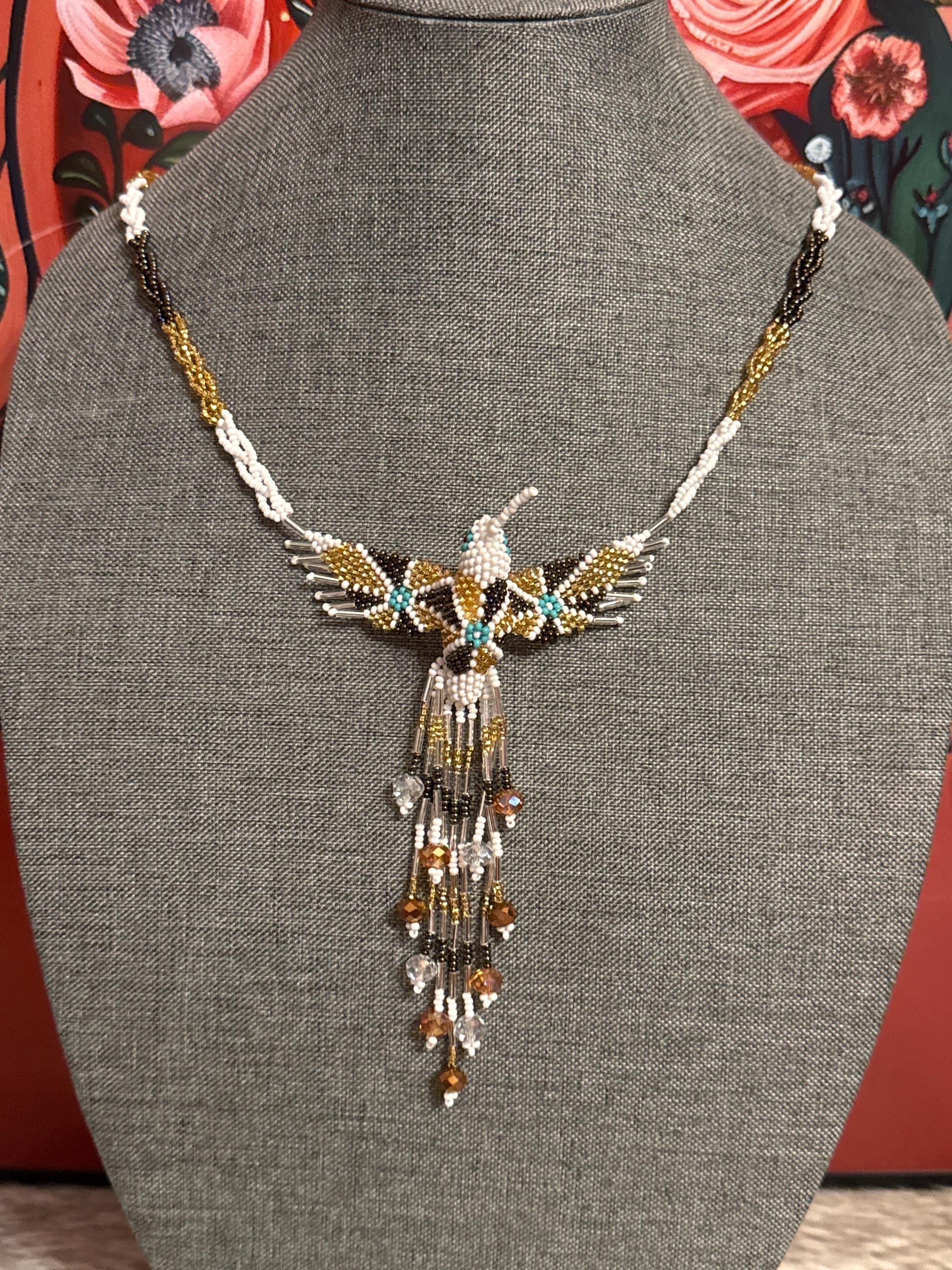 Hermoso collar colibrí hecho a mano por artesanos mexicanos.
