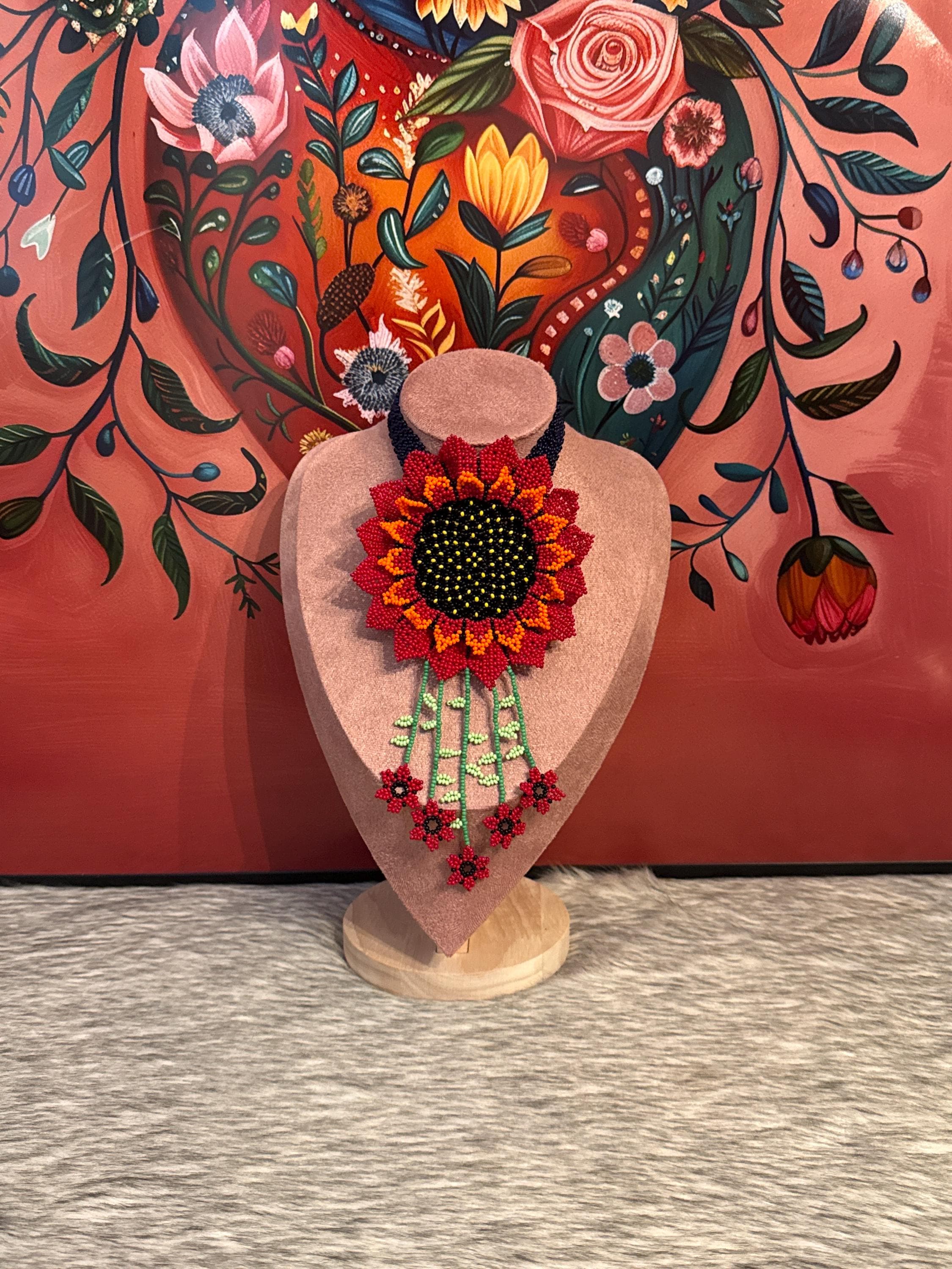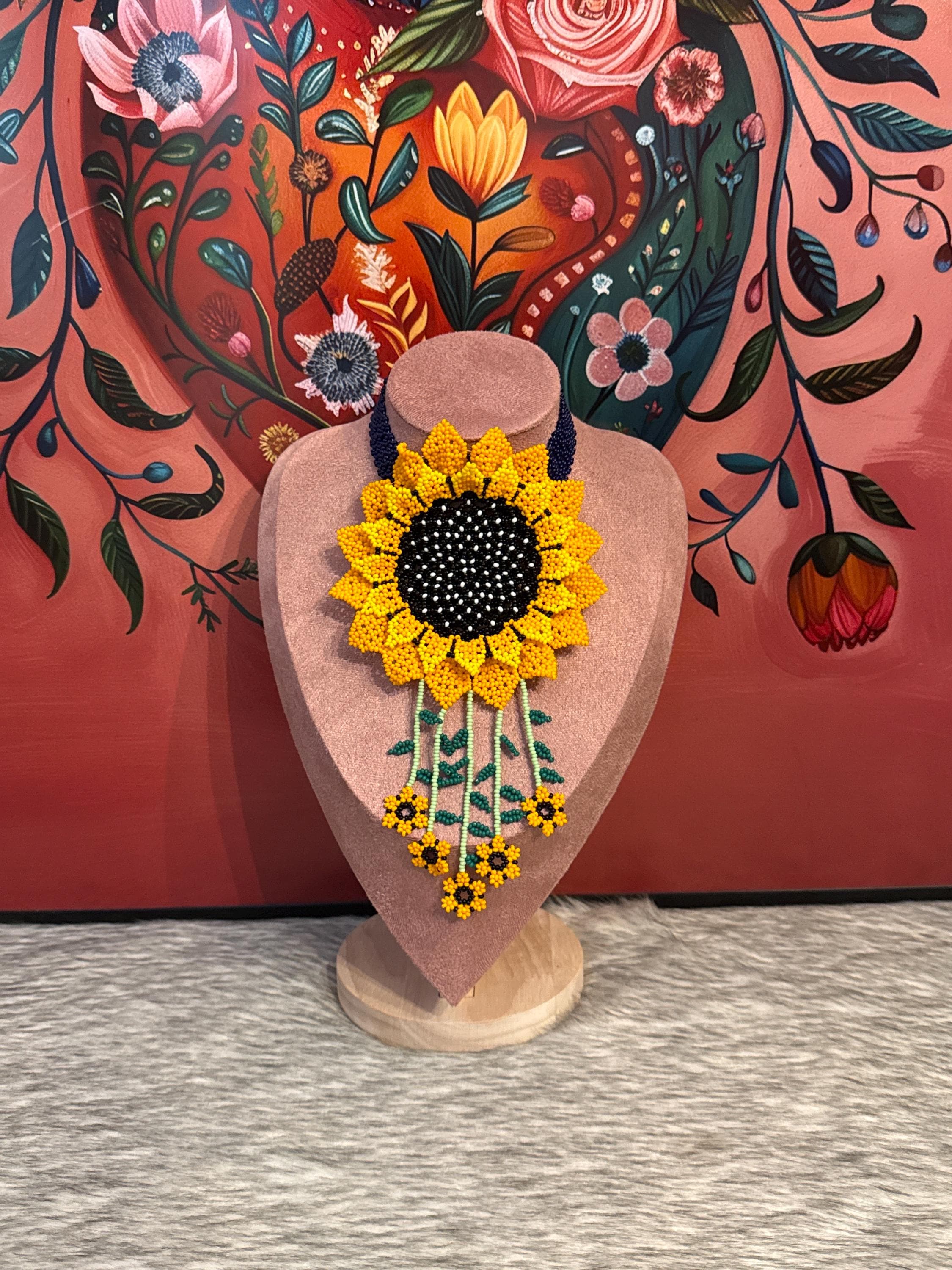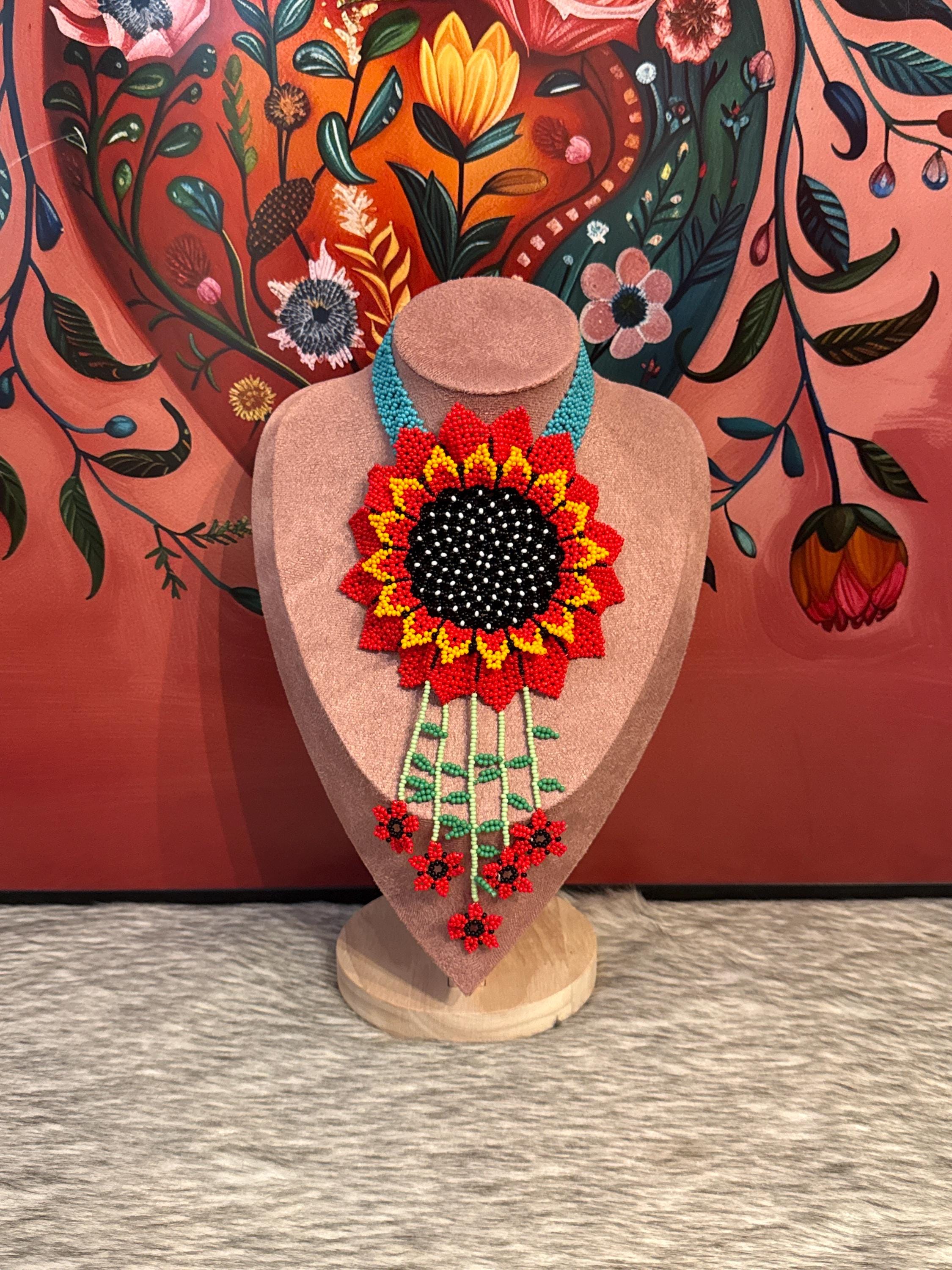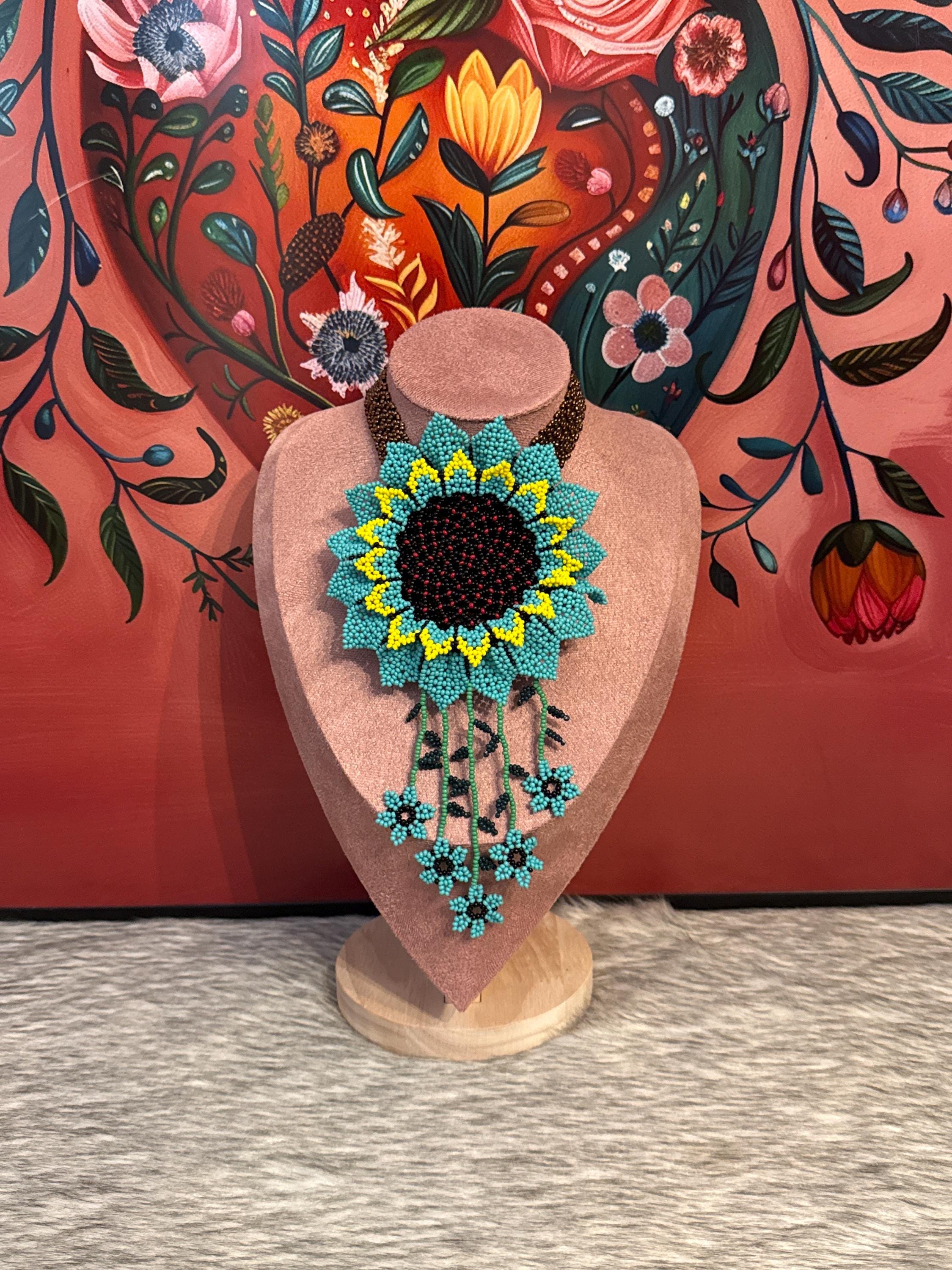 Beautiful handmade sunflower necklace set with crystal beads, the set includes earrings and a bracelet. Handmade by Mexican artisans.