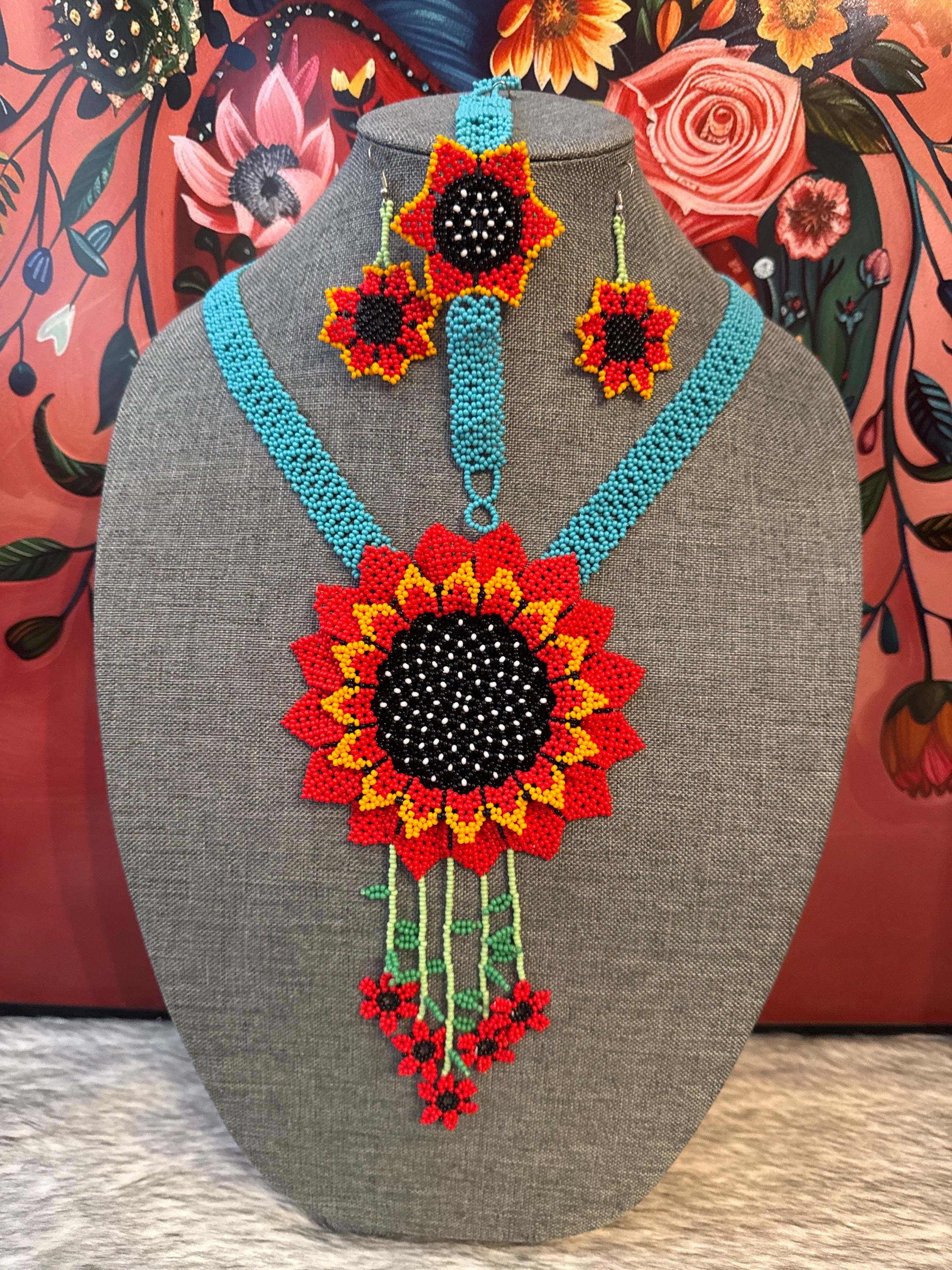 Beautiful handmade sunflower necklace set with crystal beads, the set includes earrings and a bracelet. Handmade by Mexican artisans.