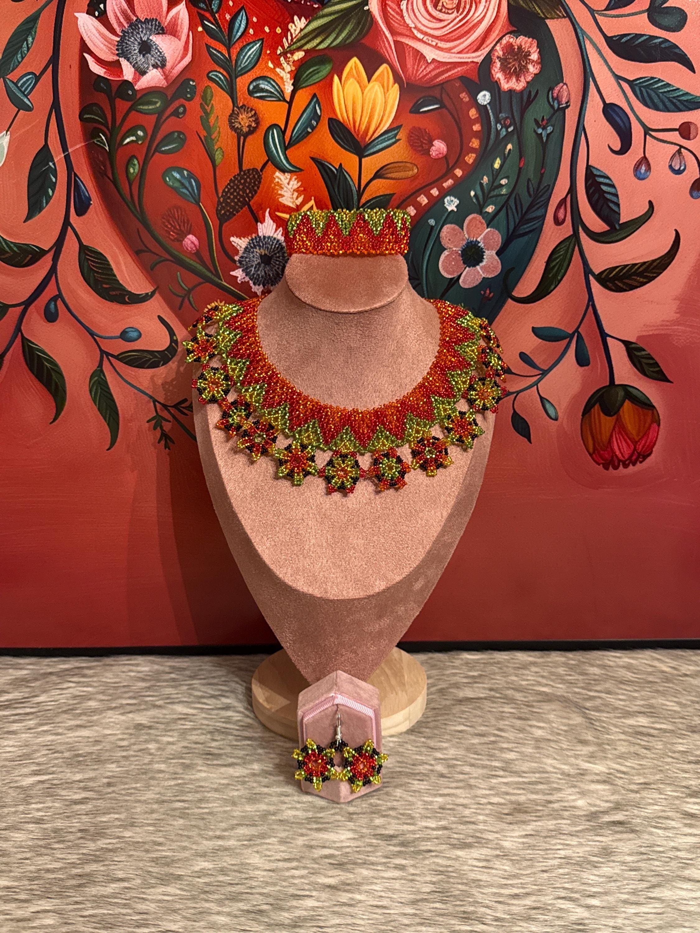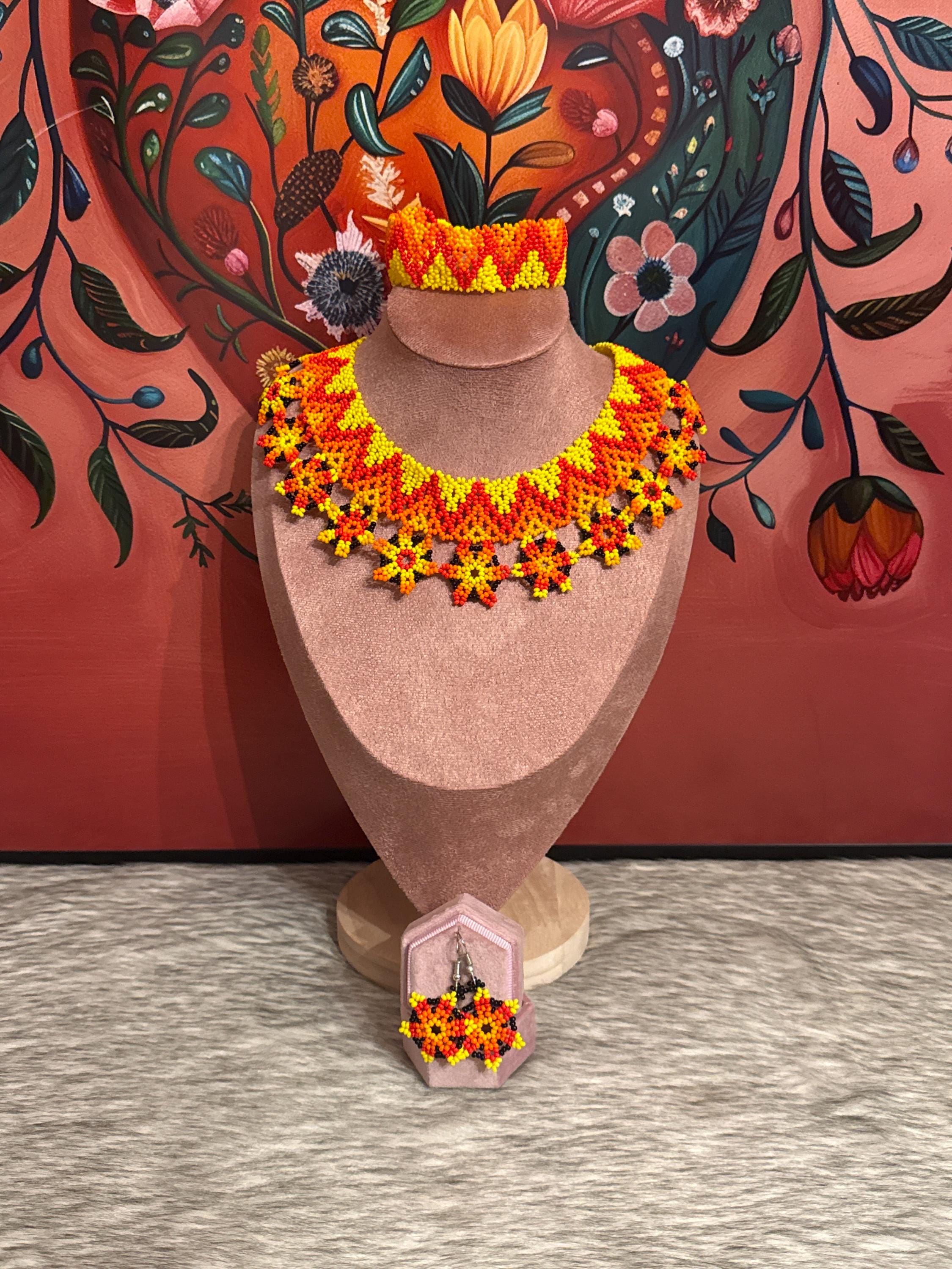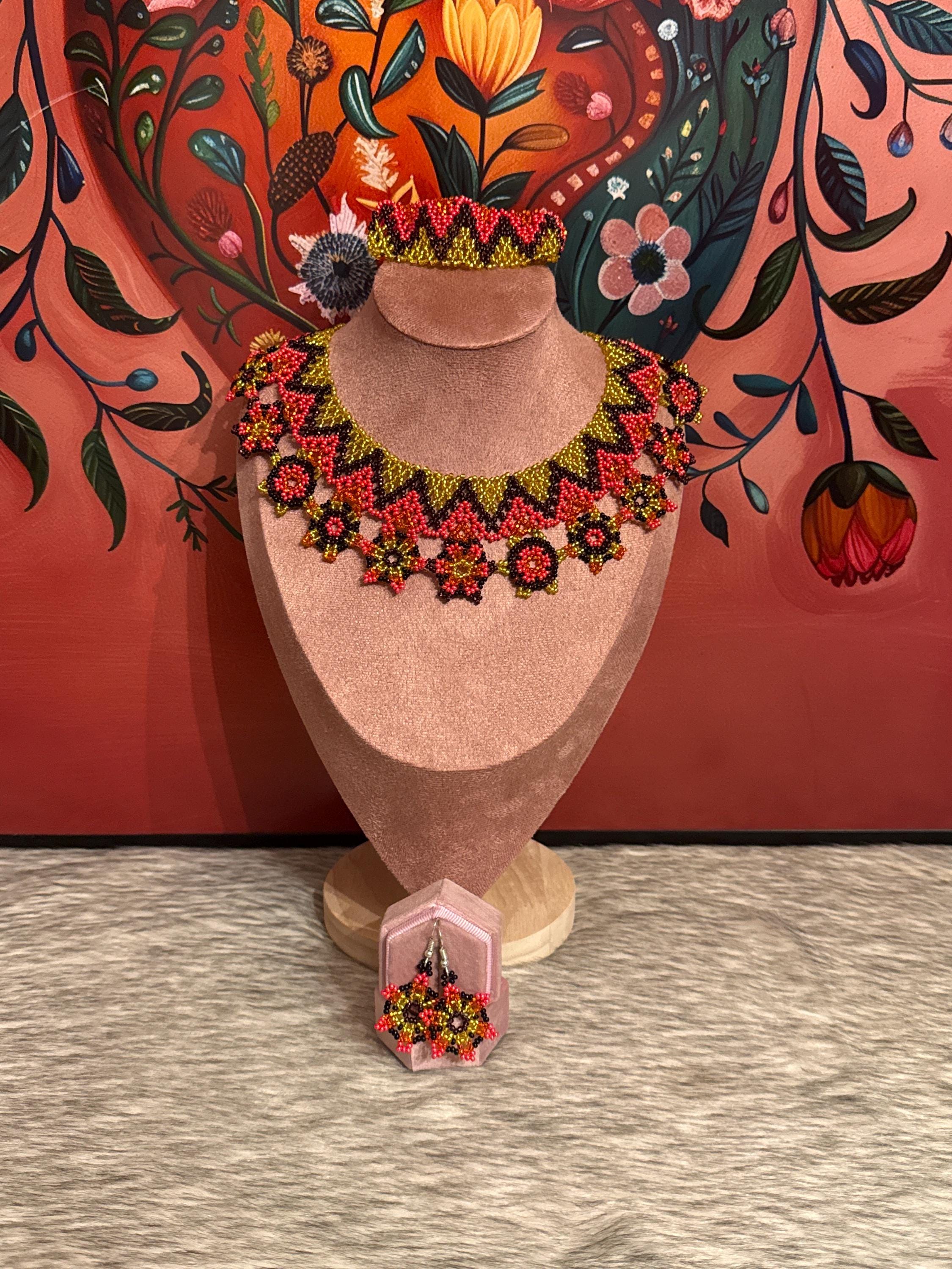Beautiful bib-style necklace set with earrings and a bracelet, handmade by Mexican artisans.
