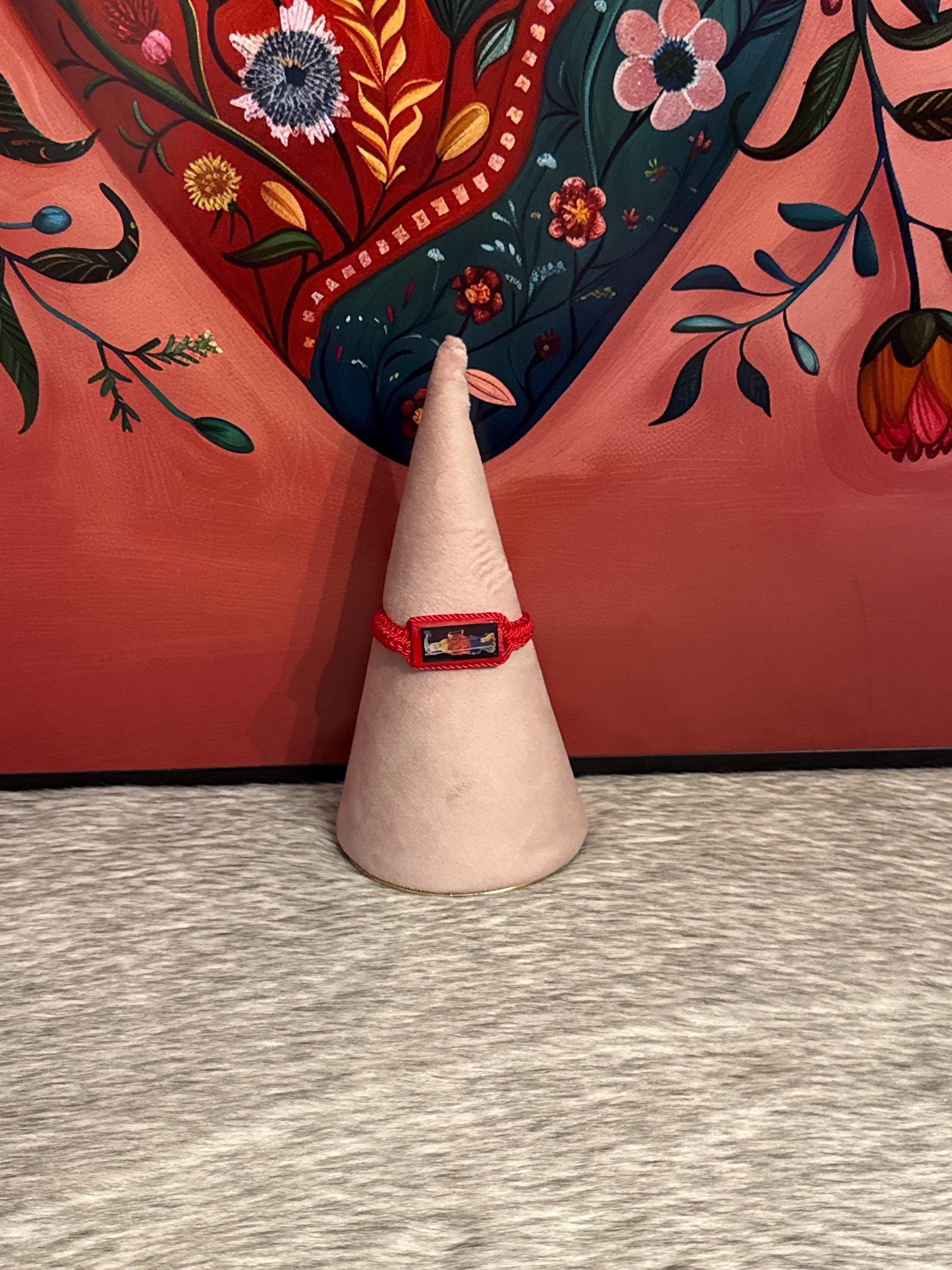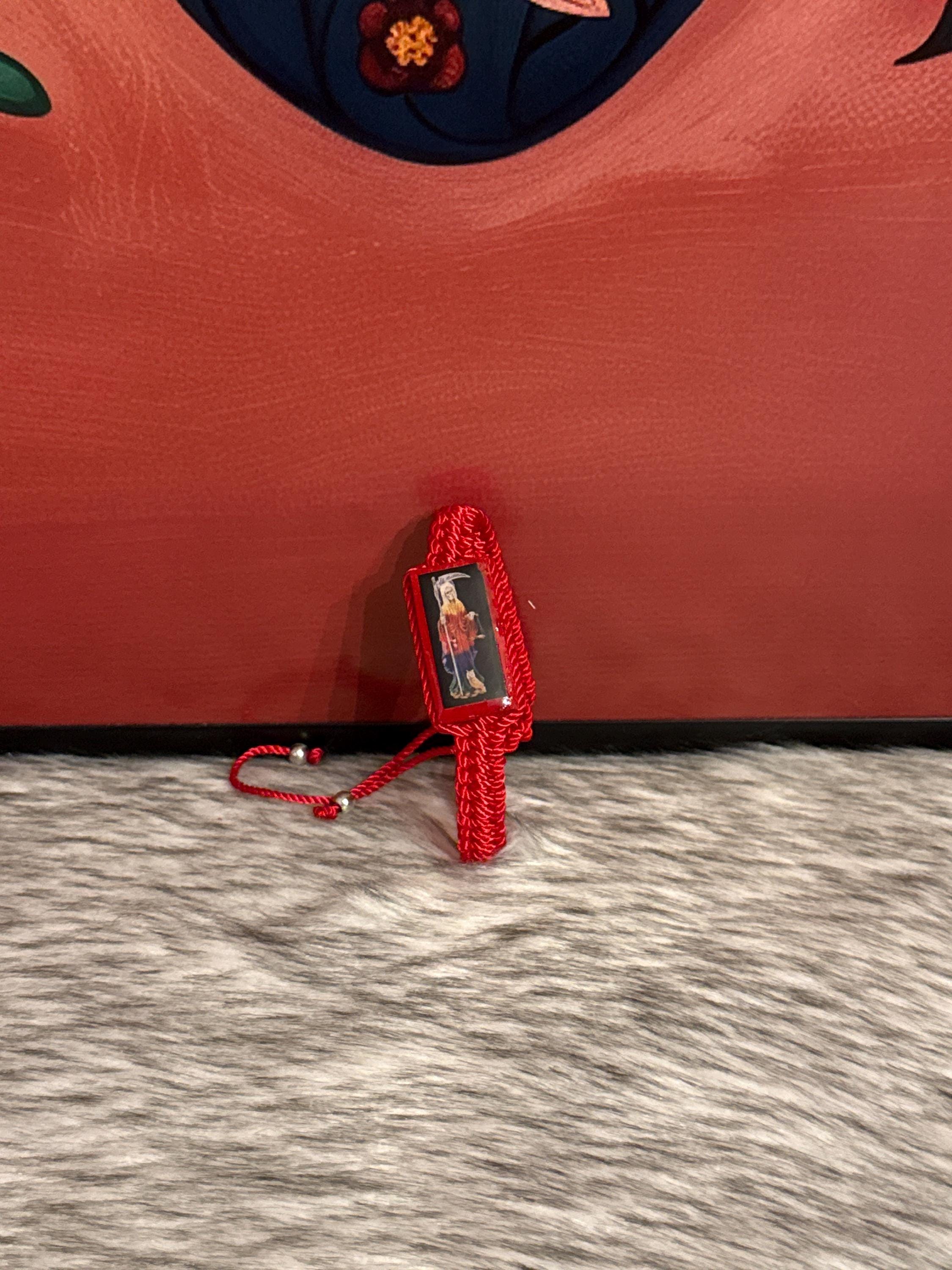 Bracelet woven with waxed red thread with a wooden image of Santa Muerte.