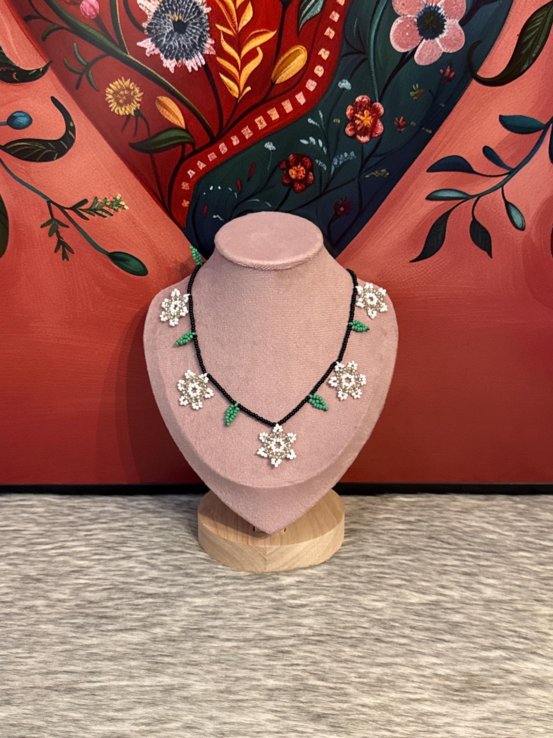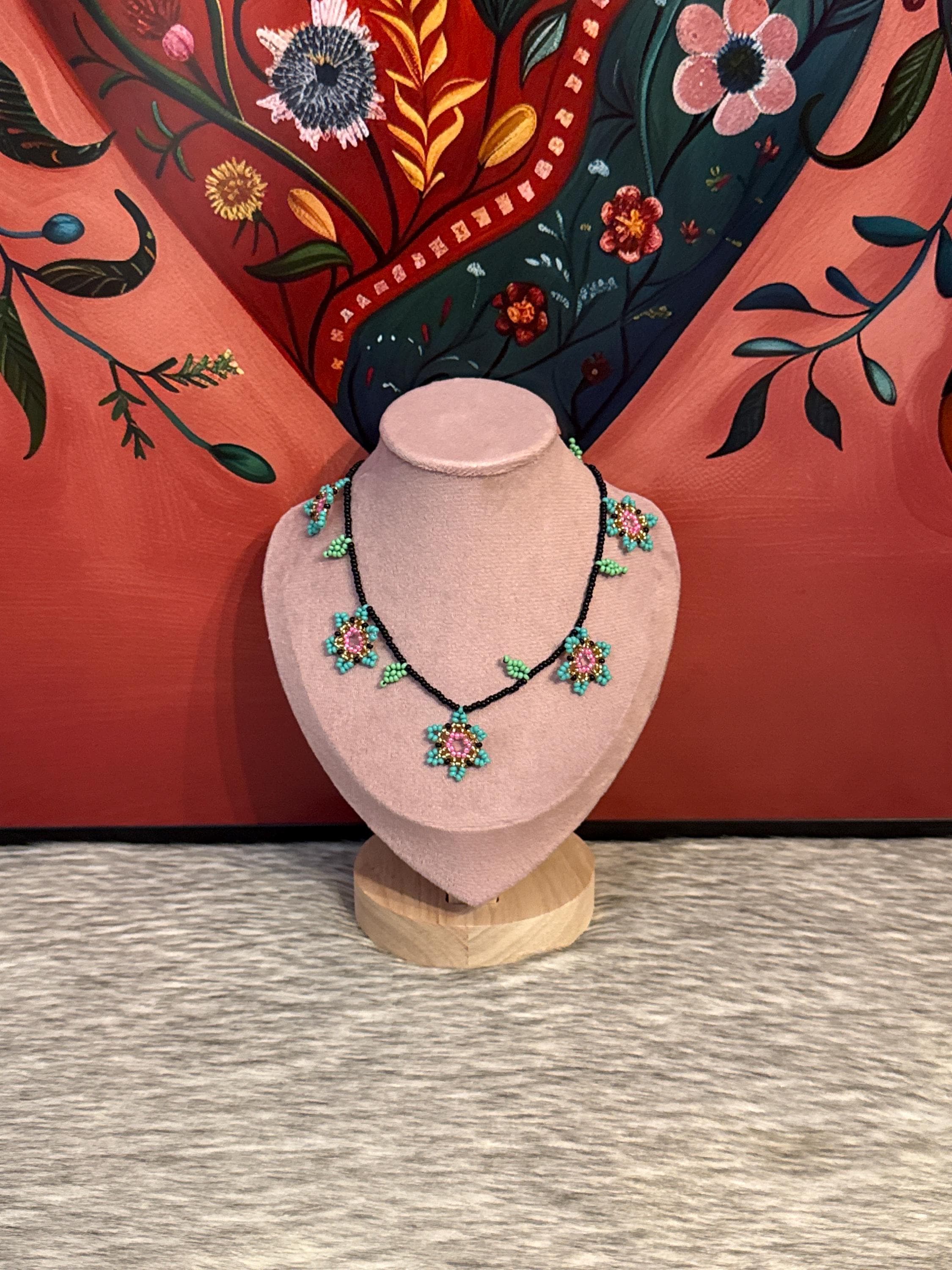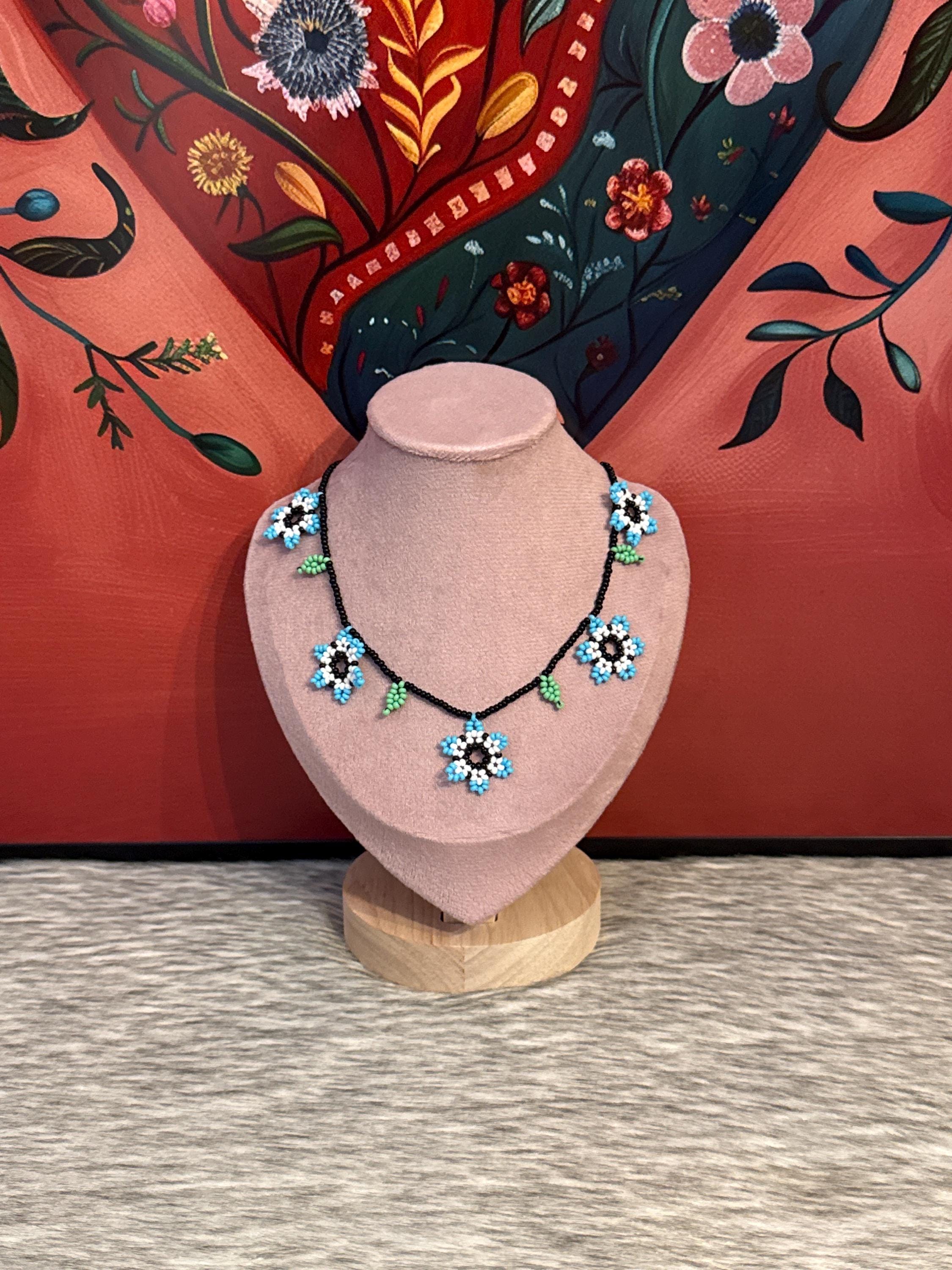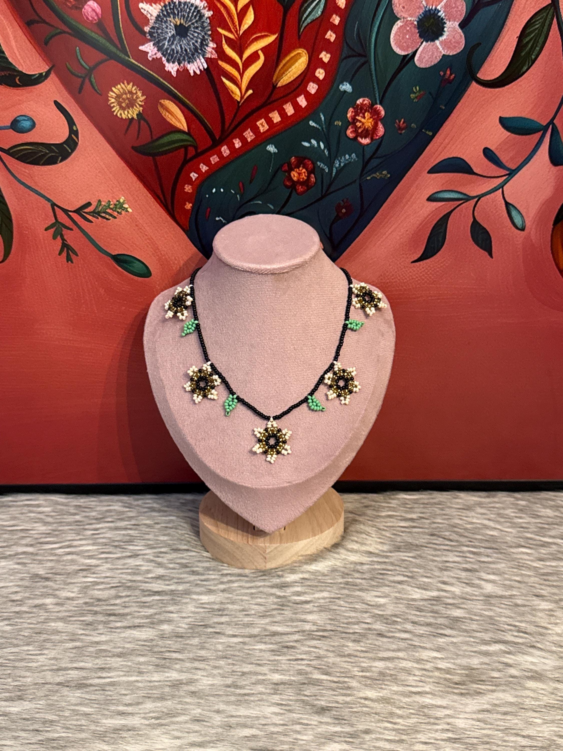 Beautiful choker style necklace set with 5 flowers and earrings, handmade by Mexican artisans.