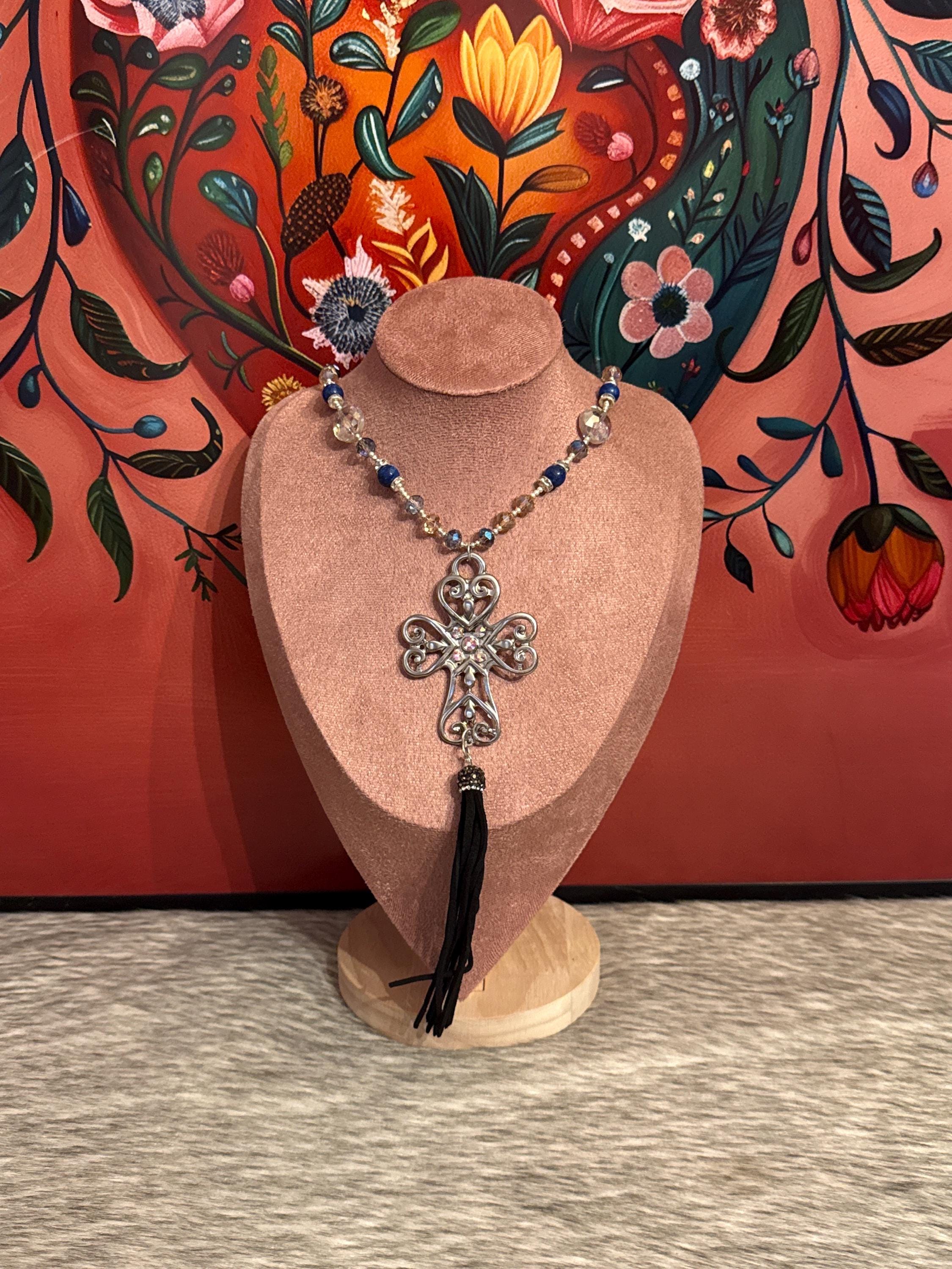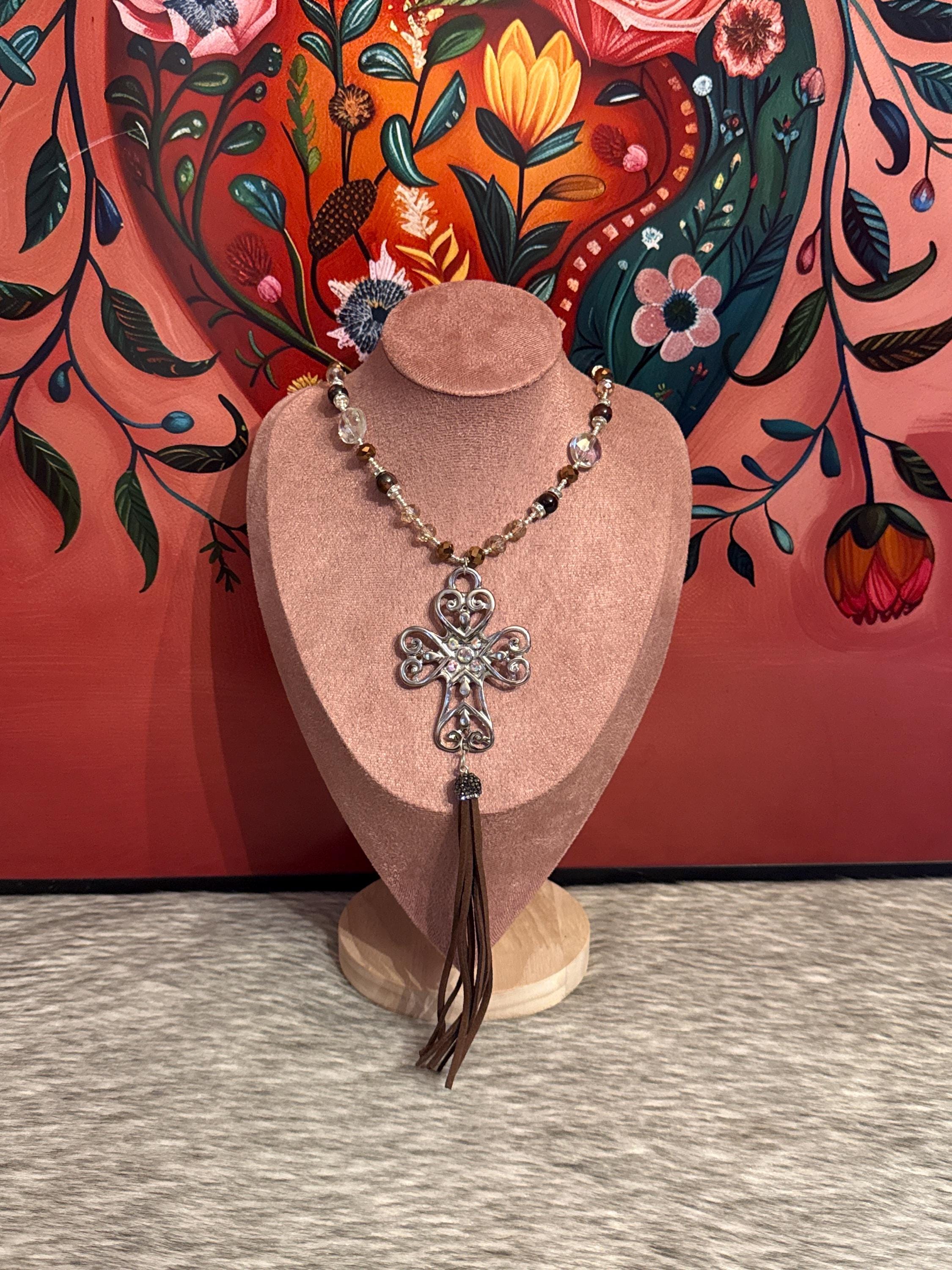 Cross necklace set with natural agates and Czech crystals, including agate and crystal earrings.
