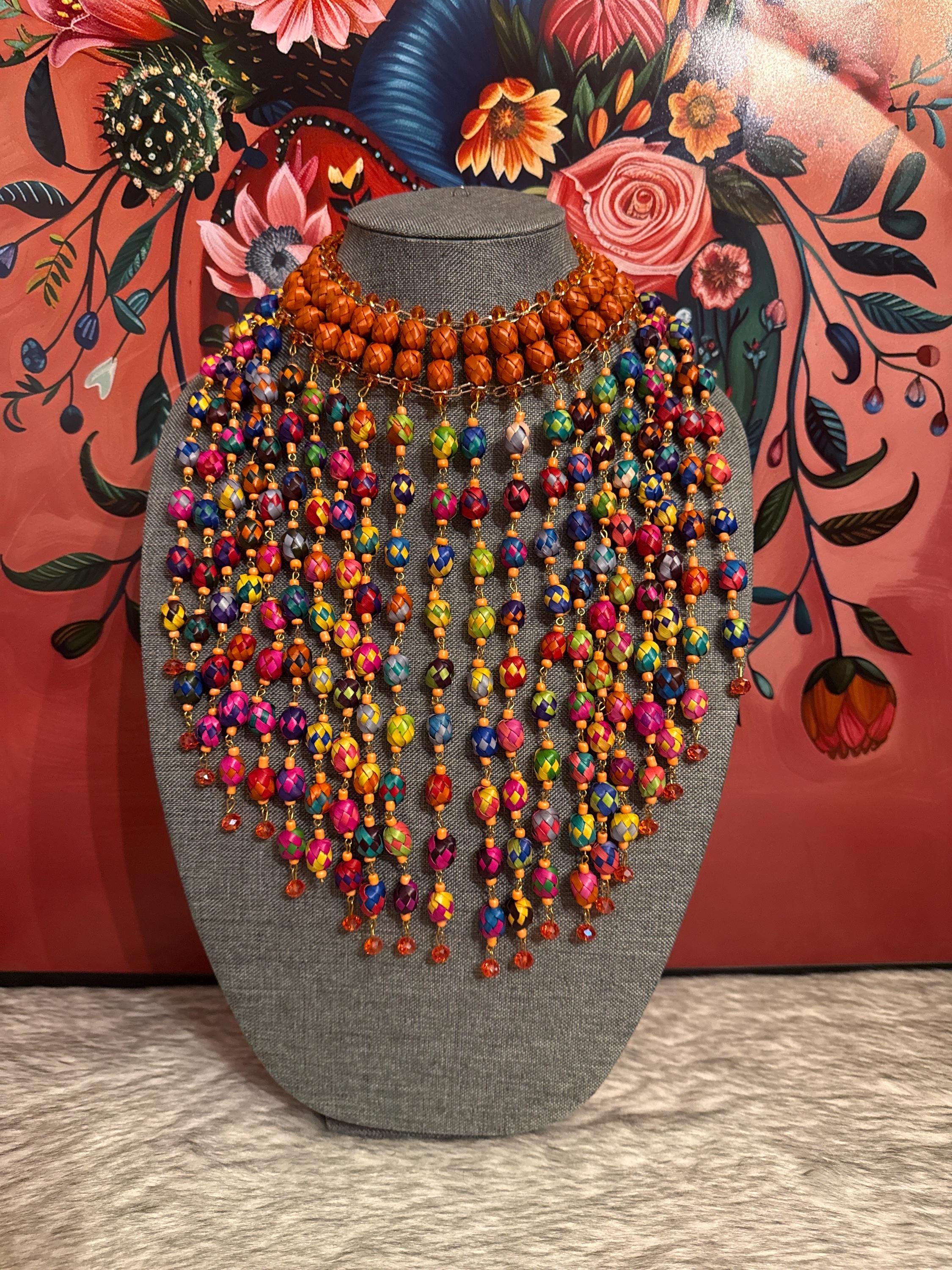 Beautiful handmade necklaces with palm leaves and barrel-shaped crystals, made by Mexican artisans.
