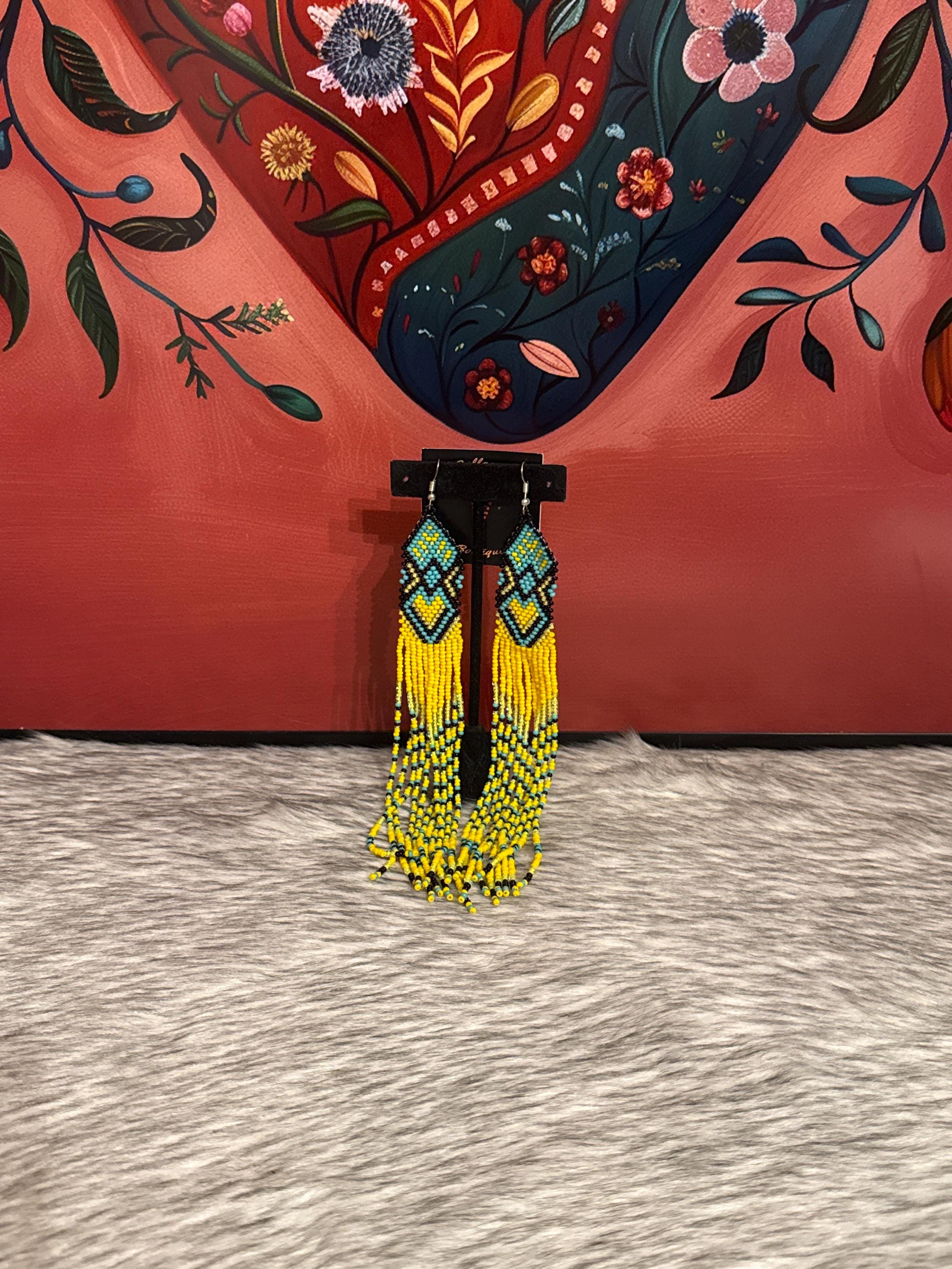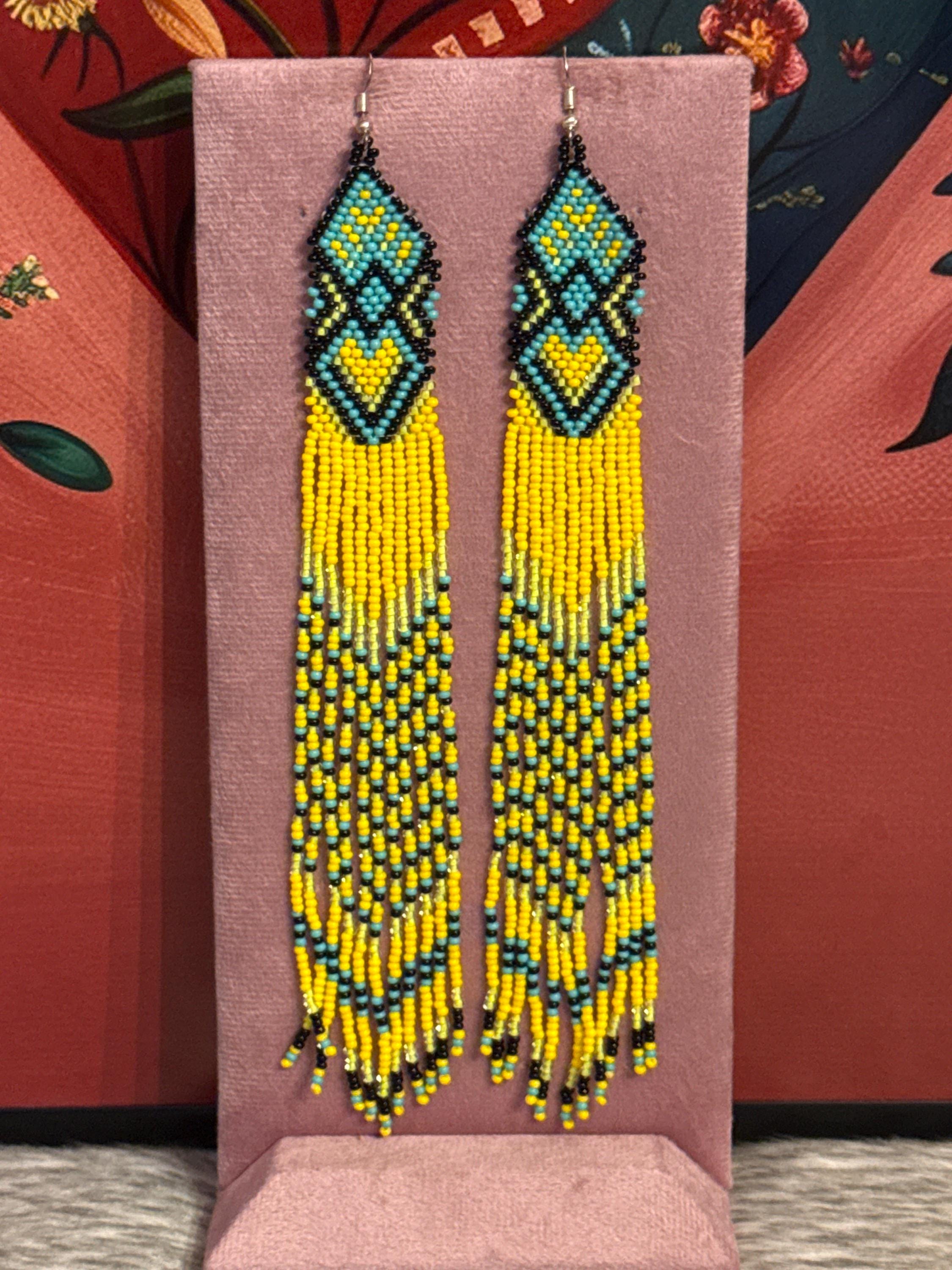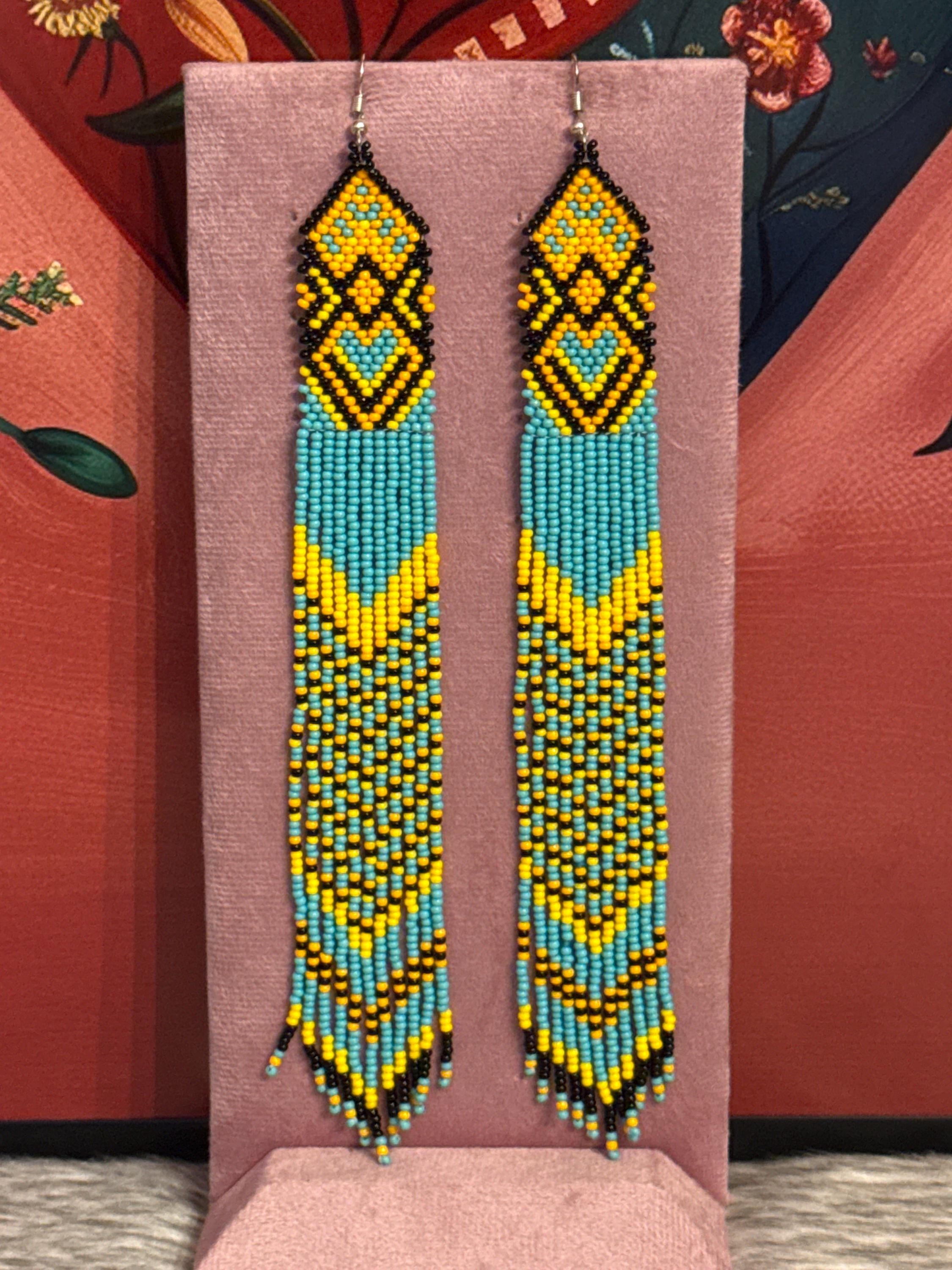 Beautiful long earrings handmade by Mexican artisans. The earrings measure approximately 7 inches long.