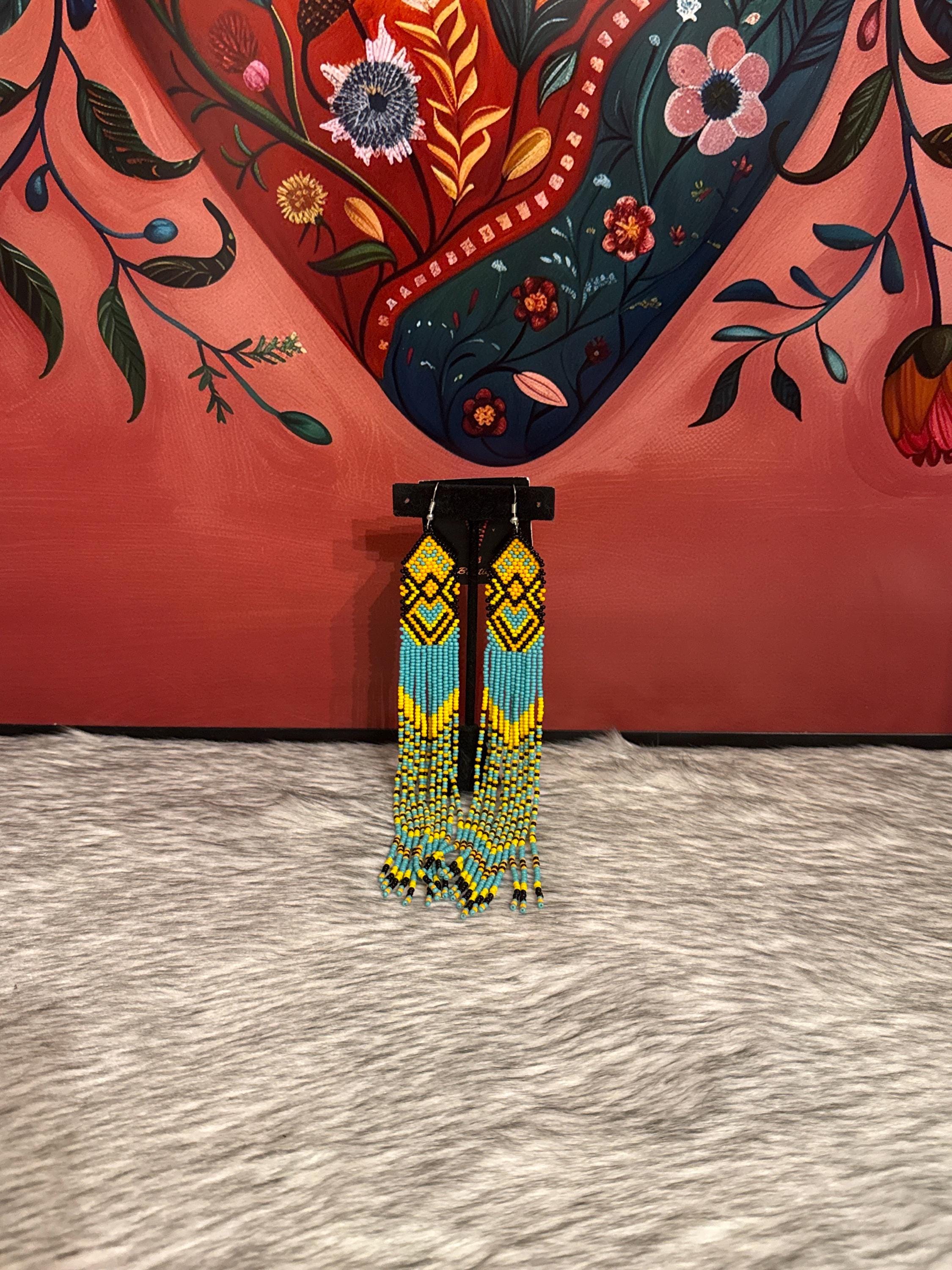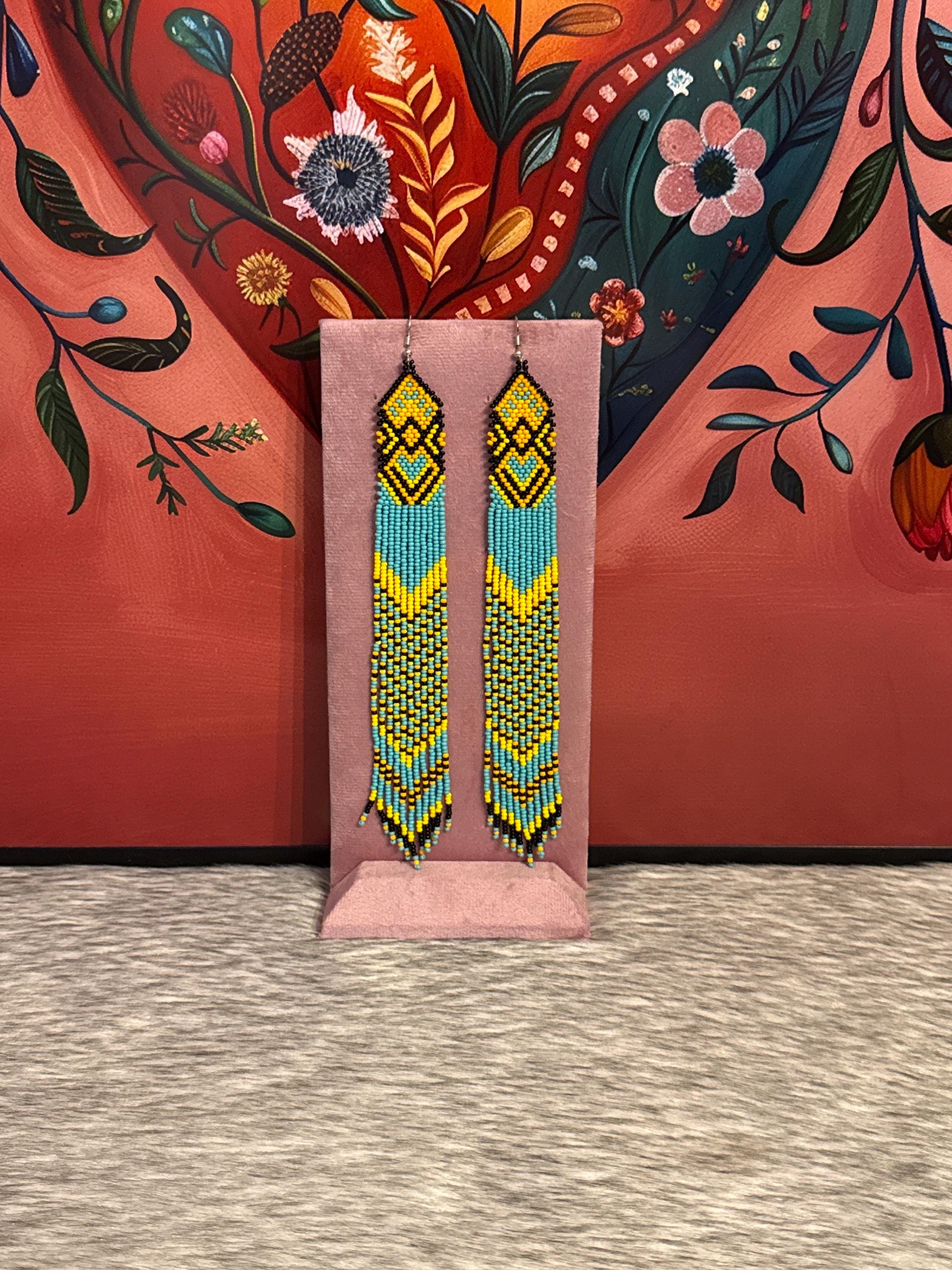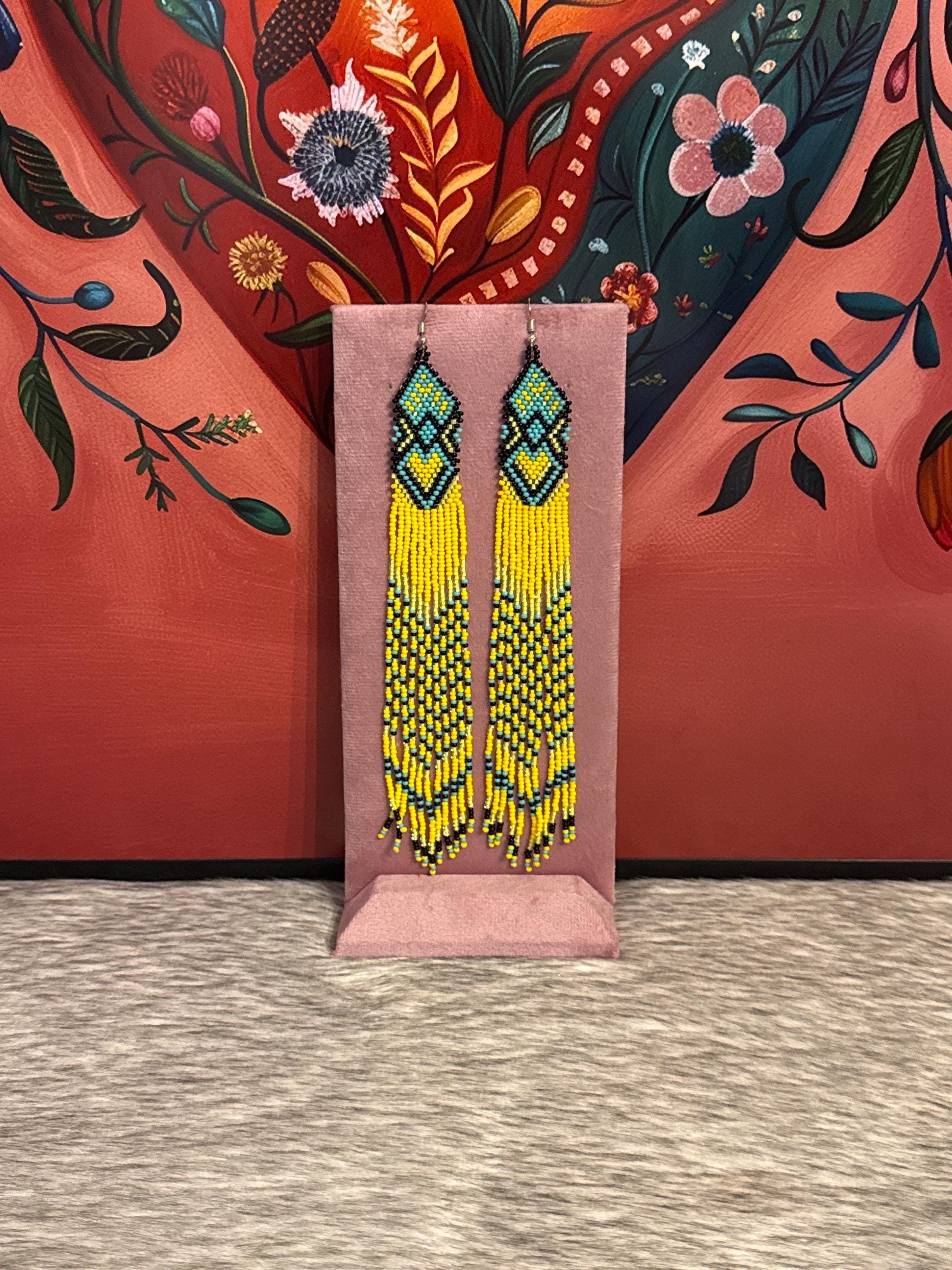 Beautiful long earrings handmade by Mexican artisans. The earrings measure approximately 7 inches long.