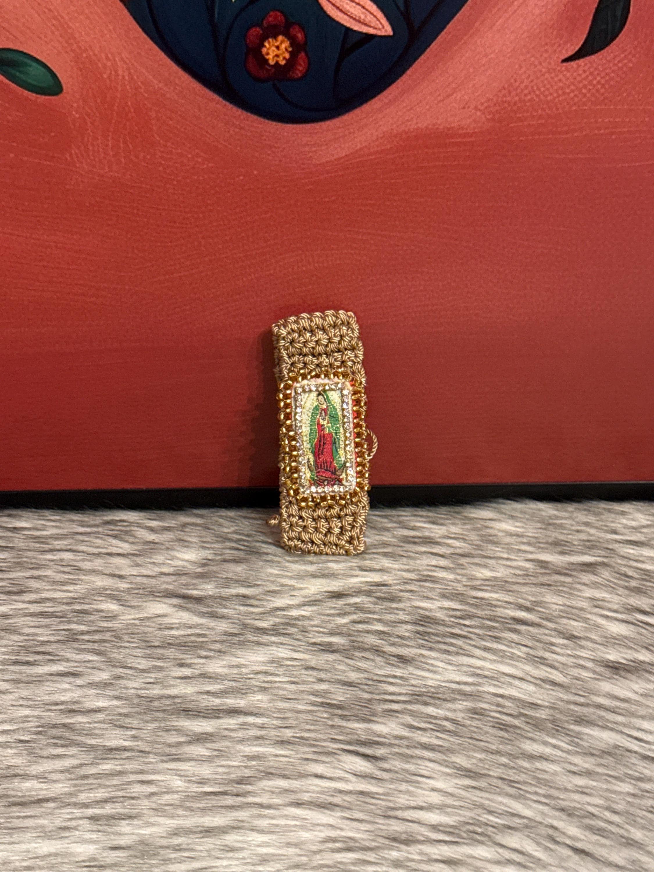 Beautiful adjustable macrame style bracelet, made with cotton thread and embroidered image of the Virgin of Guadalupe. To ensure your bracelet lasts a long time, we recommend avoiding getting it wet and storing it in a cool, dry place.