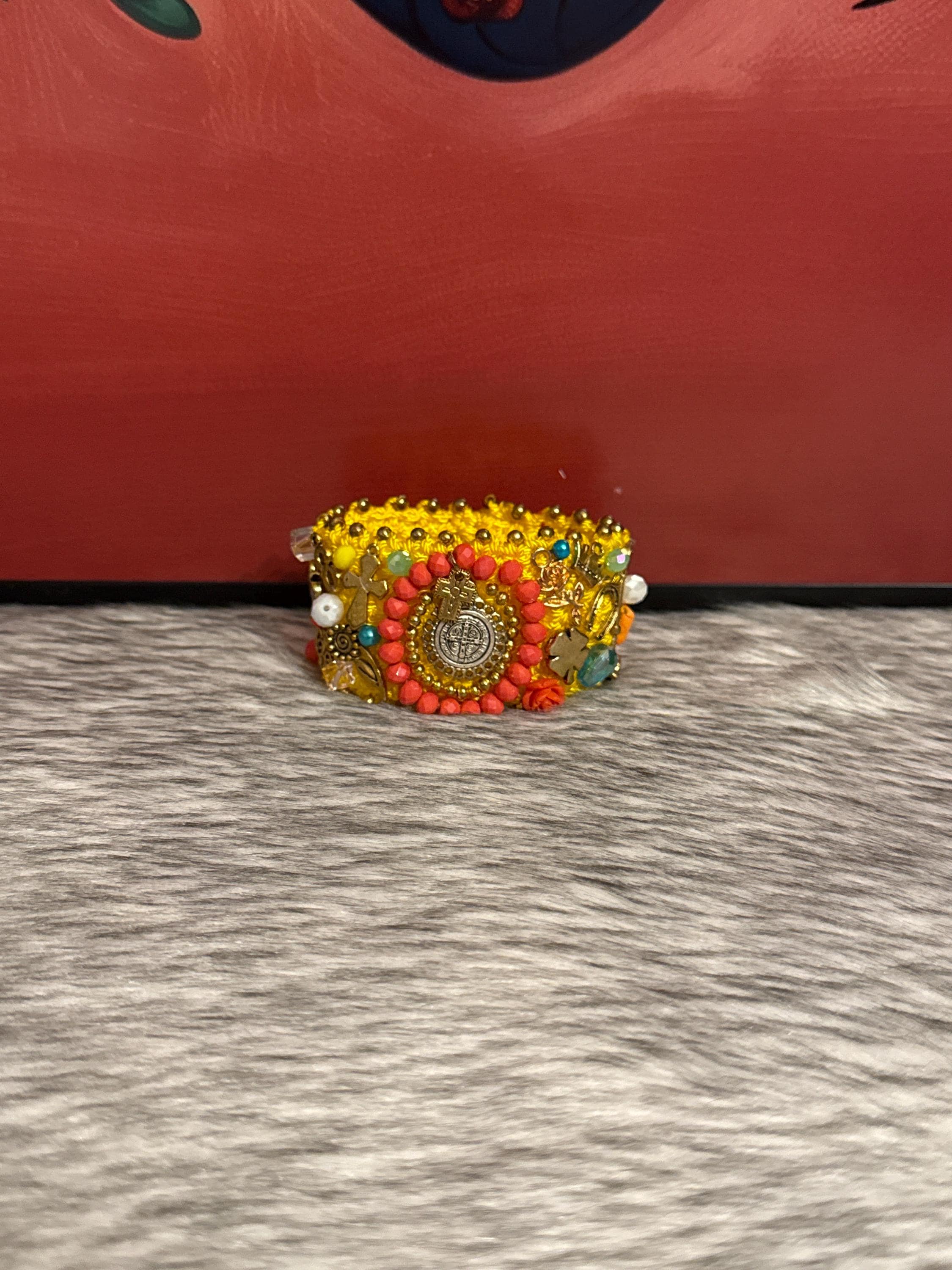 Beautiful macrame-style embroidered bracelet made with cotton thread, featuring a St. Benedict medal and various gold-plated charms, pearls, and crystals. The bracelet measures approximately 7.5 inches long by 1.25 inches wide. To ensure your bracelet lasts a long time, we recommend avoiding getting it wet and storing it in a cool, dry place.
