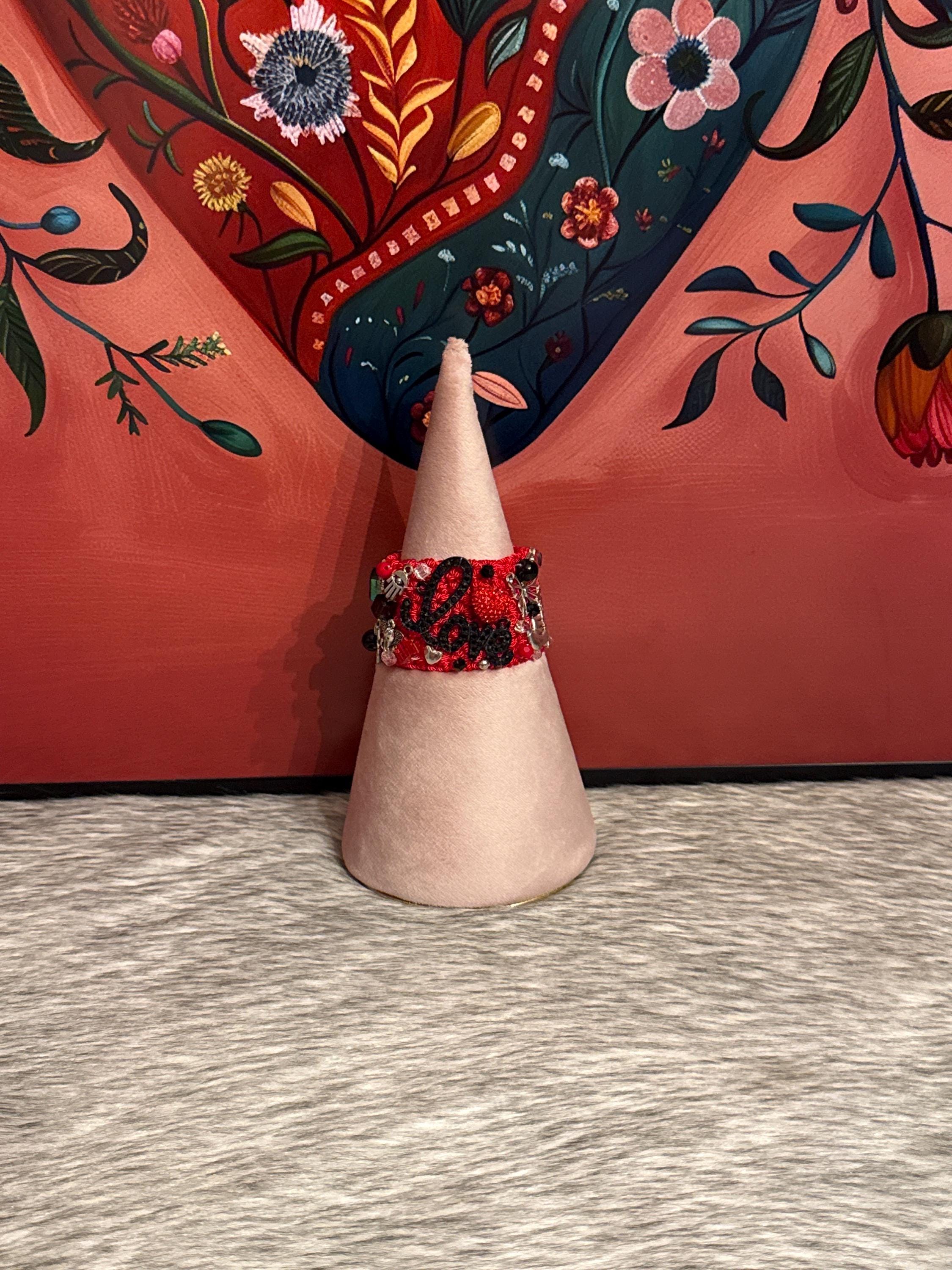 Beautiful macrame-style embroidered bracelet made with cotton thread, featuring various gold-tone charms, pearls, and crystals. The bracelet measures approximately 7.5 inches long by 1.25 inches wide. To ensure your bracelet lasts a long time, we recommend avoiding getting it wet and storing it in a cool, dry place.