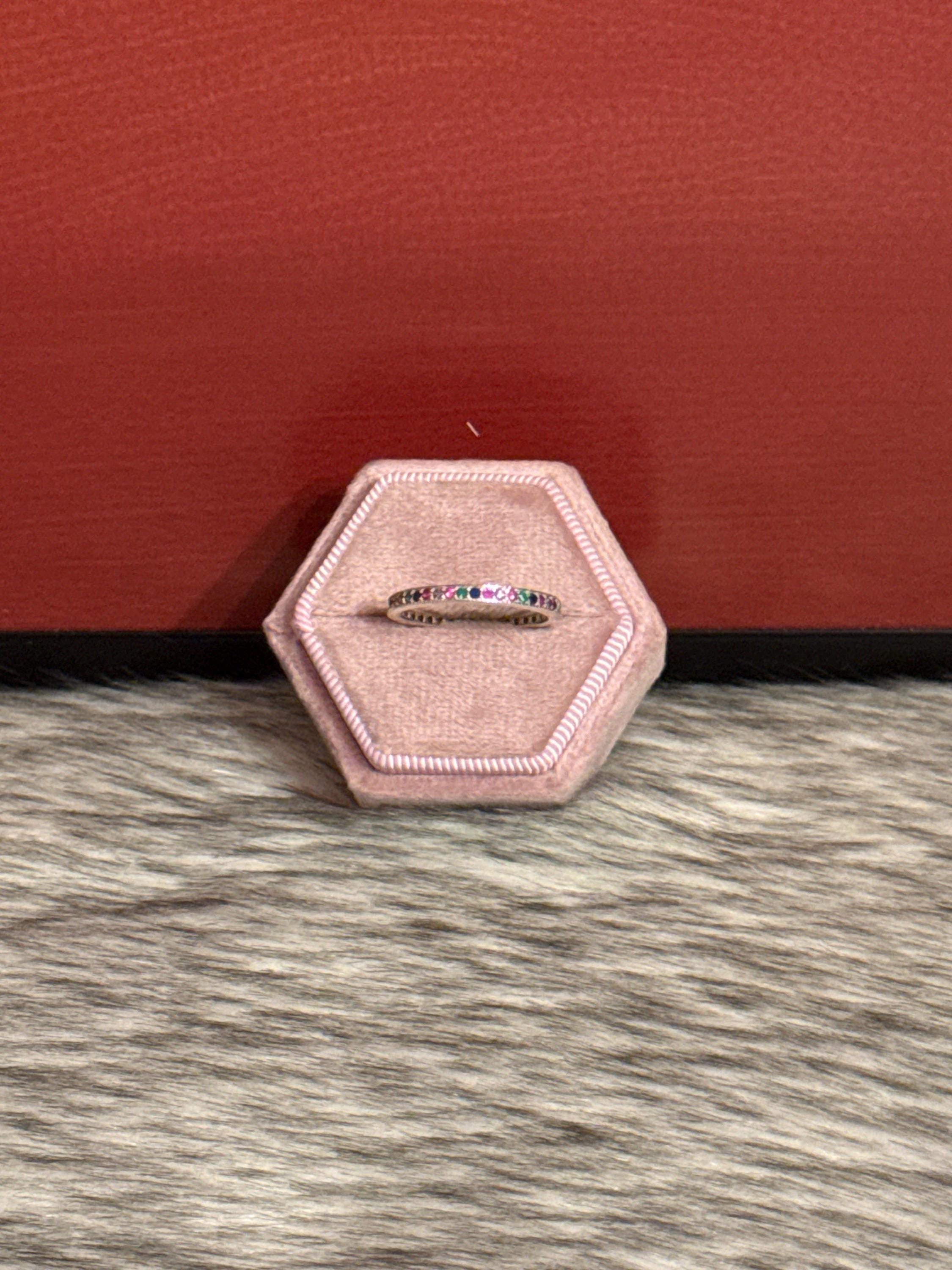 Beautiful eternity ring made of silver with small multicolored cubic zirconia stones. Size 8