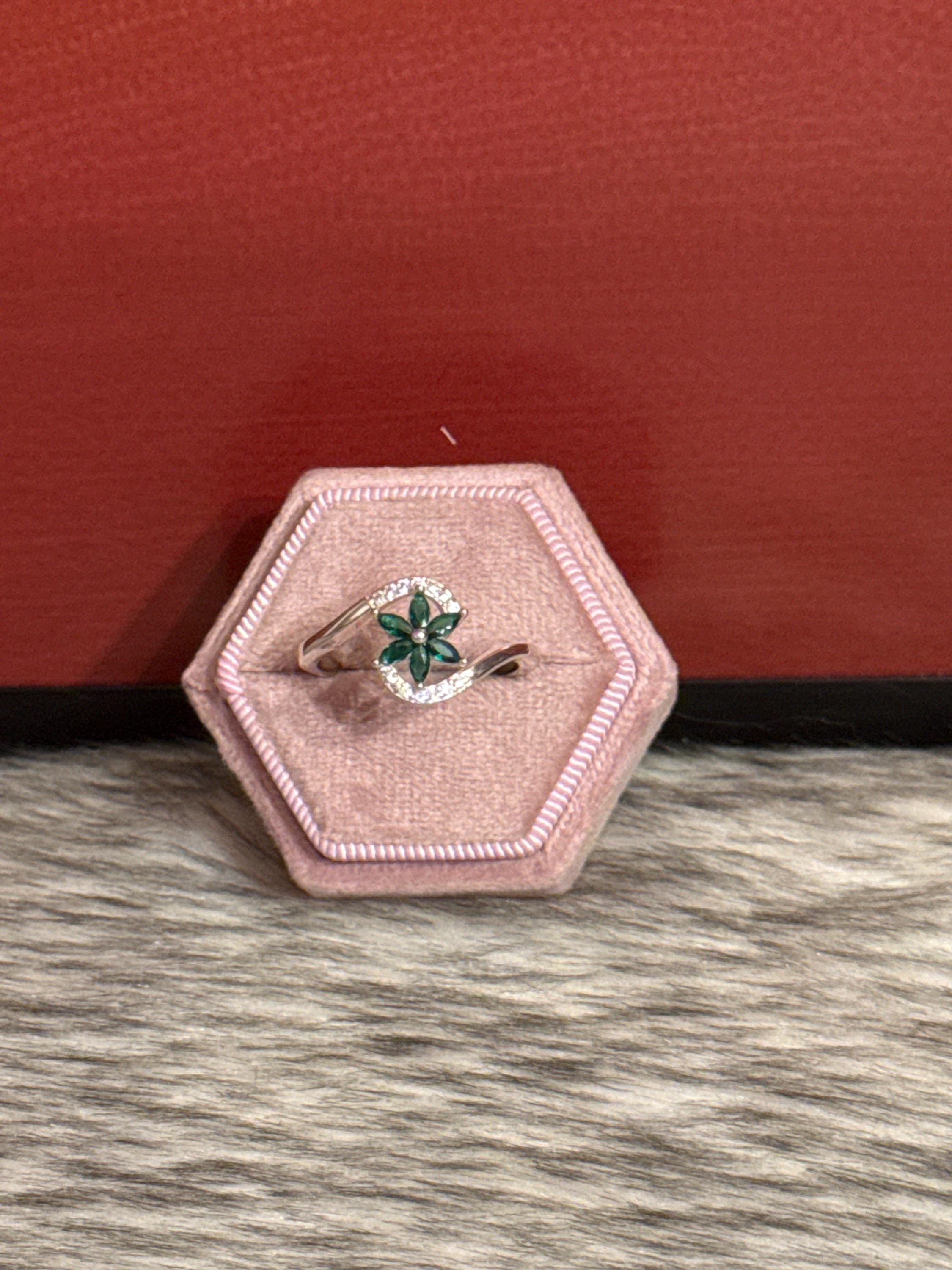 Beautiful green flower ring with small cubic zirconia stones around it, made of 925 sterling silver. Size 10