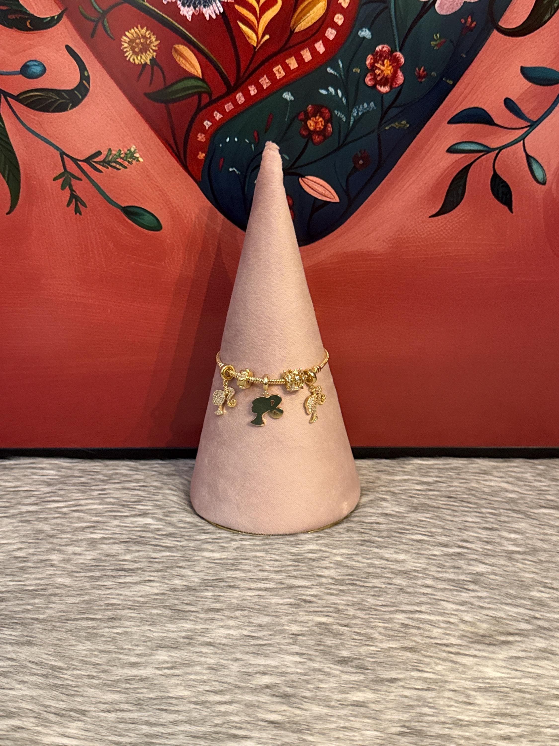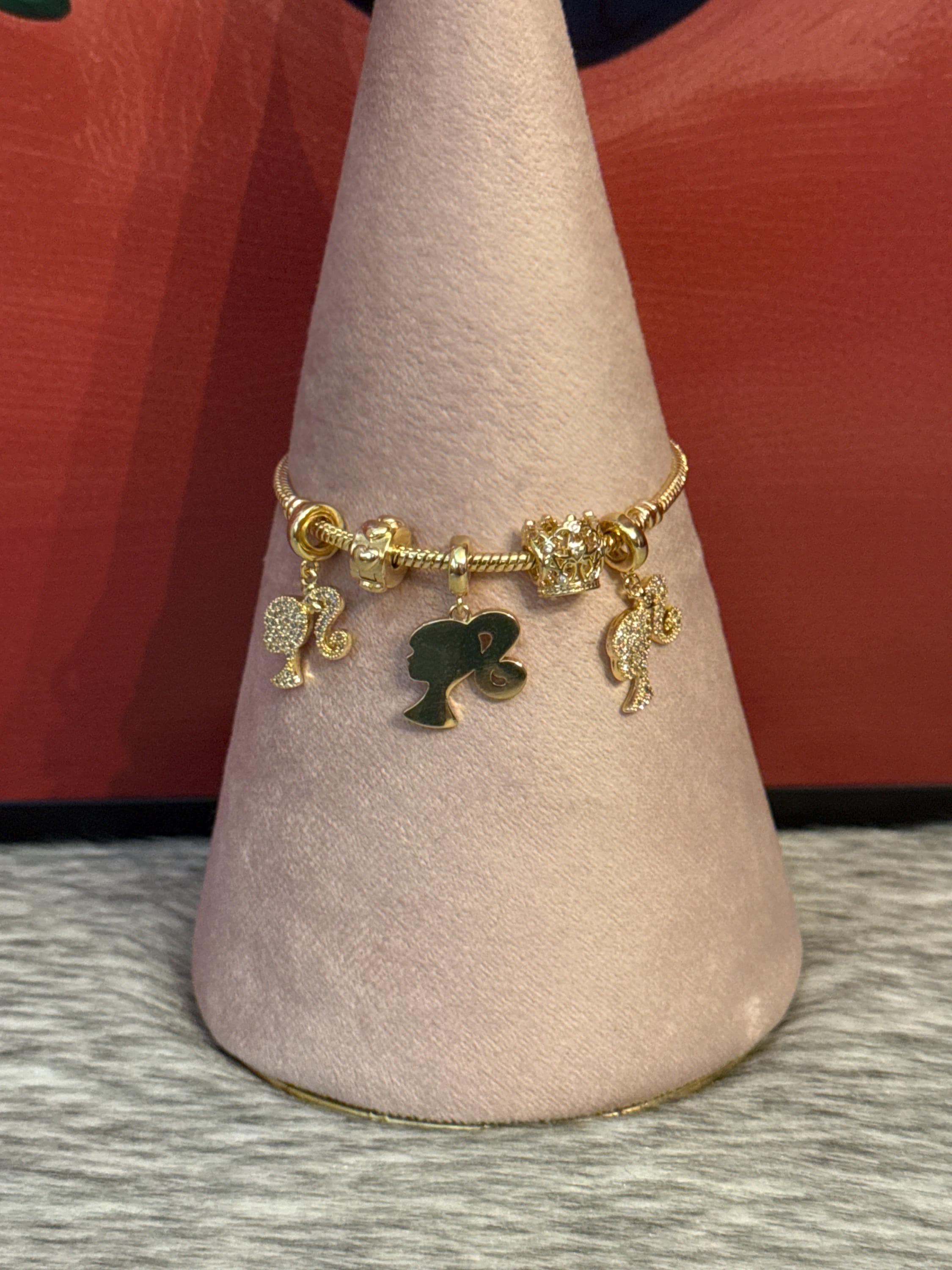 Beautiful Pandora-style bracelet with a Barbie charm covered in cubic zirconia. Made of high-quality 18k gold plating. The bracelet measures 7 inches long.