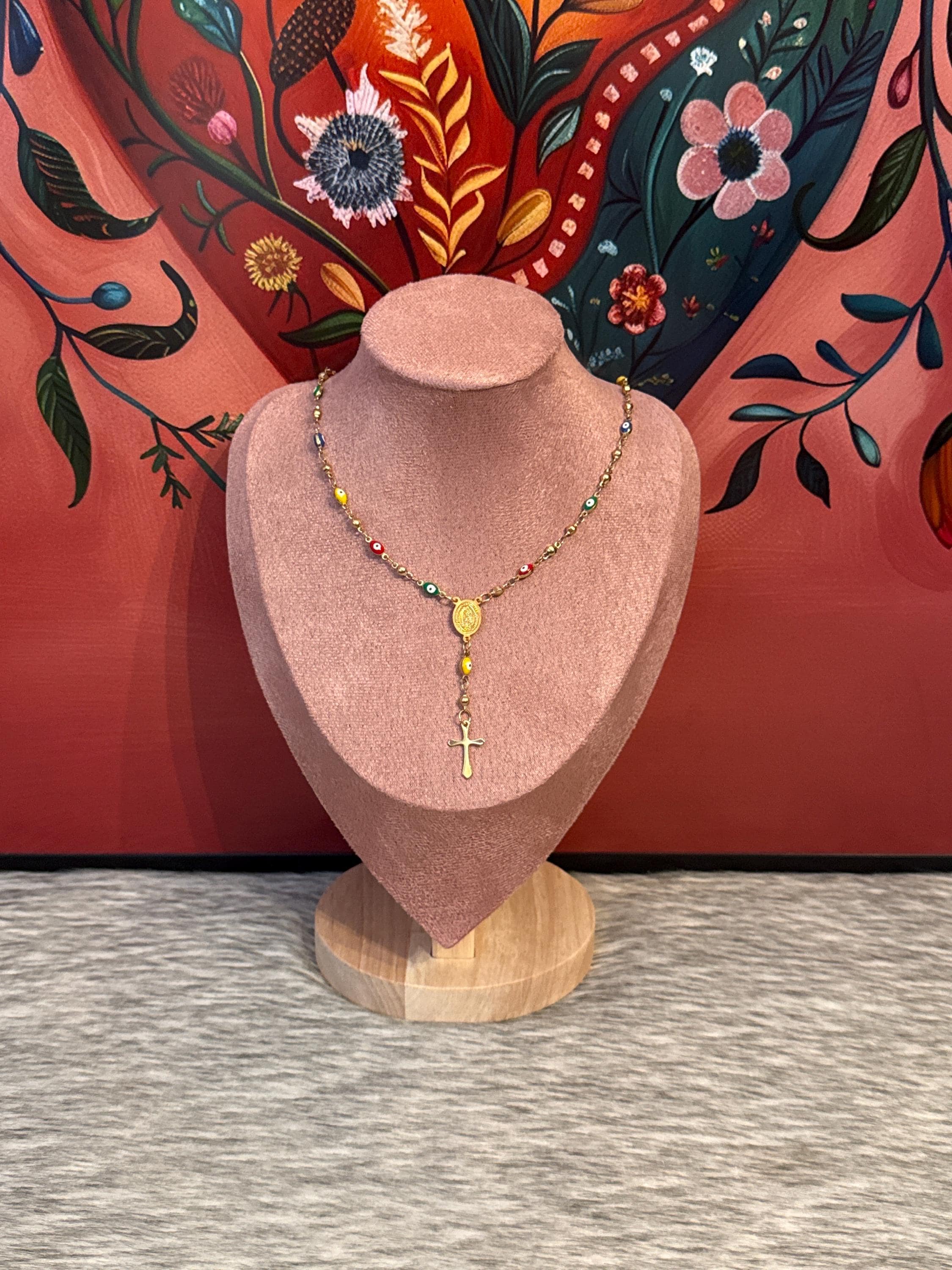 Beautiful rosary with multicolored eyes in gold-colored stainless steel.