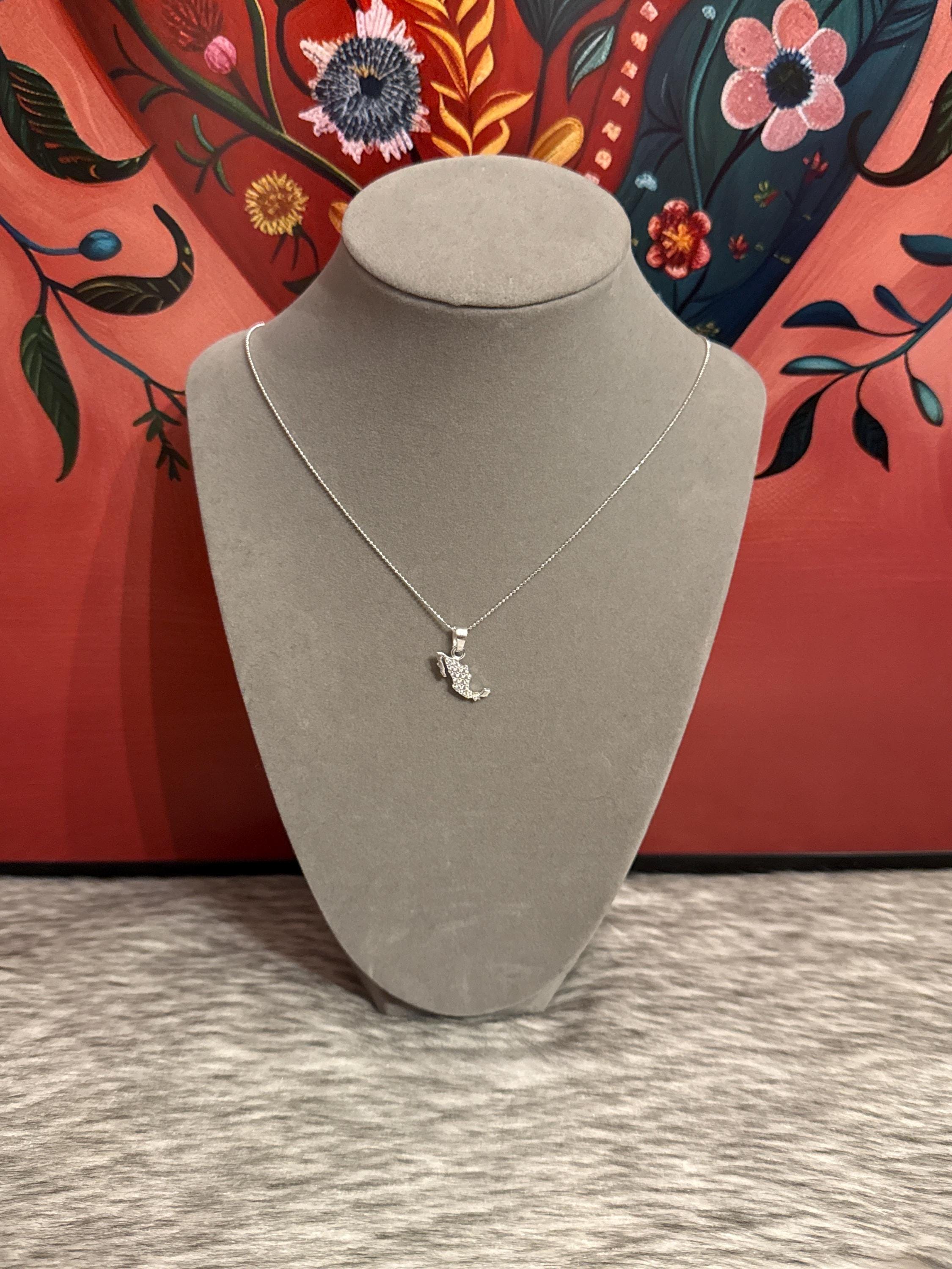 Beautiful fine and delicate chain in 925 sterling silver with a Mexico map pendant with cubic zirconias, the chain measures approximately 17 inches long.