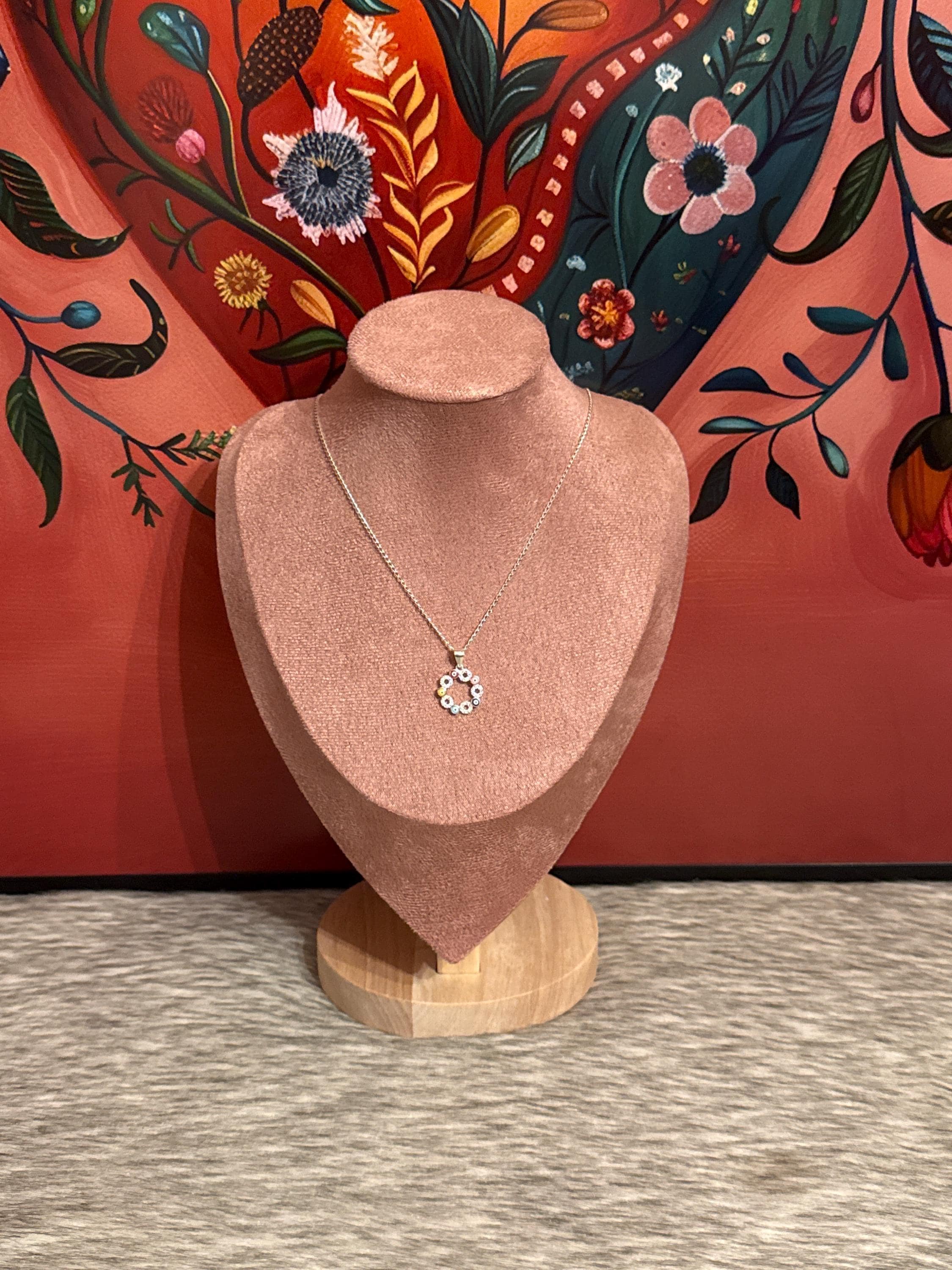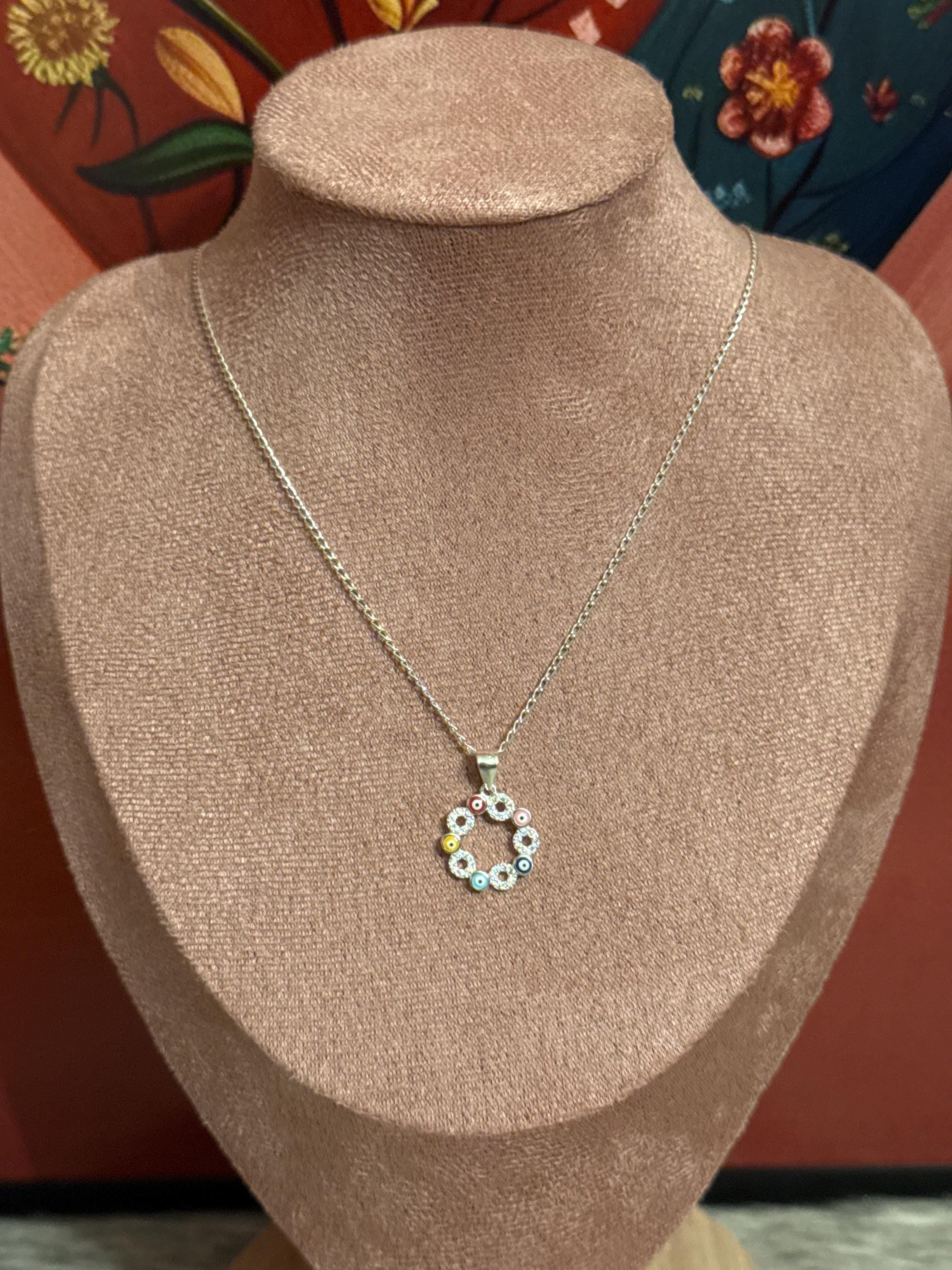 Beautiful fine and delicate 925 sterling silver chain with colorful eye pendant and cubic zirconias, the chain measures approximately 21 inches long.