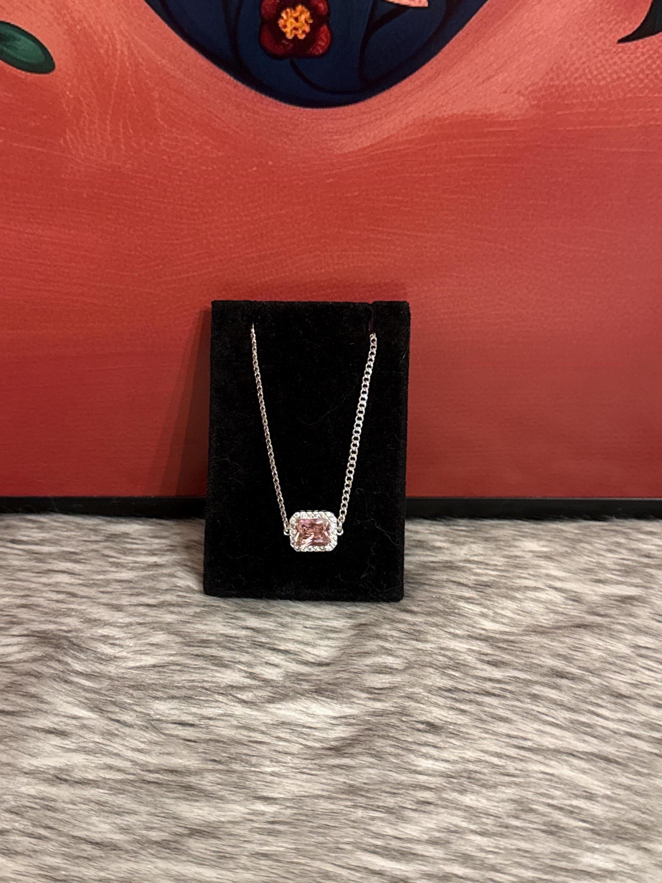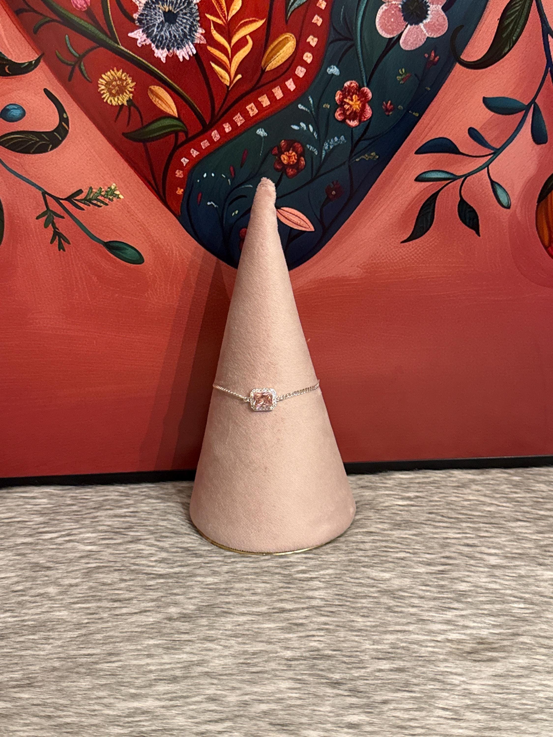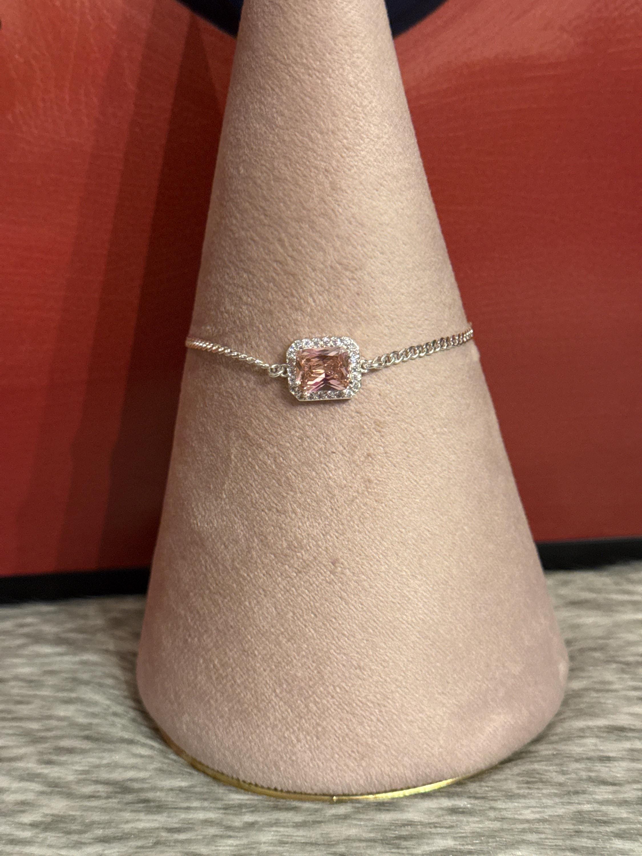Beautiful princess-cut bangle bracelet with a pink cubic zirconia surrounded by smaller cubic zirconia stones. The bracelet is made of 925 sterling silver and measures approximately 7 inches long.