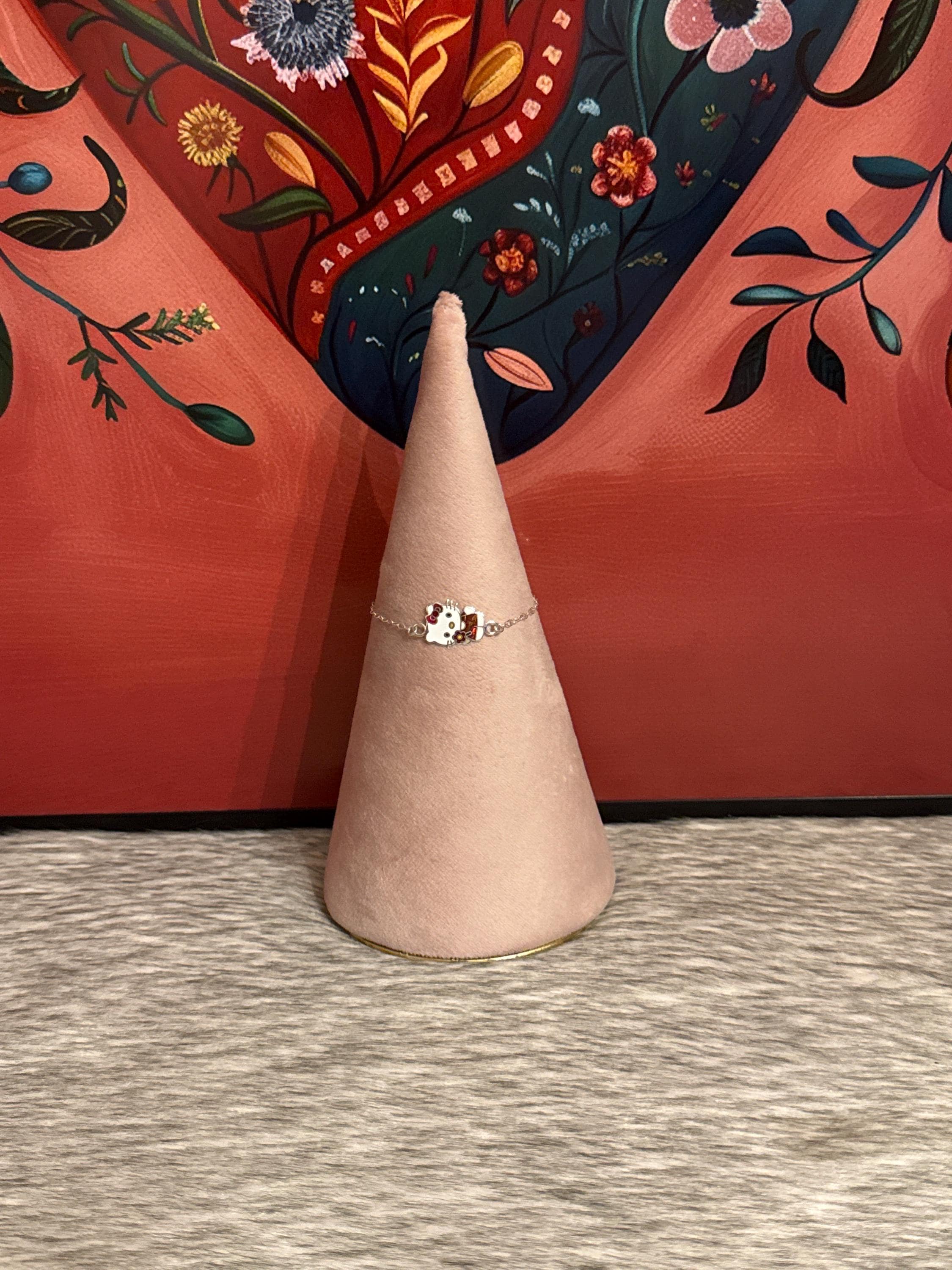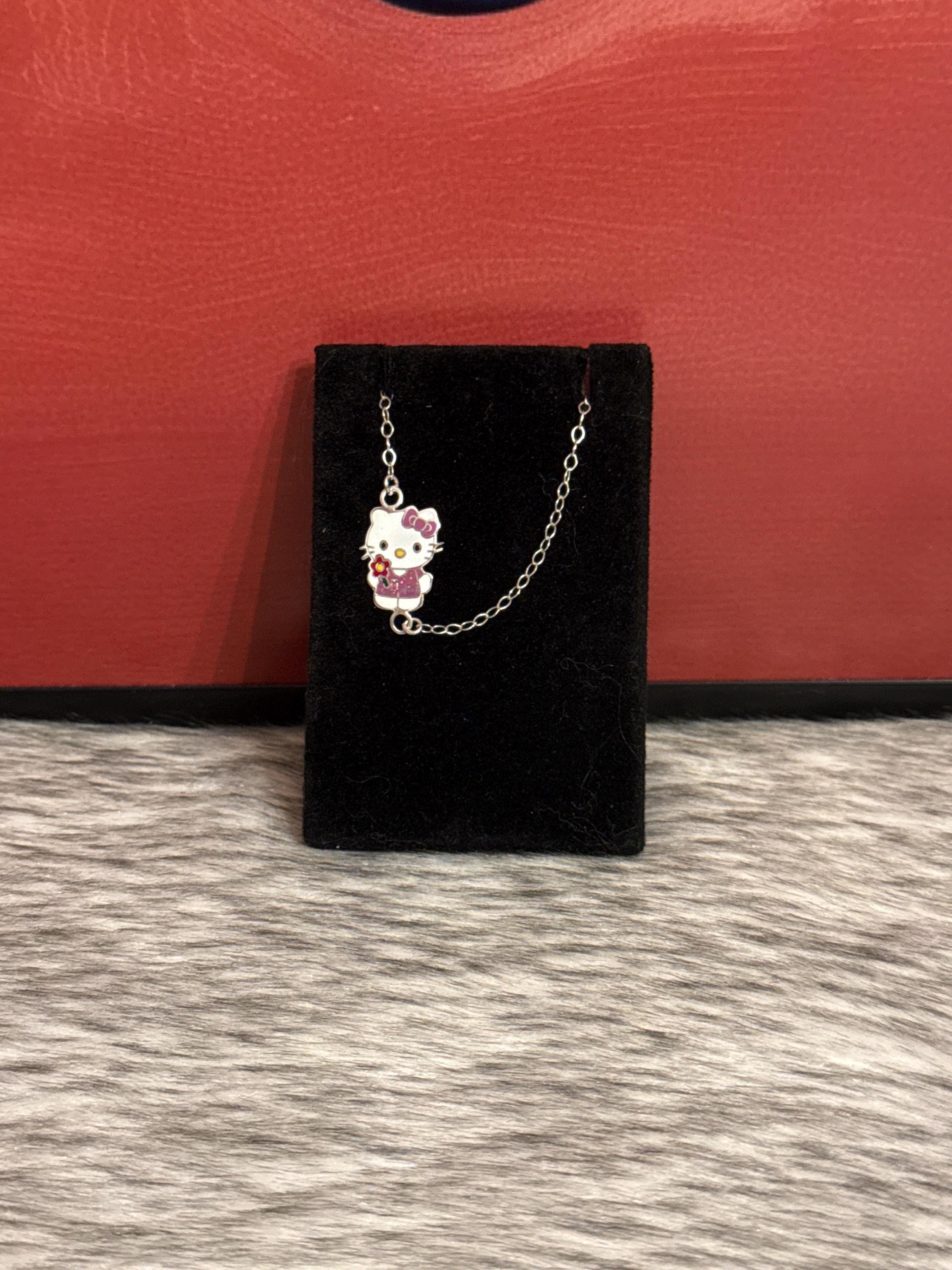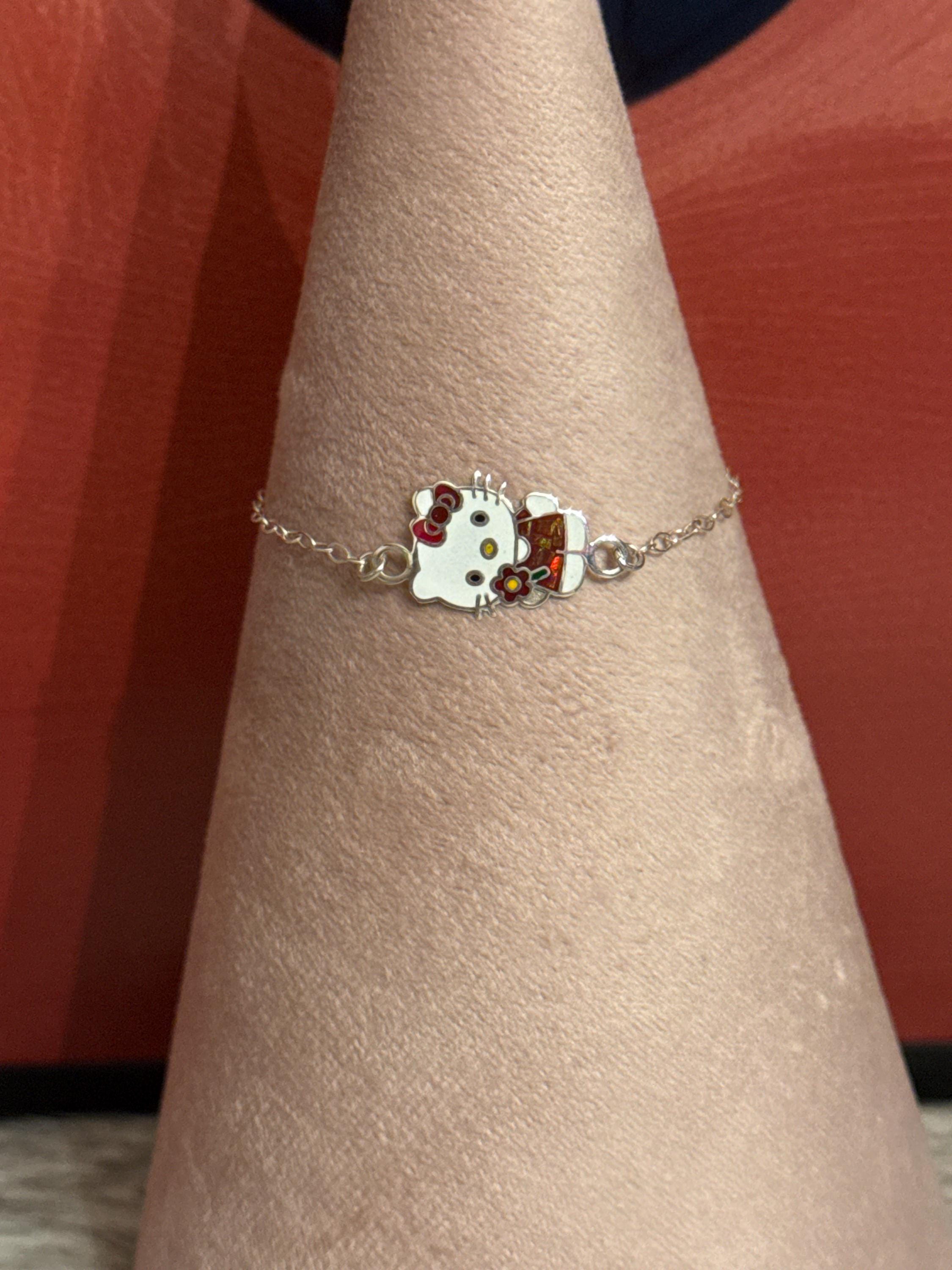 Hello kitty in 925 sterling silver. The bracelet measures approximately 6 inches long.