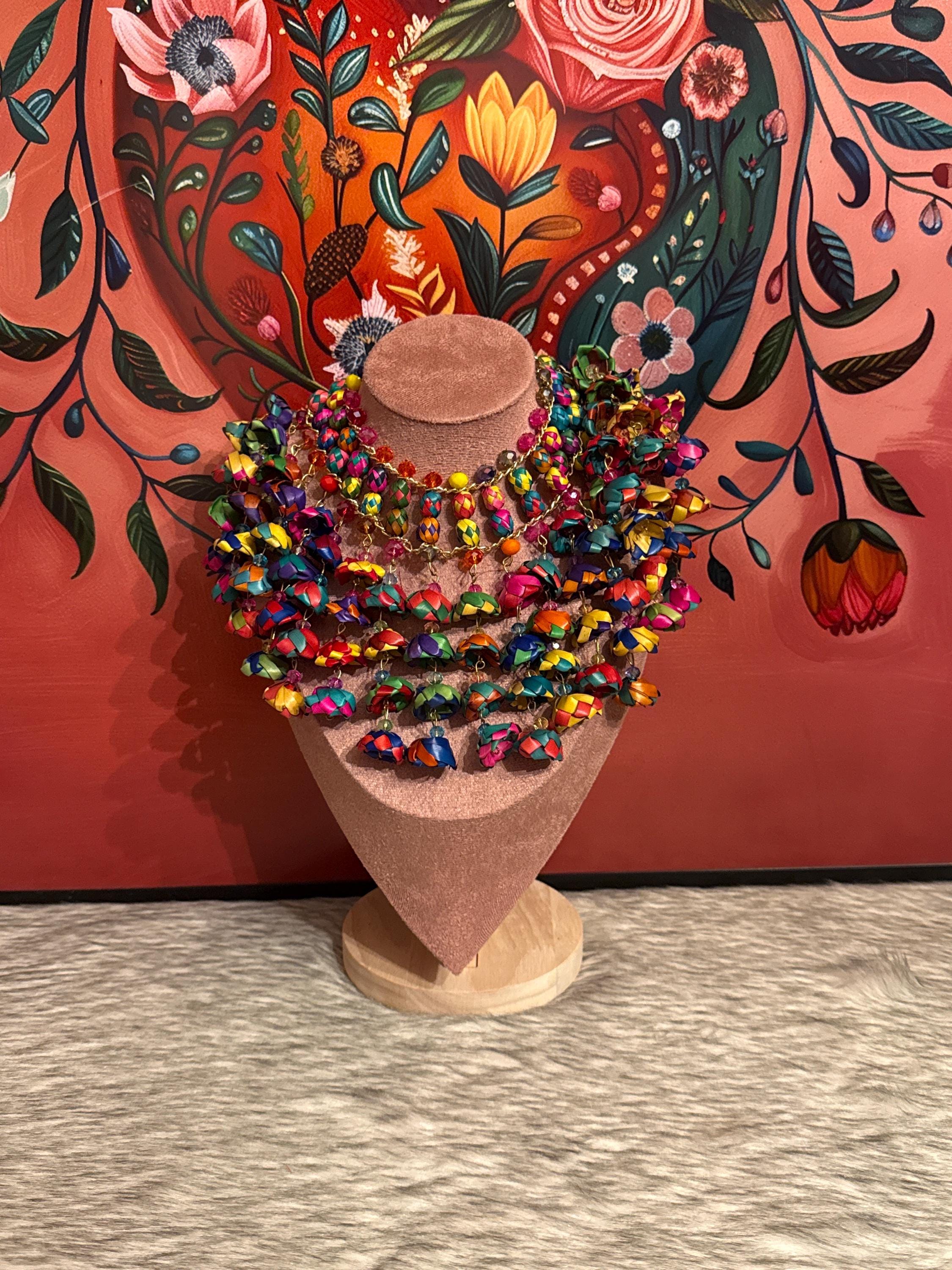Beautiful handmade necklace with flowers and palm leaf barrels, made by Mexican artisans. Includes earrings.