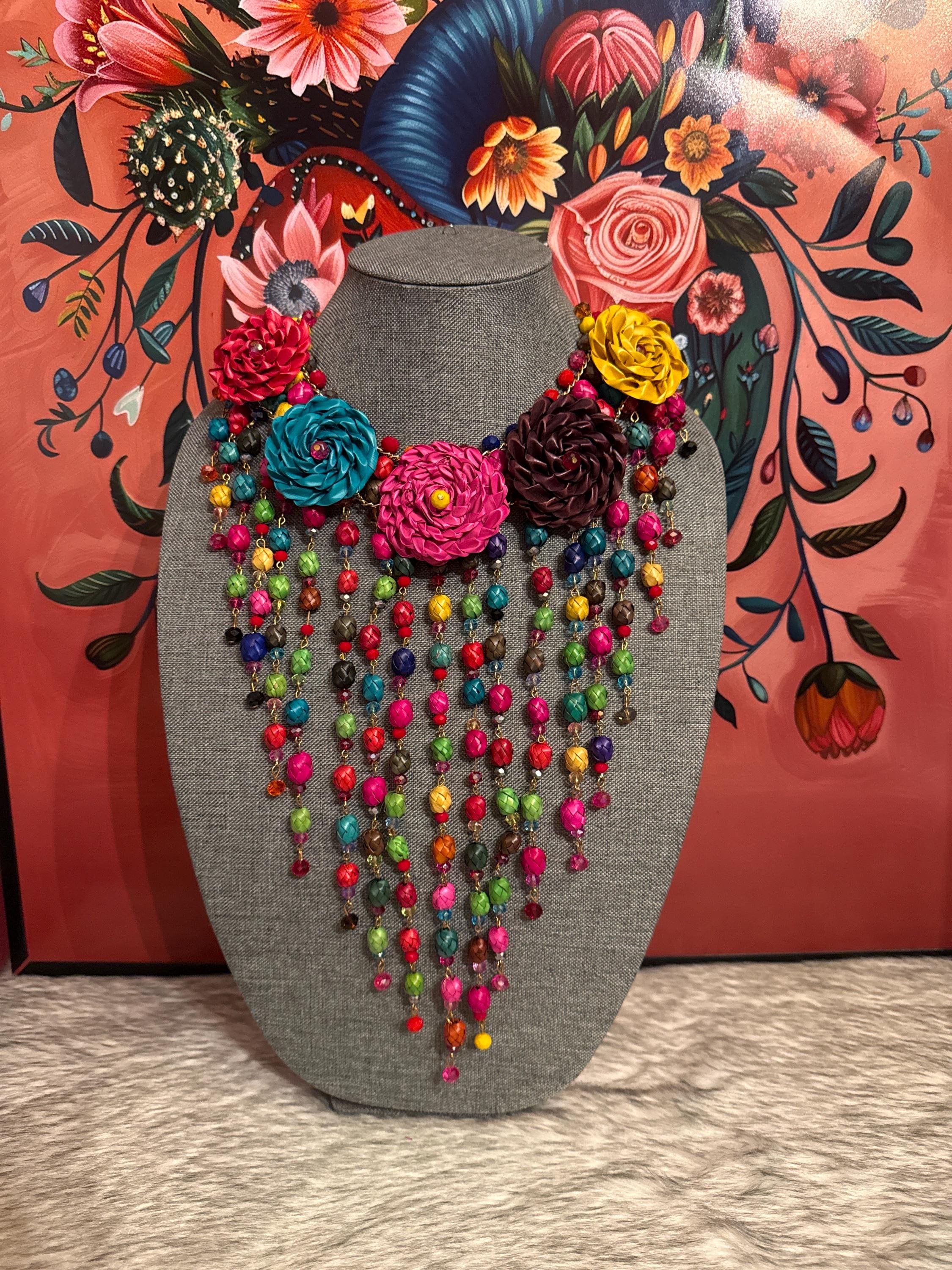 Beautiful handmade necklace with flowers and small palm leaf barrels, made by Mexican artisans.