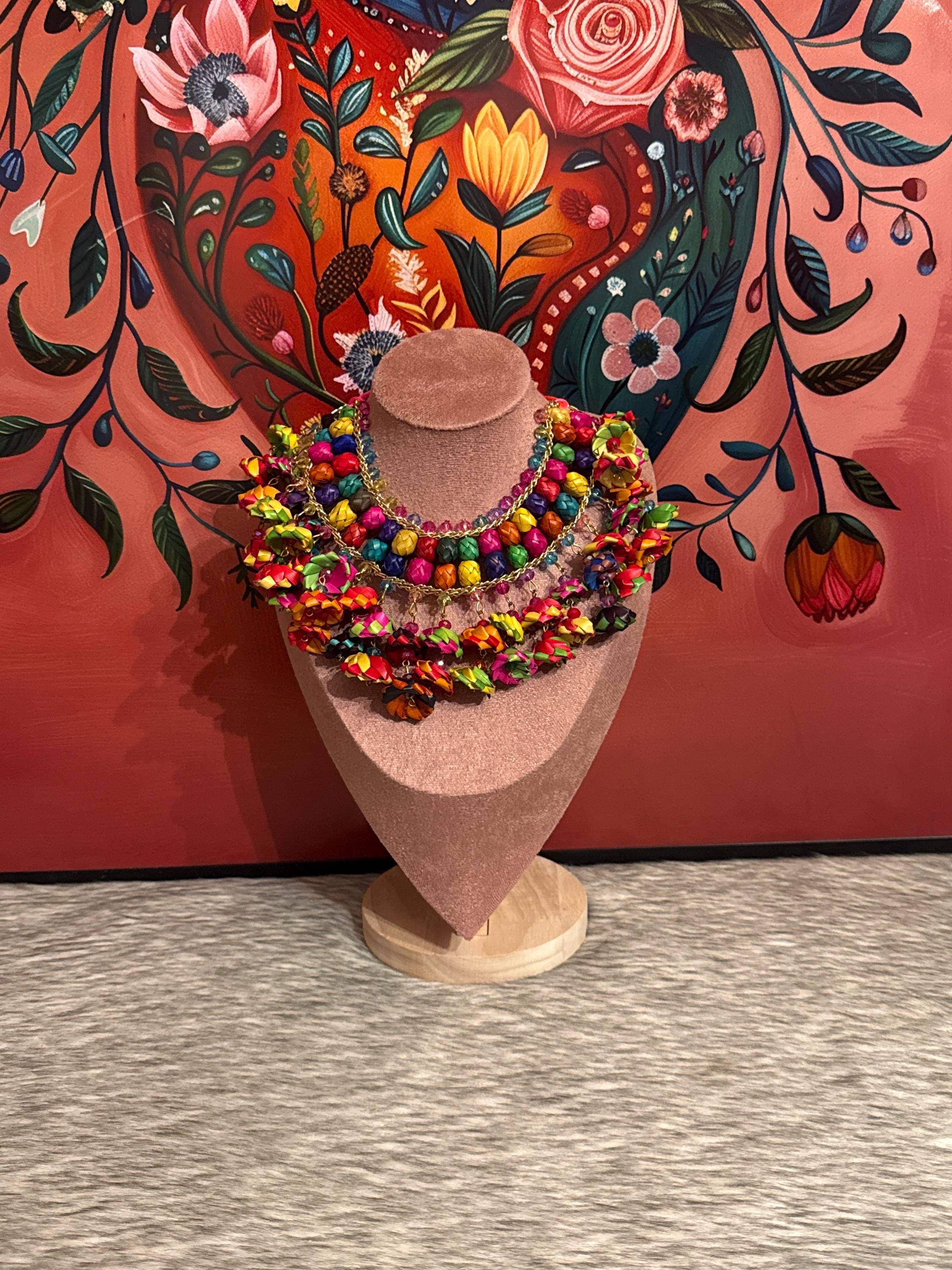 Beautiful handmade necklace with flowers and palm leaf barrels, made by Mexican artisans. Includes earrings.