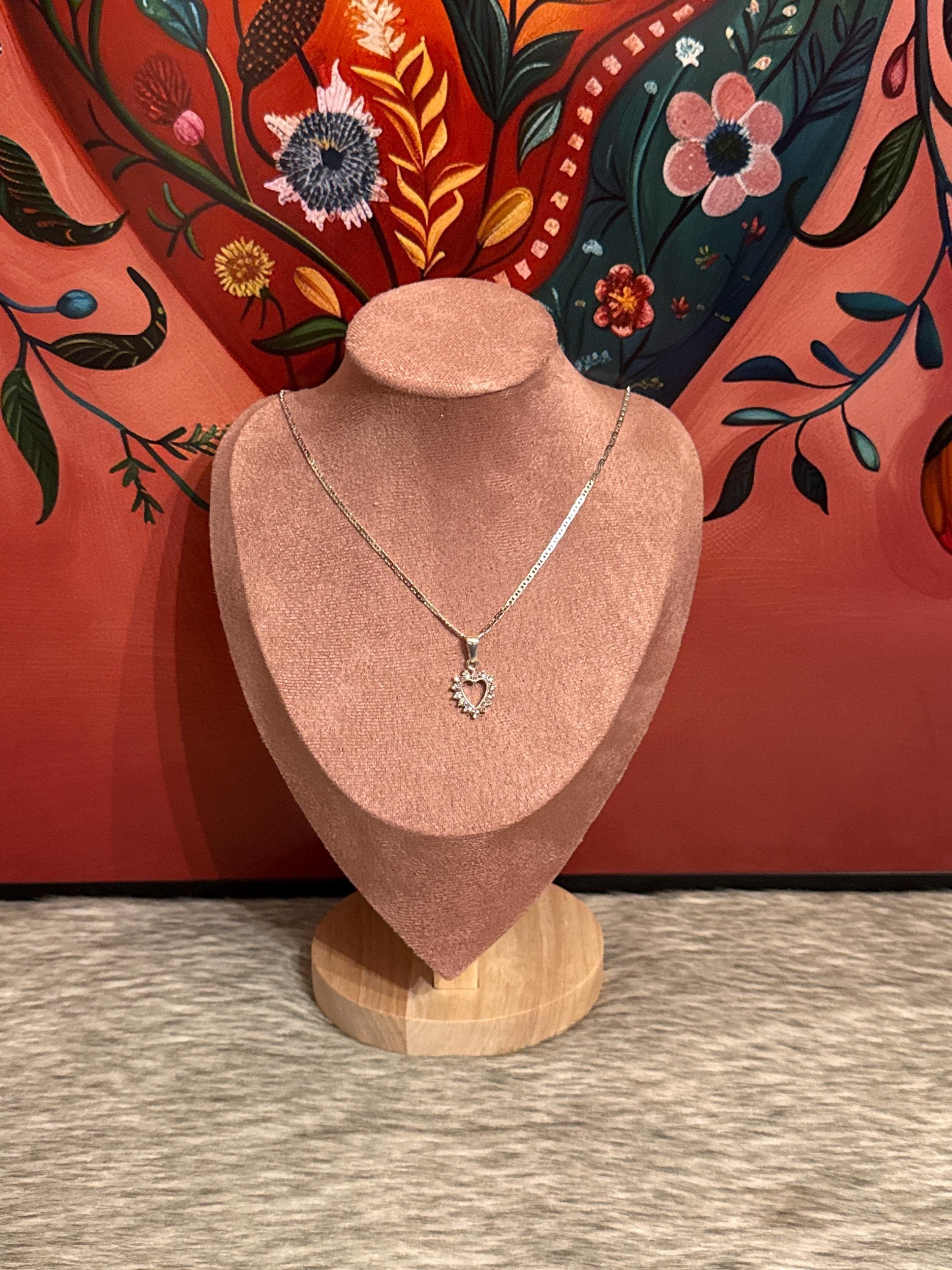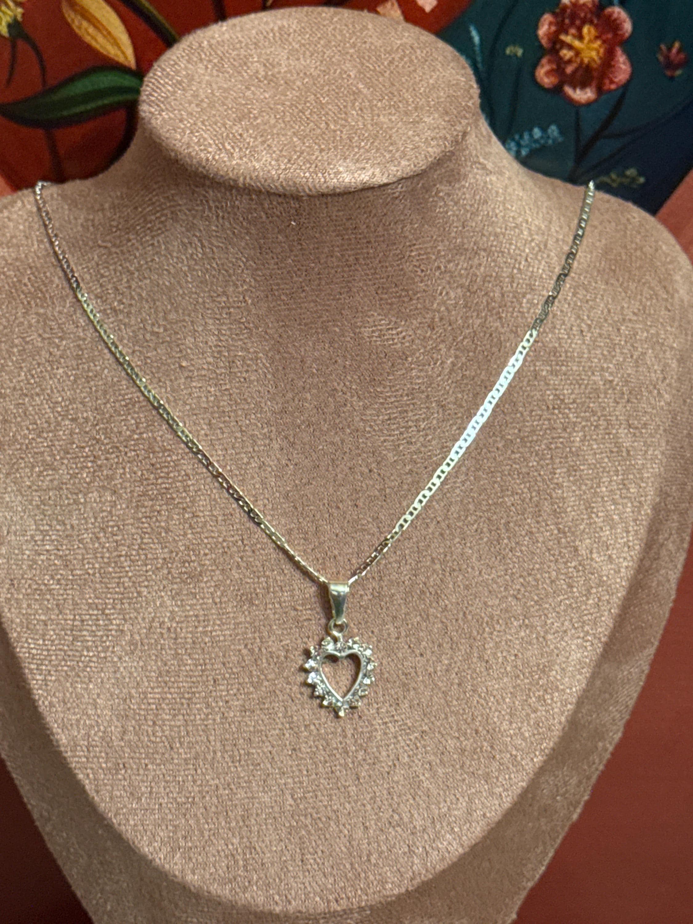Beautiful, fine, and delicate G-style chain with a heart pendant, made in Mexico with 925 sterling silver and cubic zirconia stones. The chain measures approximately 16 inches long.
