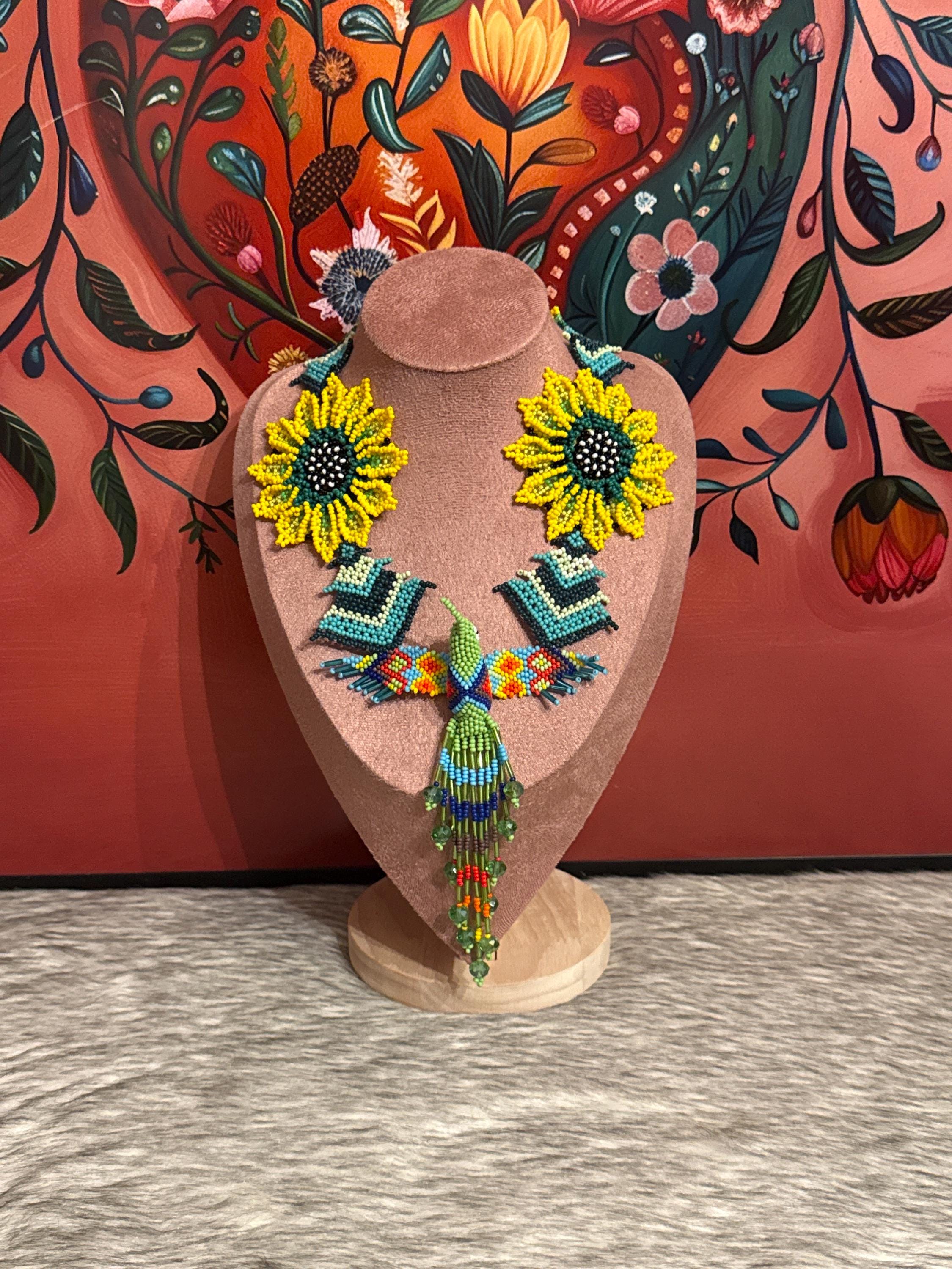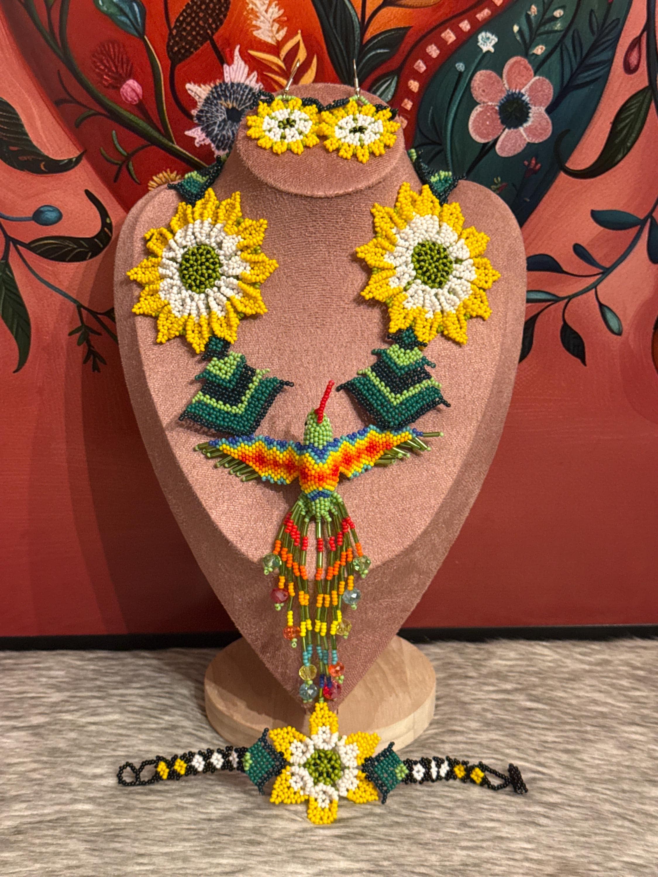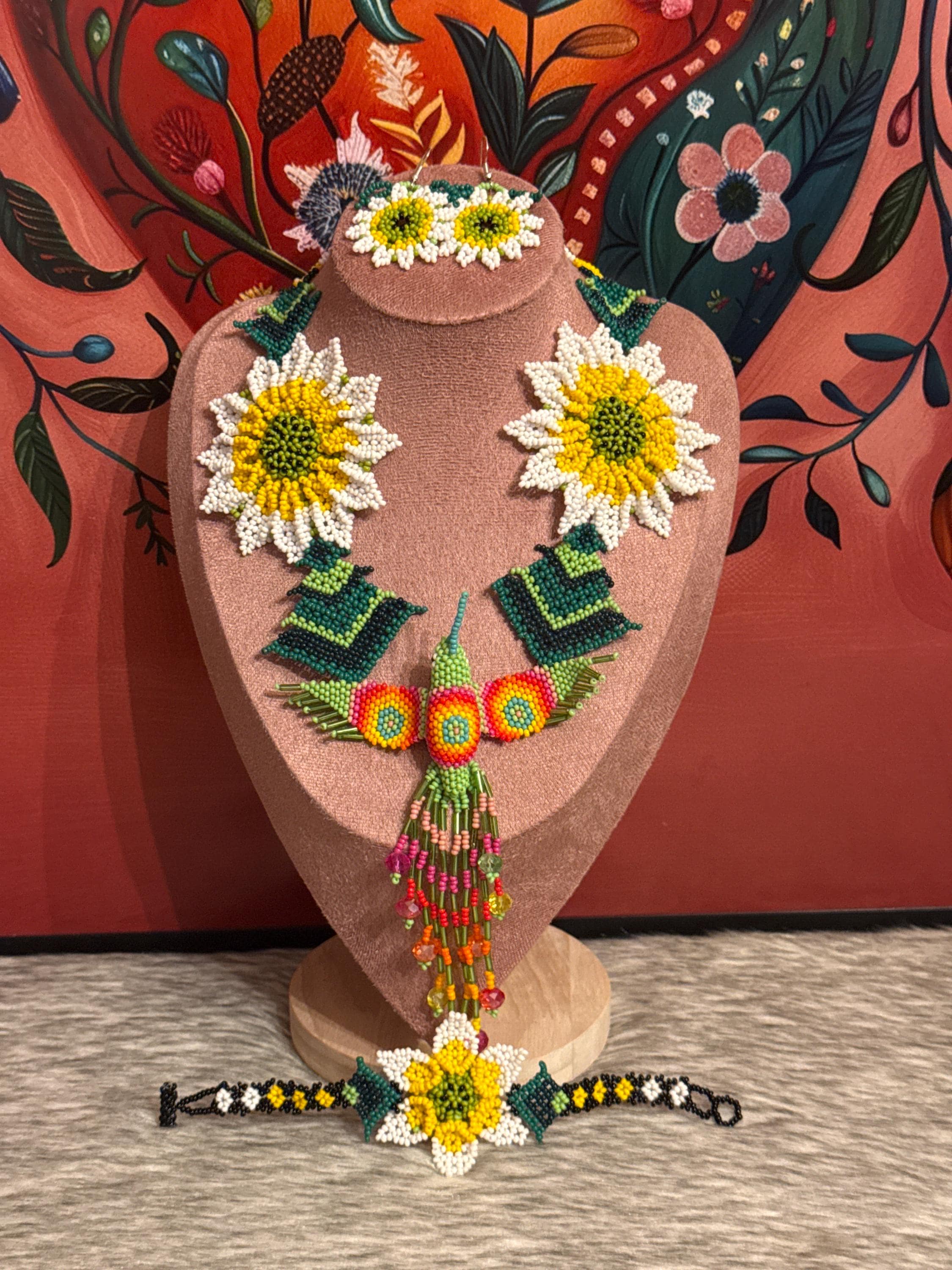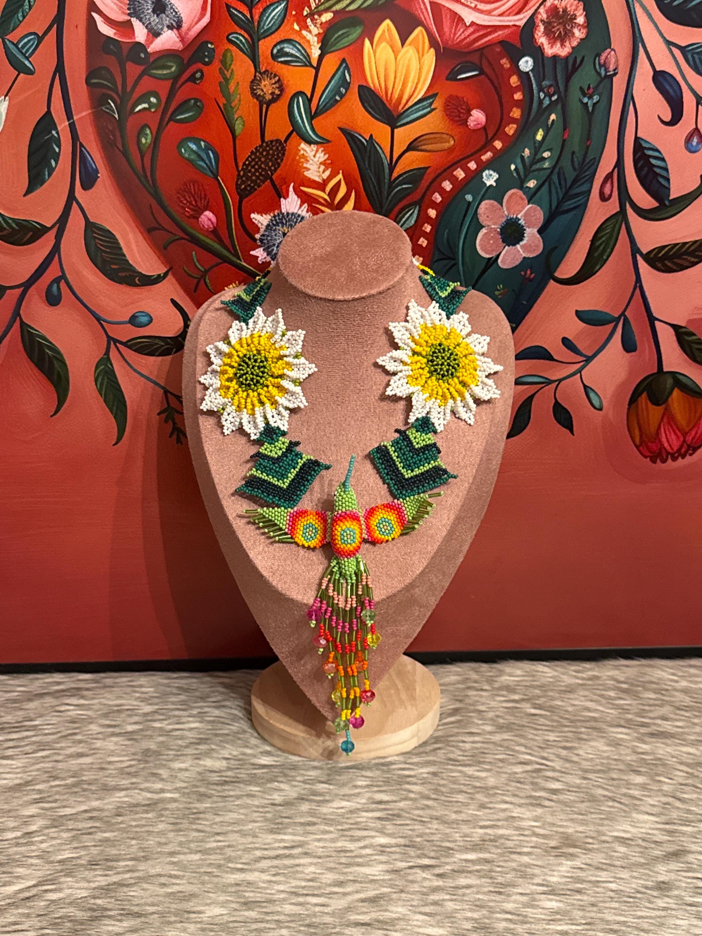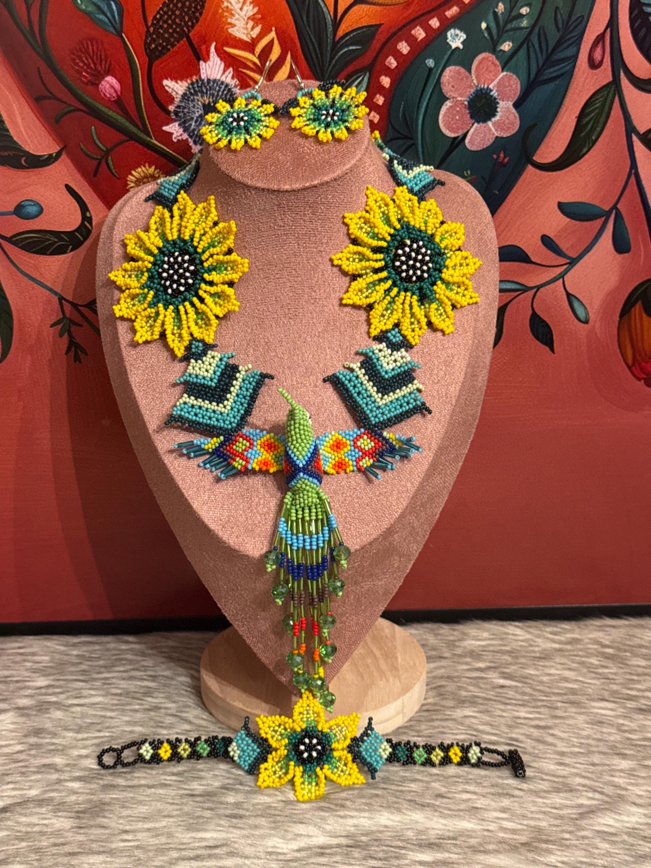Beautiful hummingbird necklace set with earrings and bracelet, handmade by Mexican artisans.
