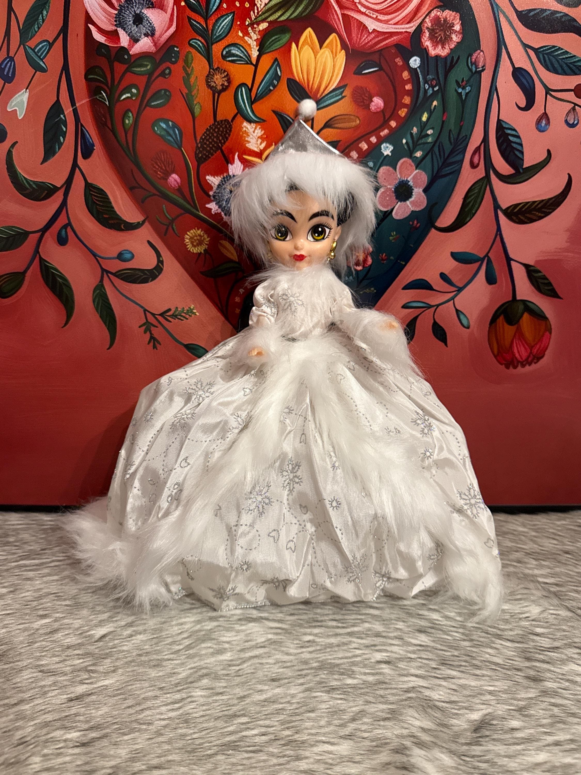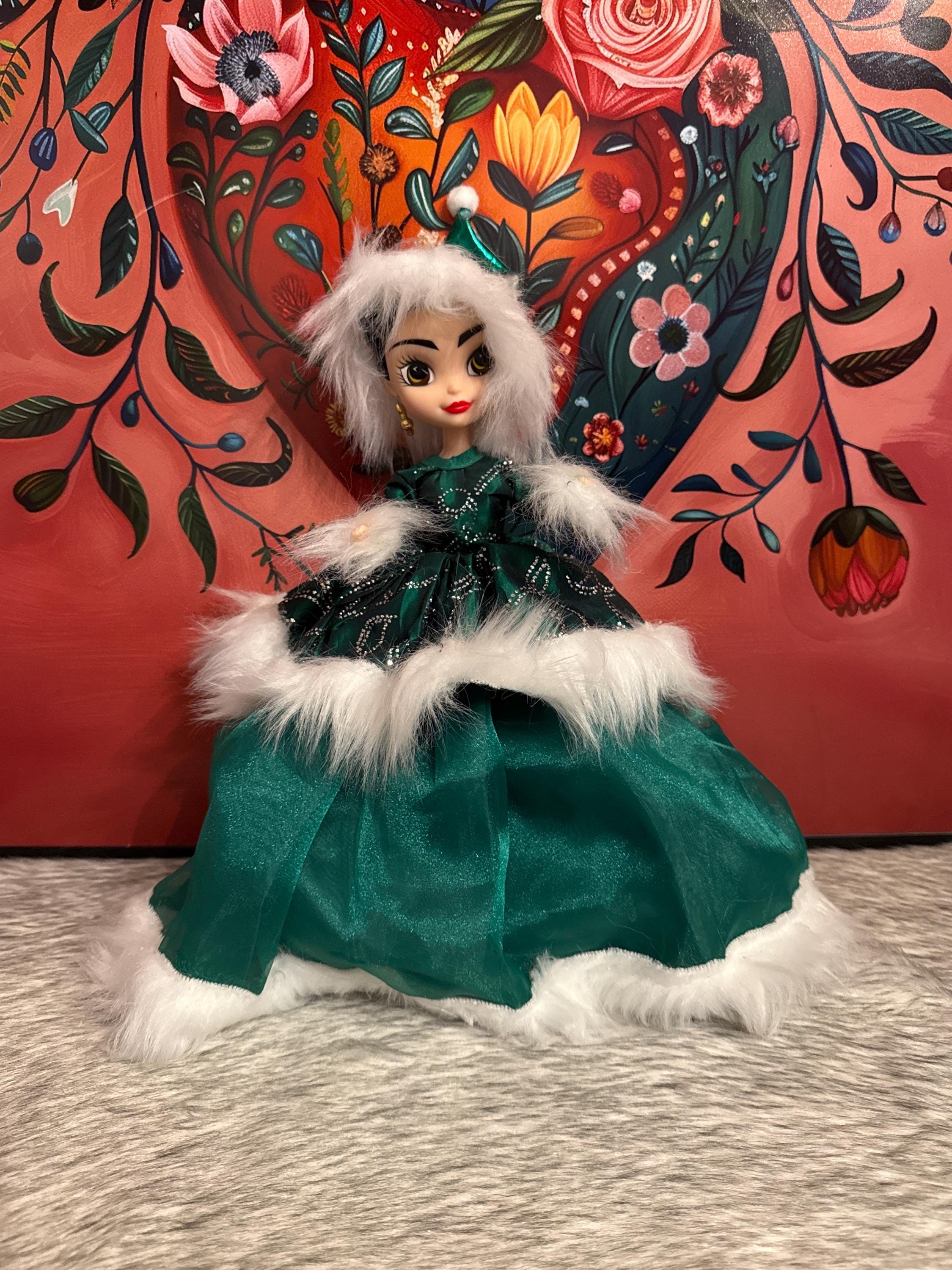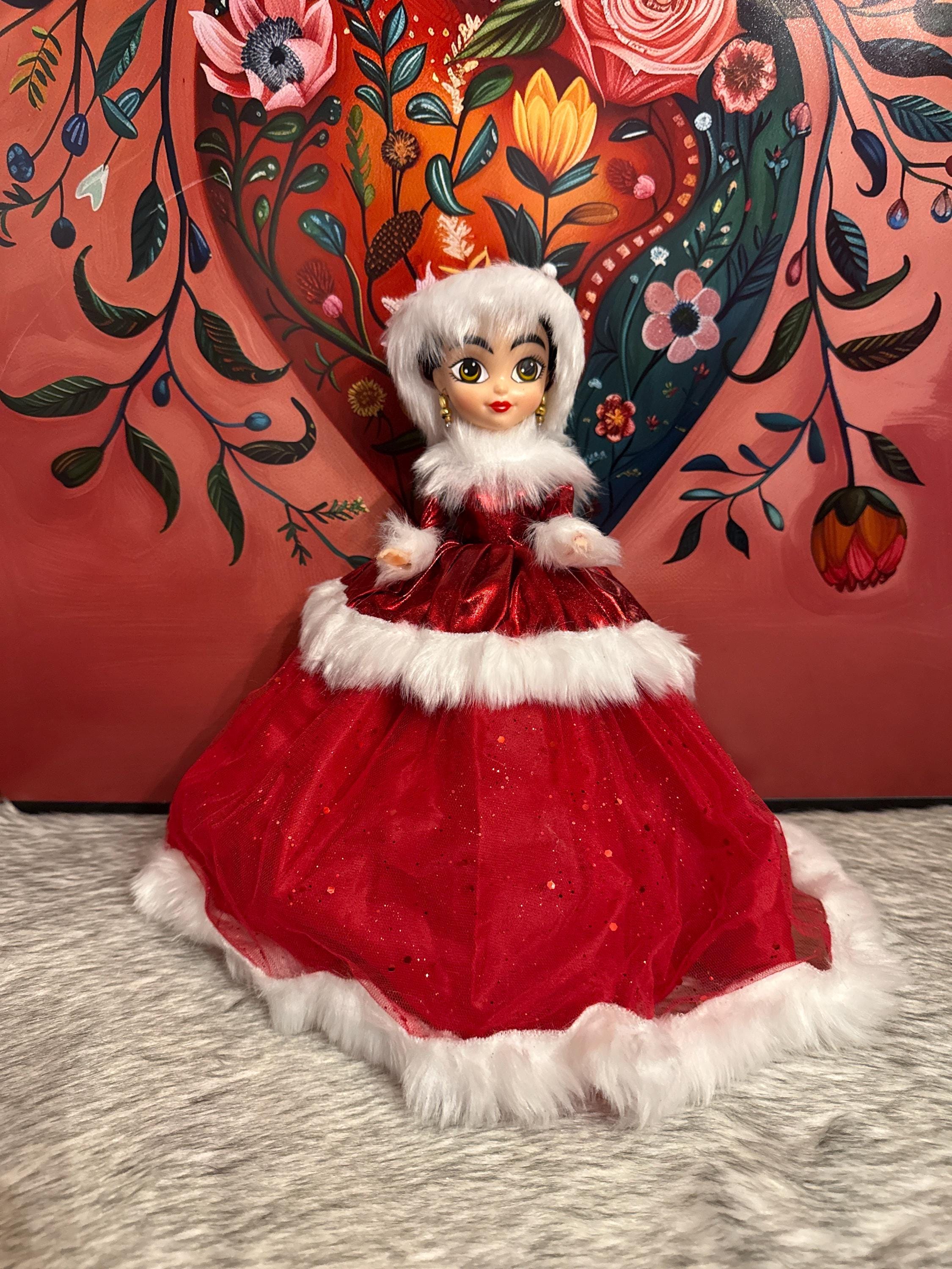 Beautiful Frida Christmas dolls, made using polyester fabrics, tulle, cotton, lace and ribbons, they measure 13 inches tall, include their Christmas outfit, panties, shoes and their base to stand them up.