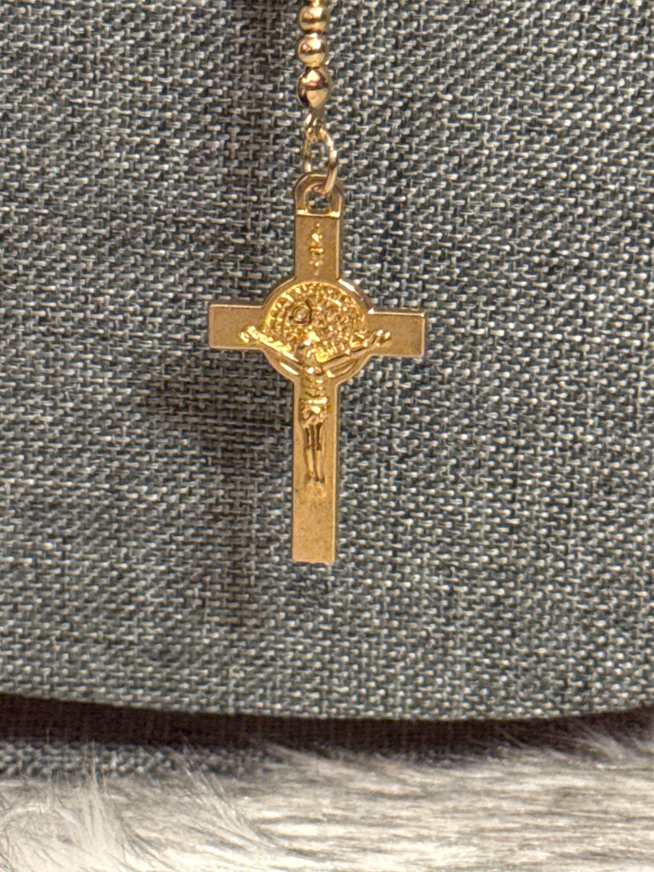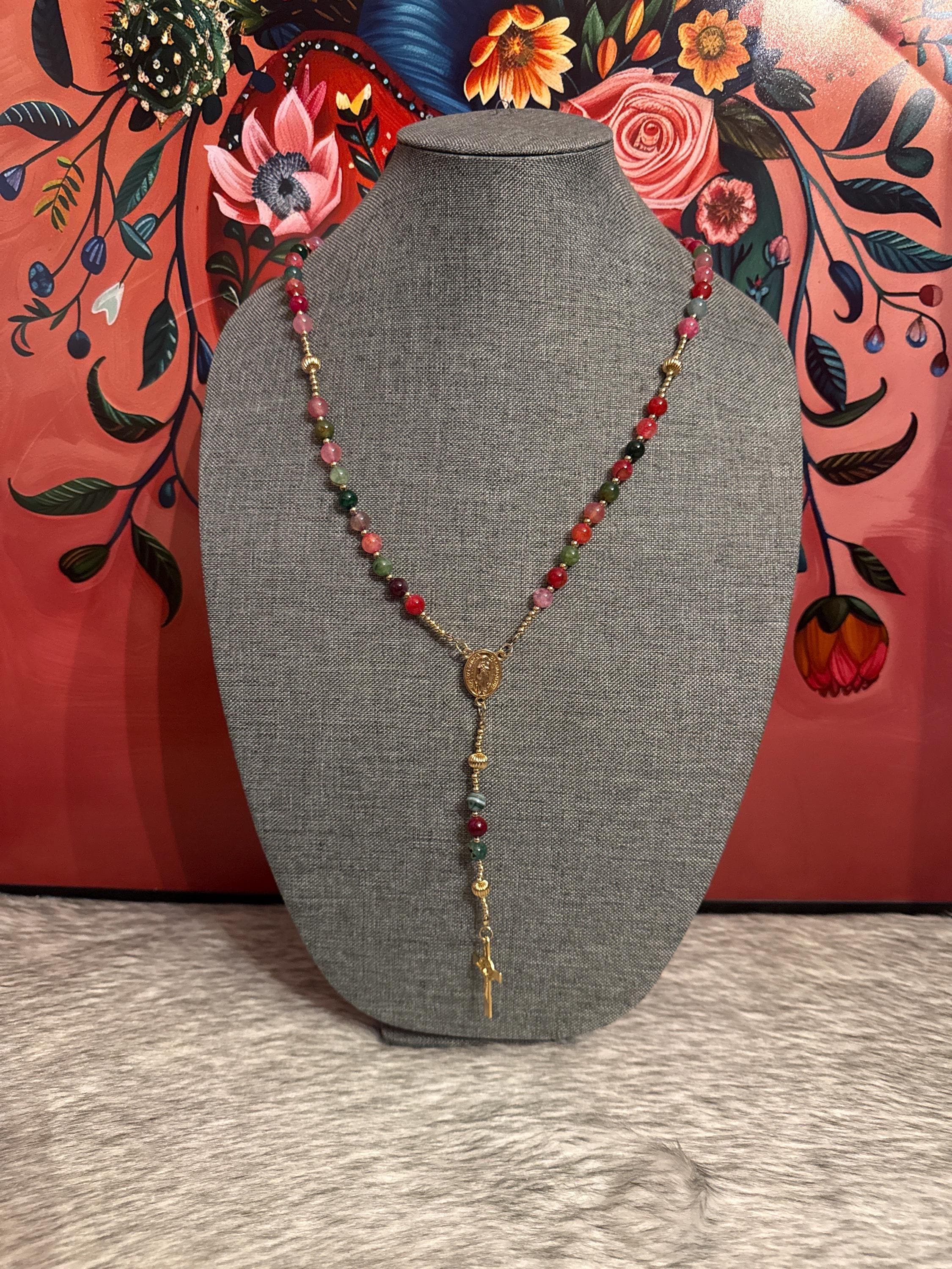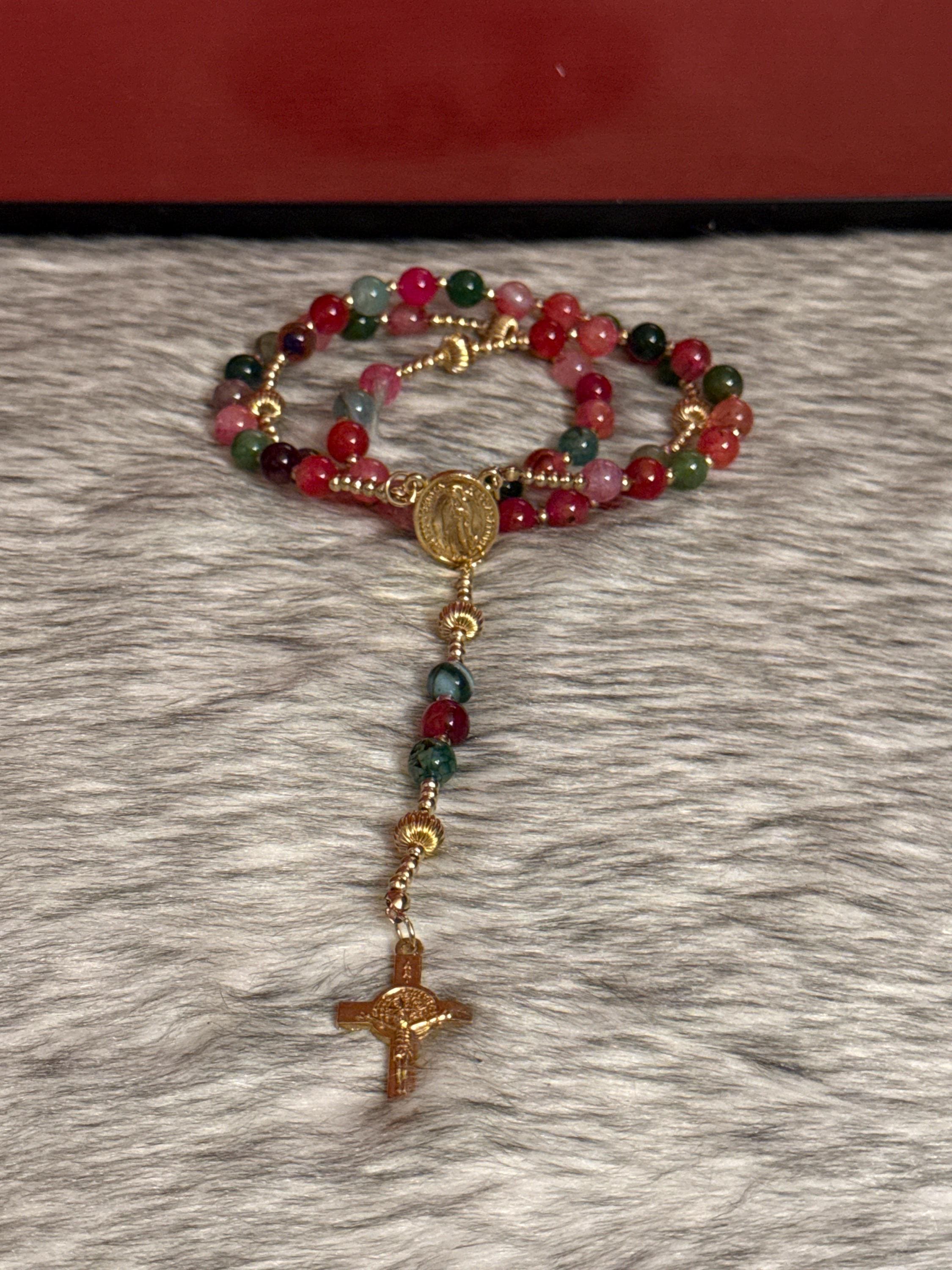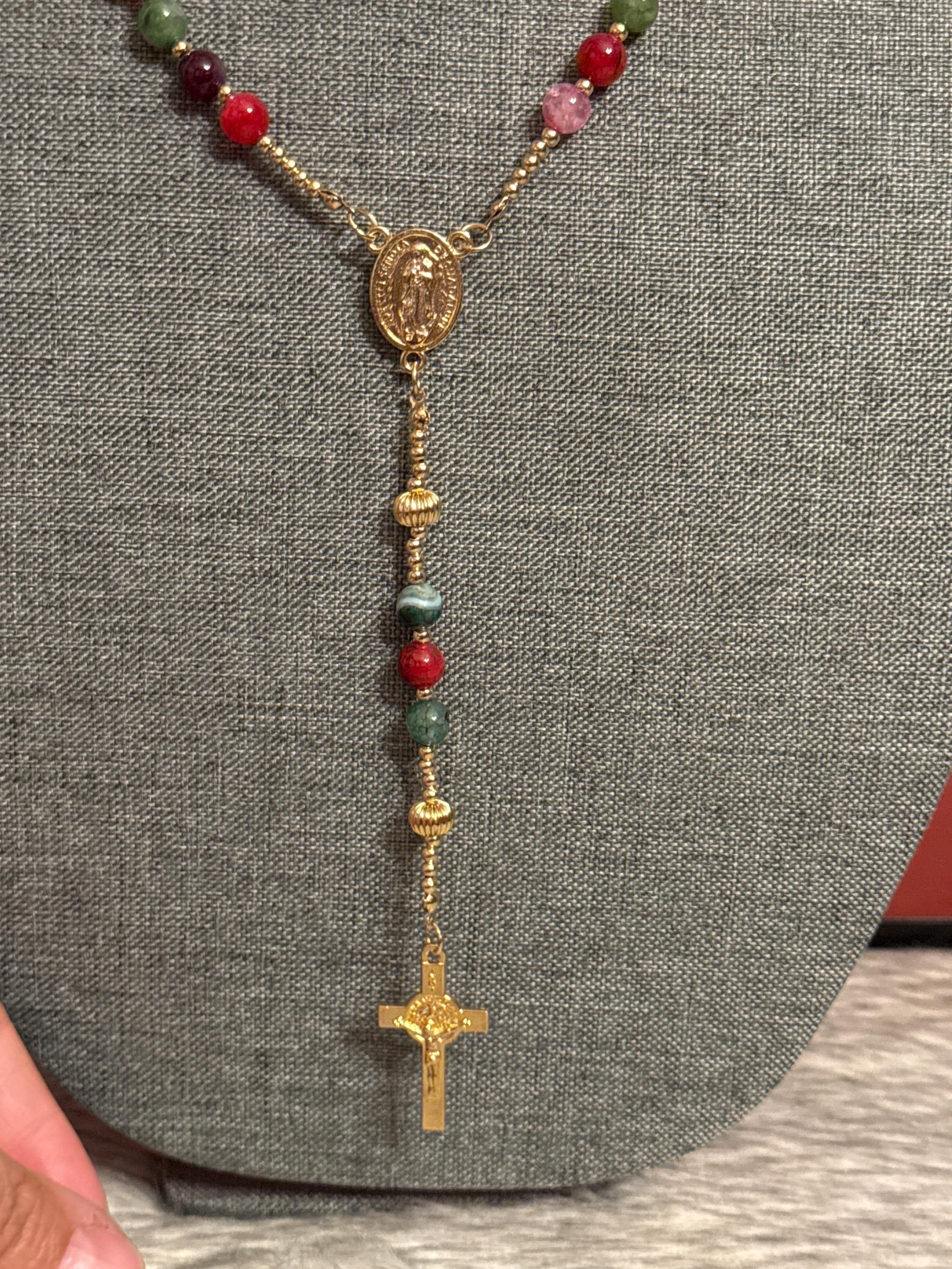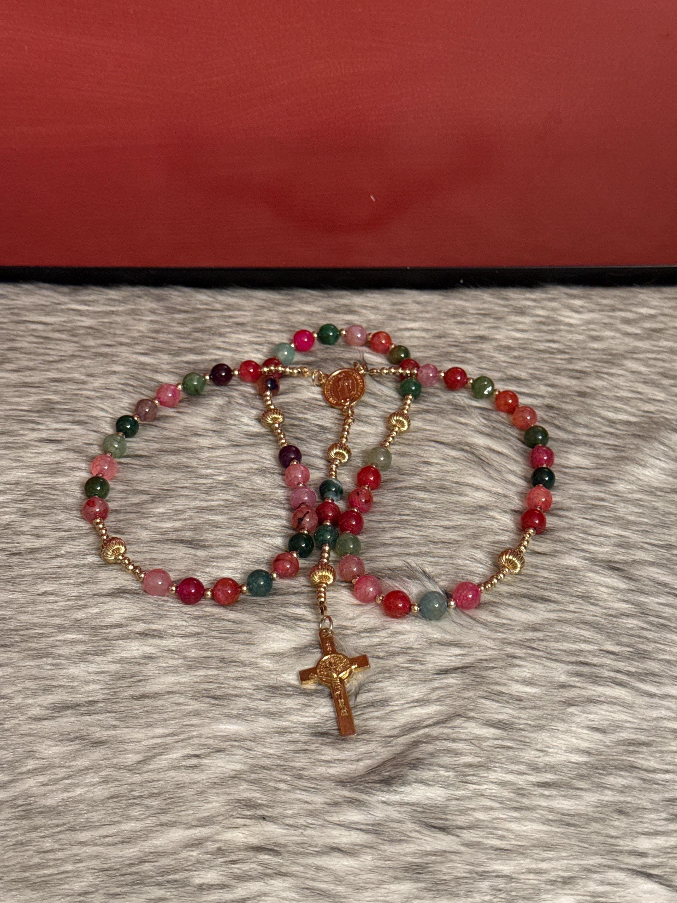 Beautiful handmade rosary with natural agate stones and 14k gold plated pendants.
