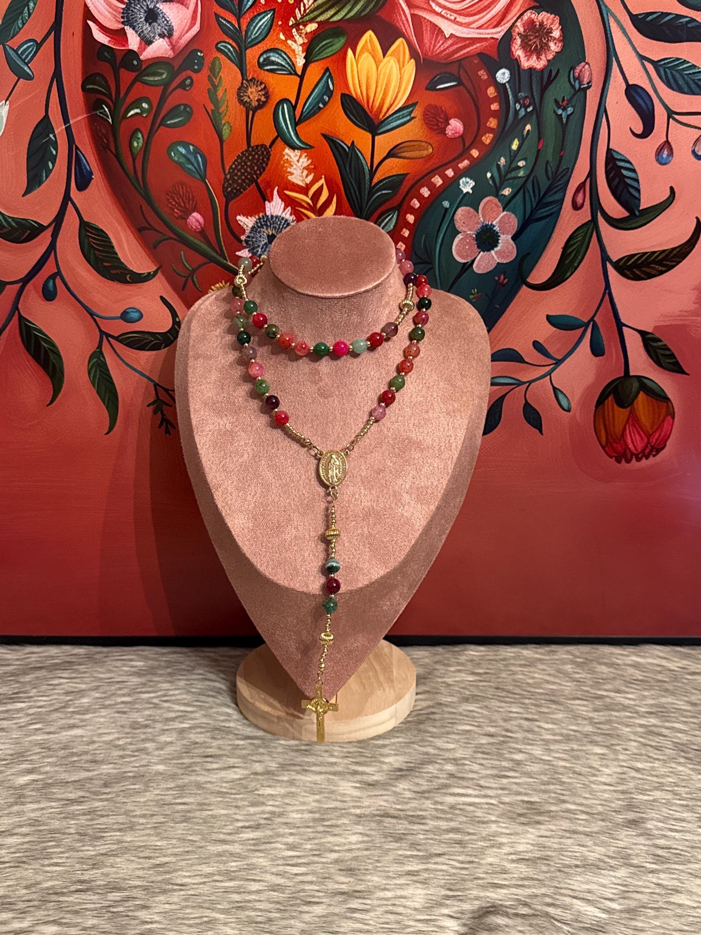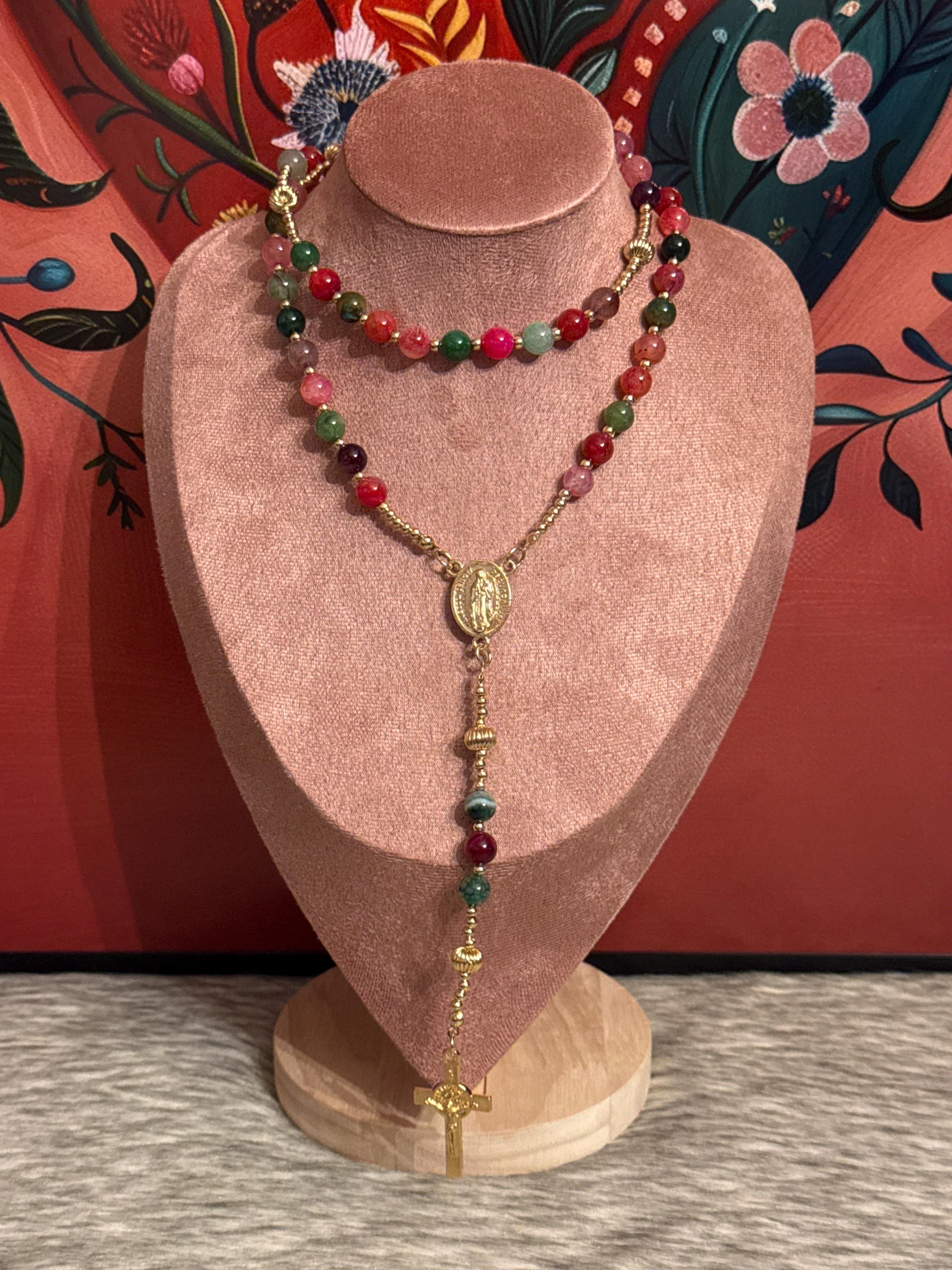 Beautiful handmade rosary with natural agate stones and 14k gold plated pendants.