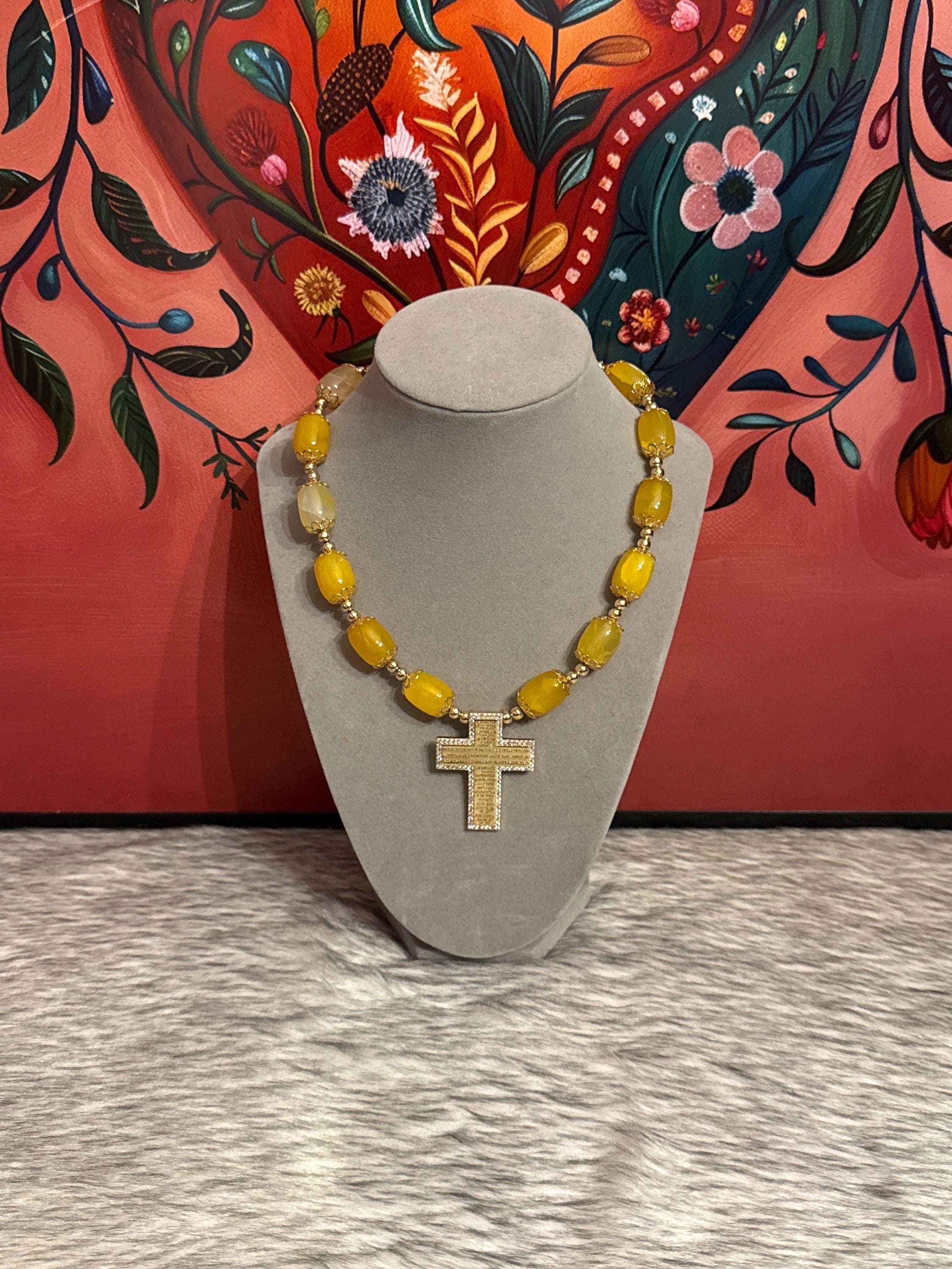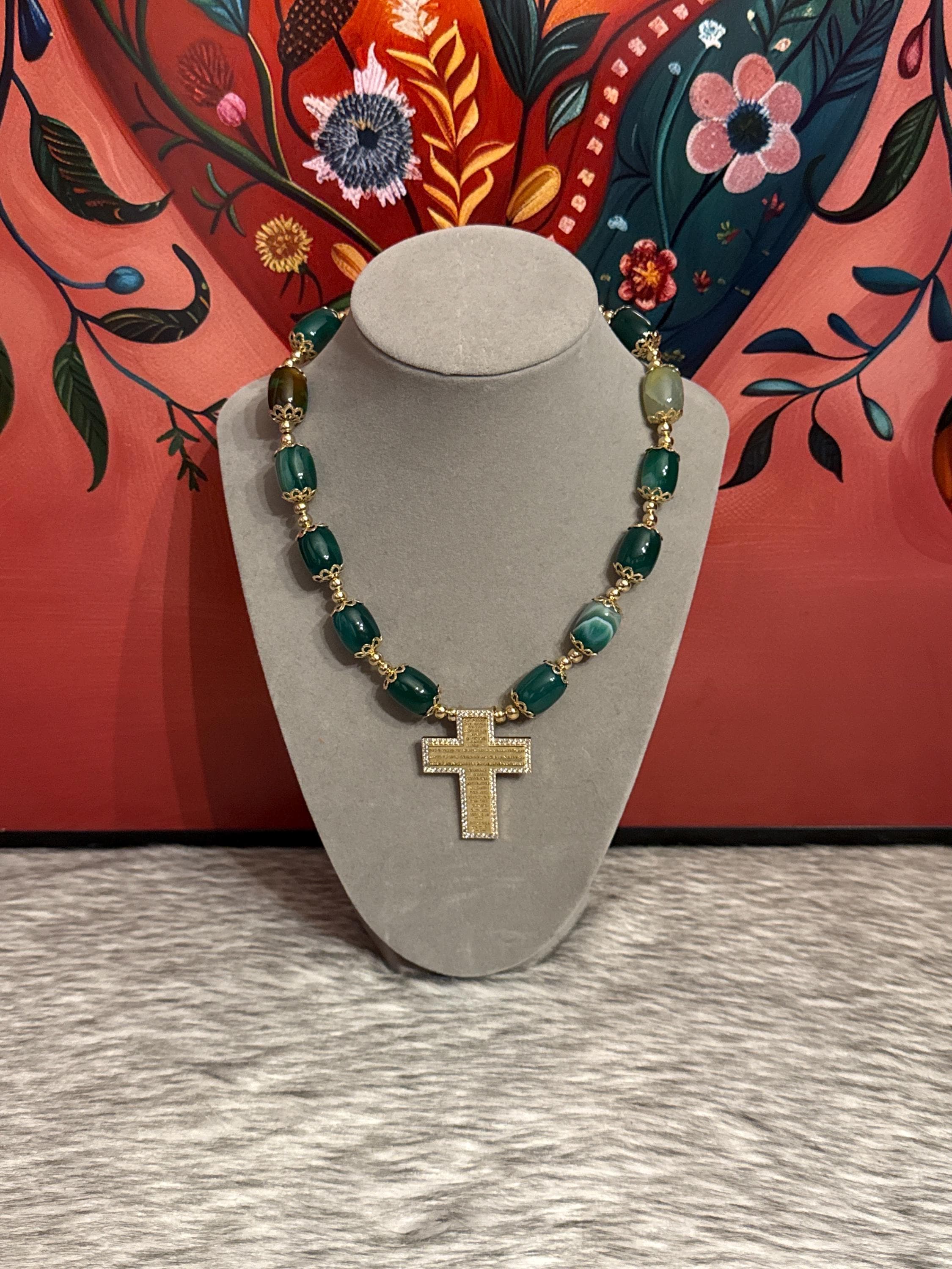 Beautiful handmade necklace with natural agate stones and a cross-shaped pendant engraved with the Lord's Prayer in Latin, made with a 14k gold-plated pendant. Includes earrings.
