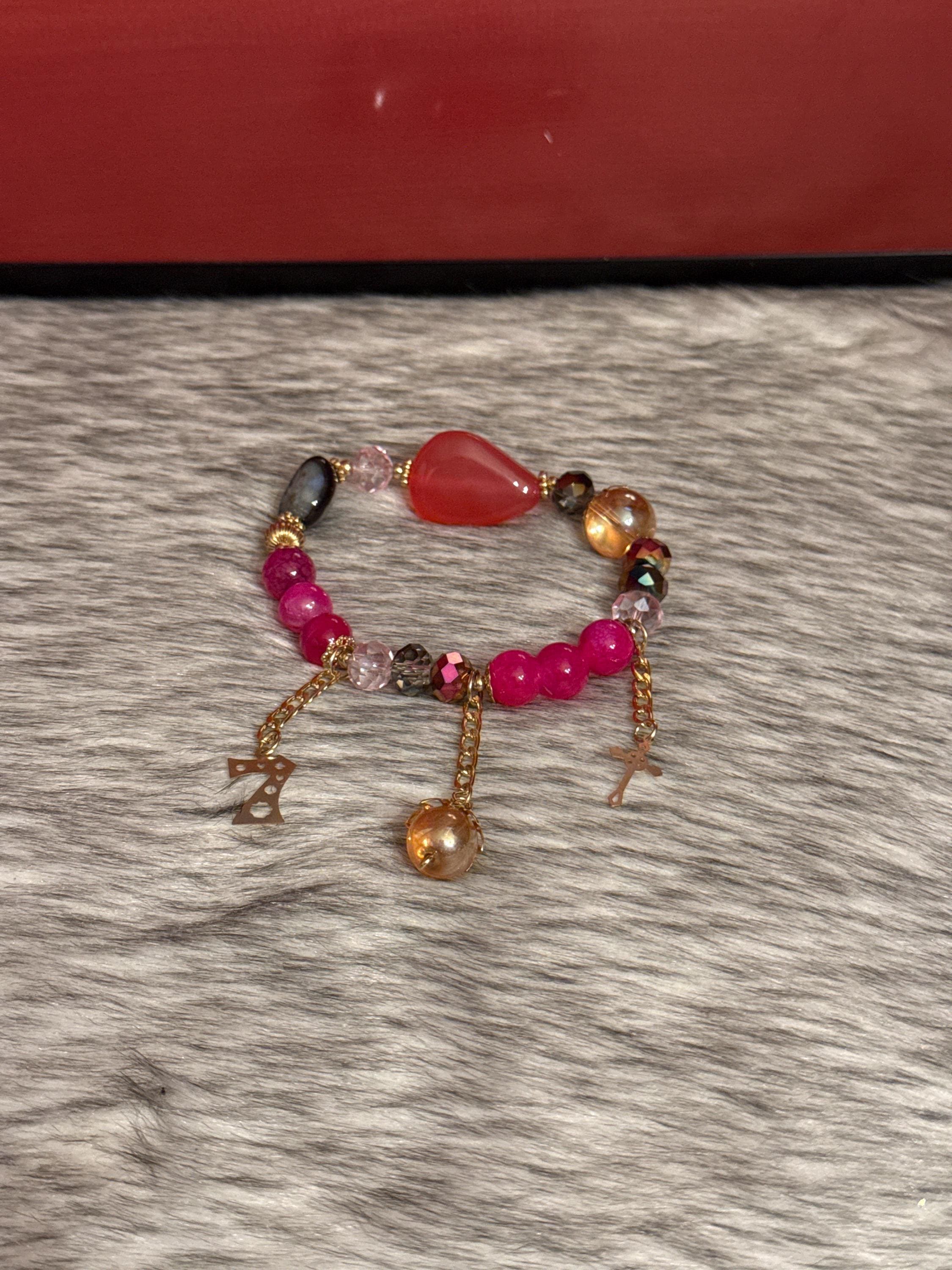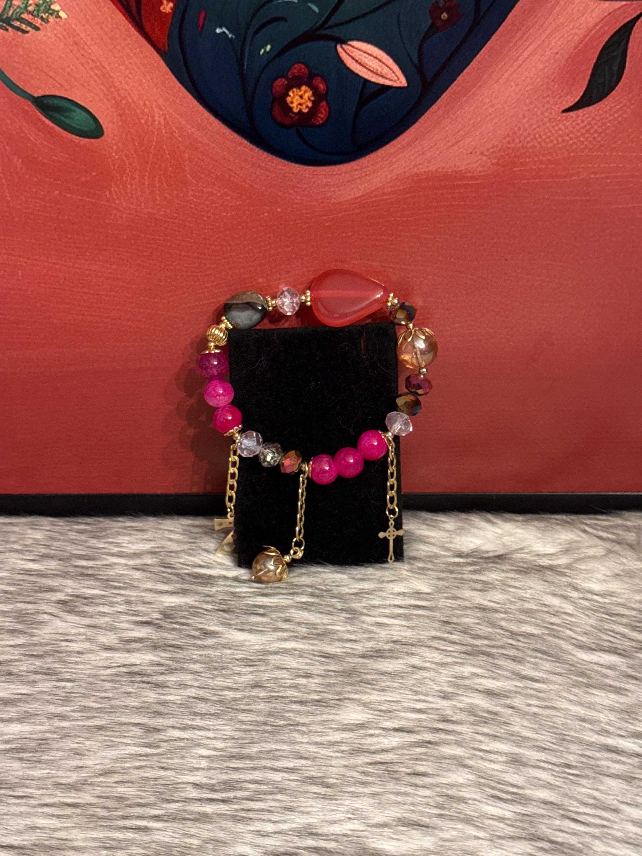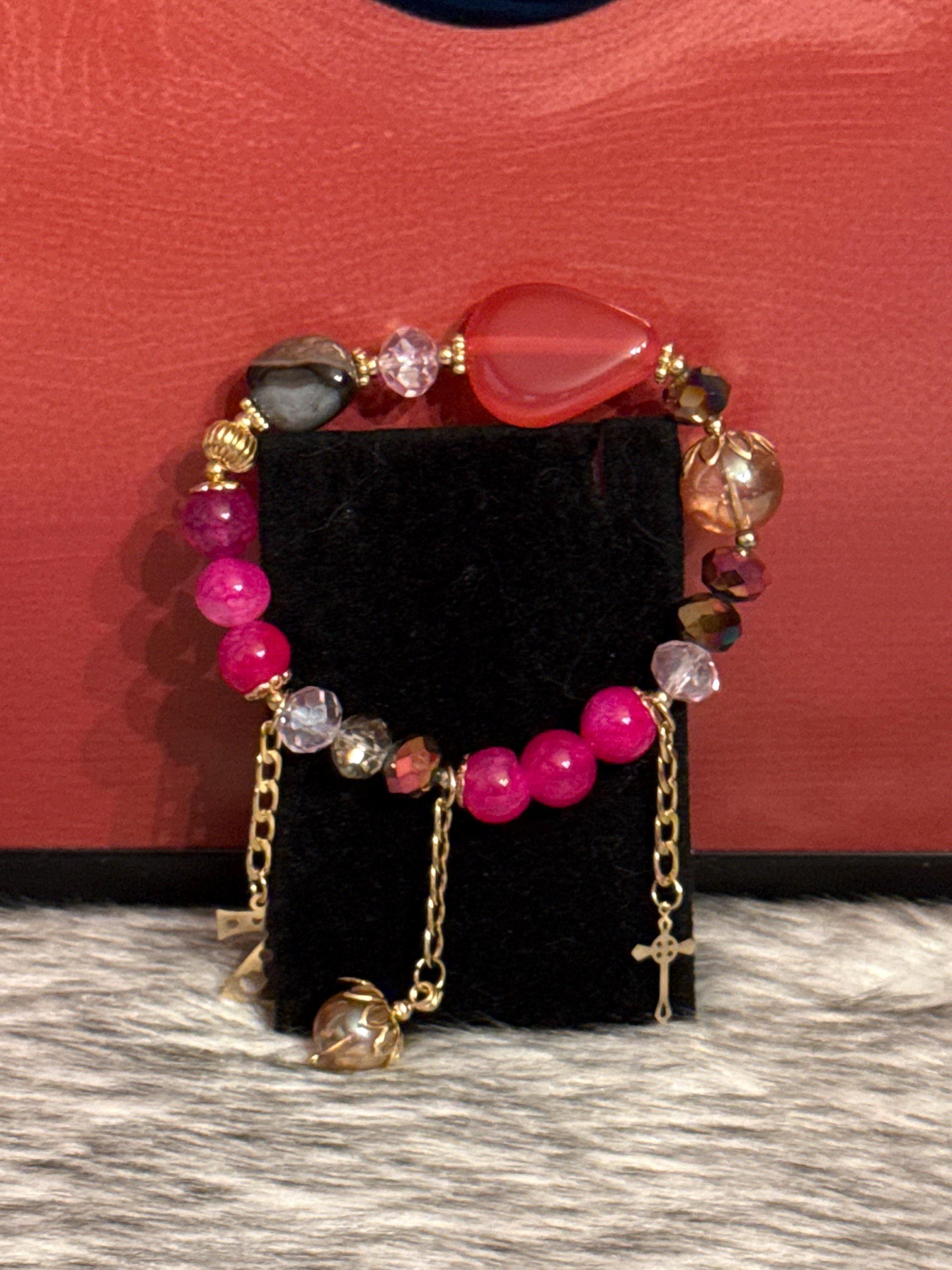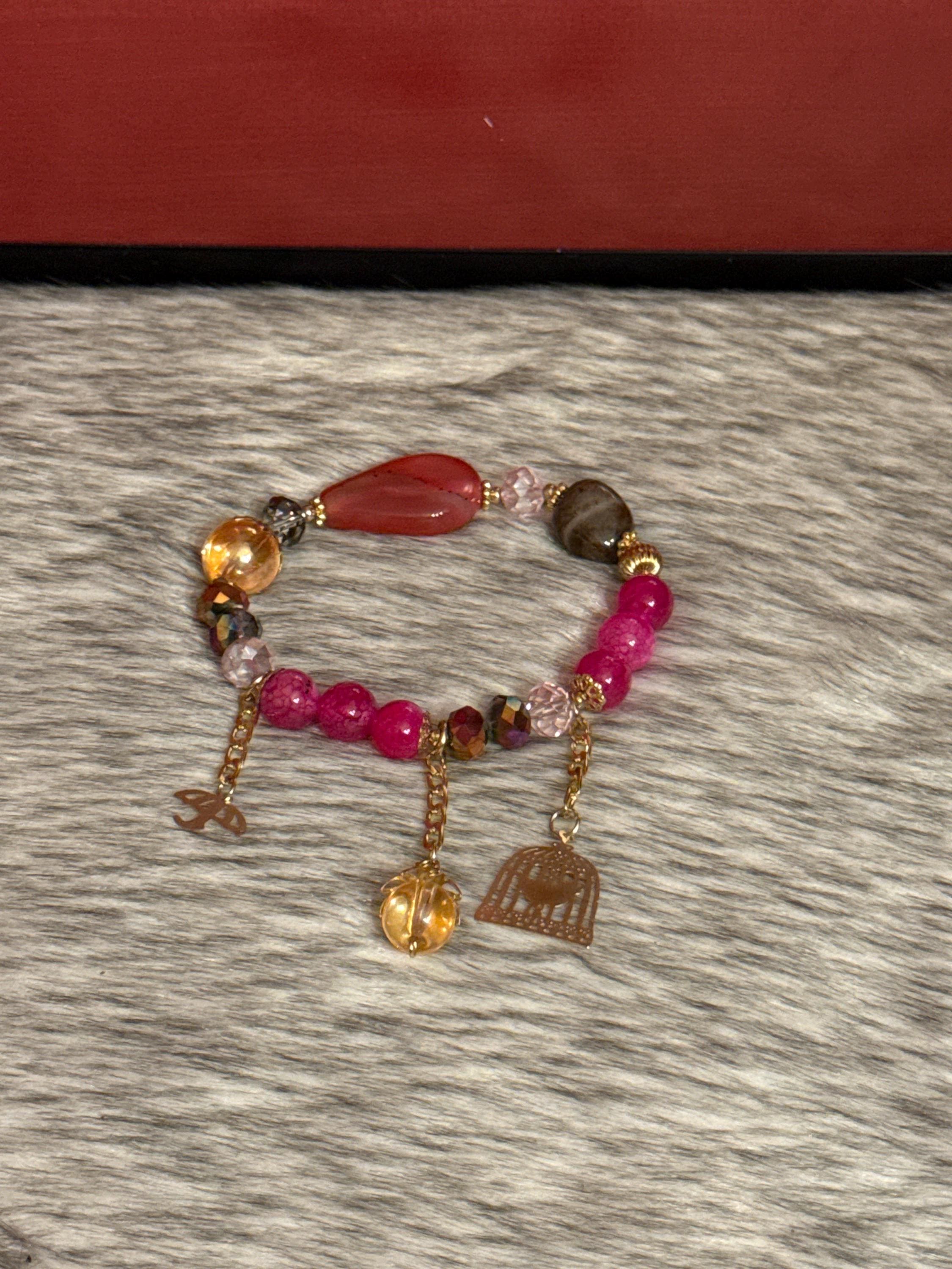 Beautiful handmade Gypsy bracelet made with Czech crystals, natural agate stones and 14k gold plated pendants, Mexican craftsmanship.